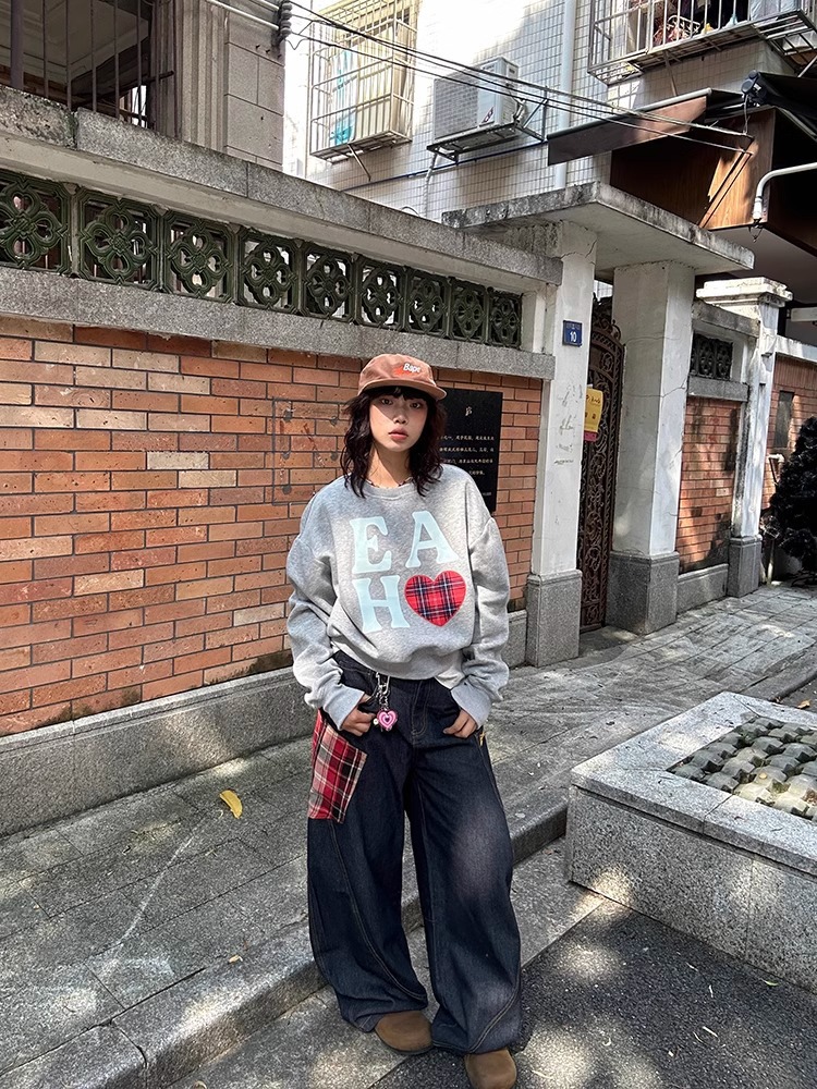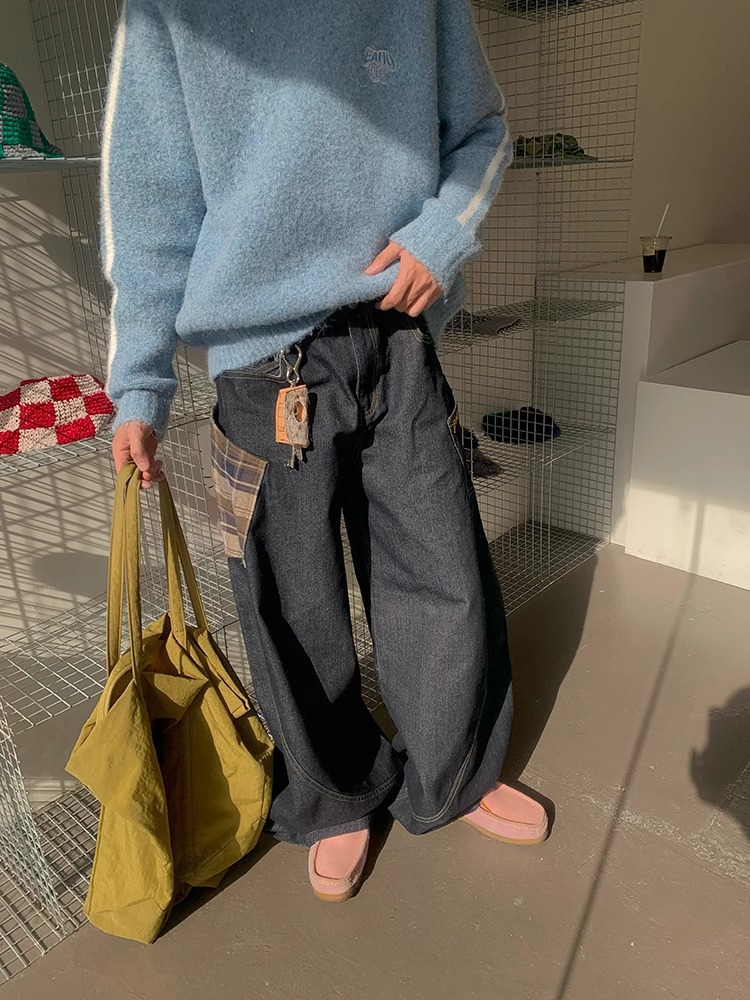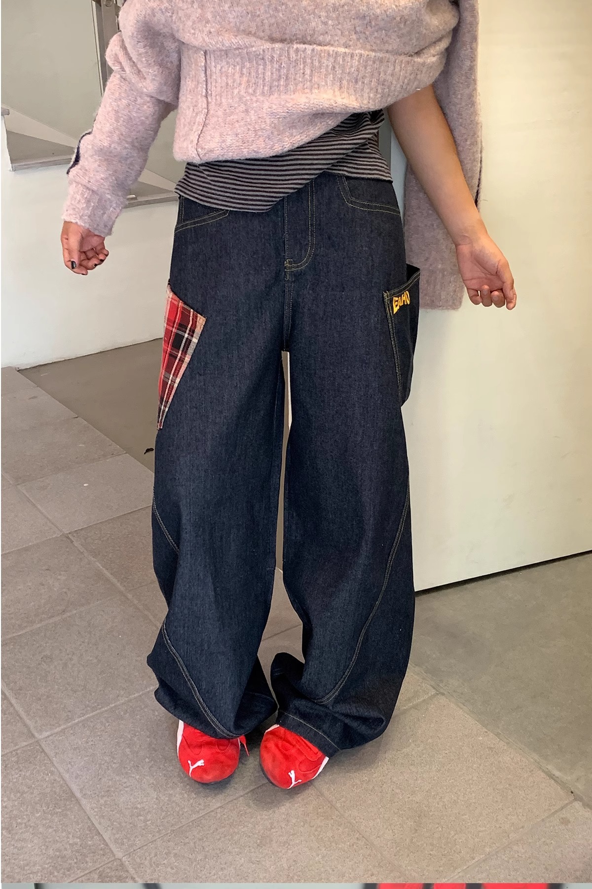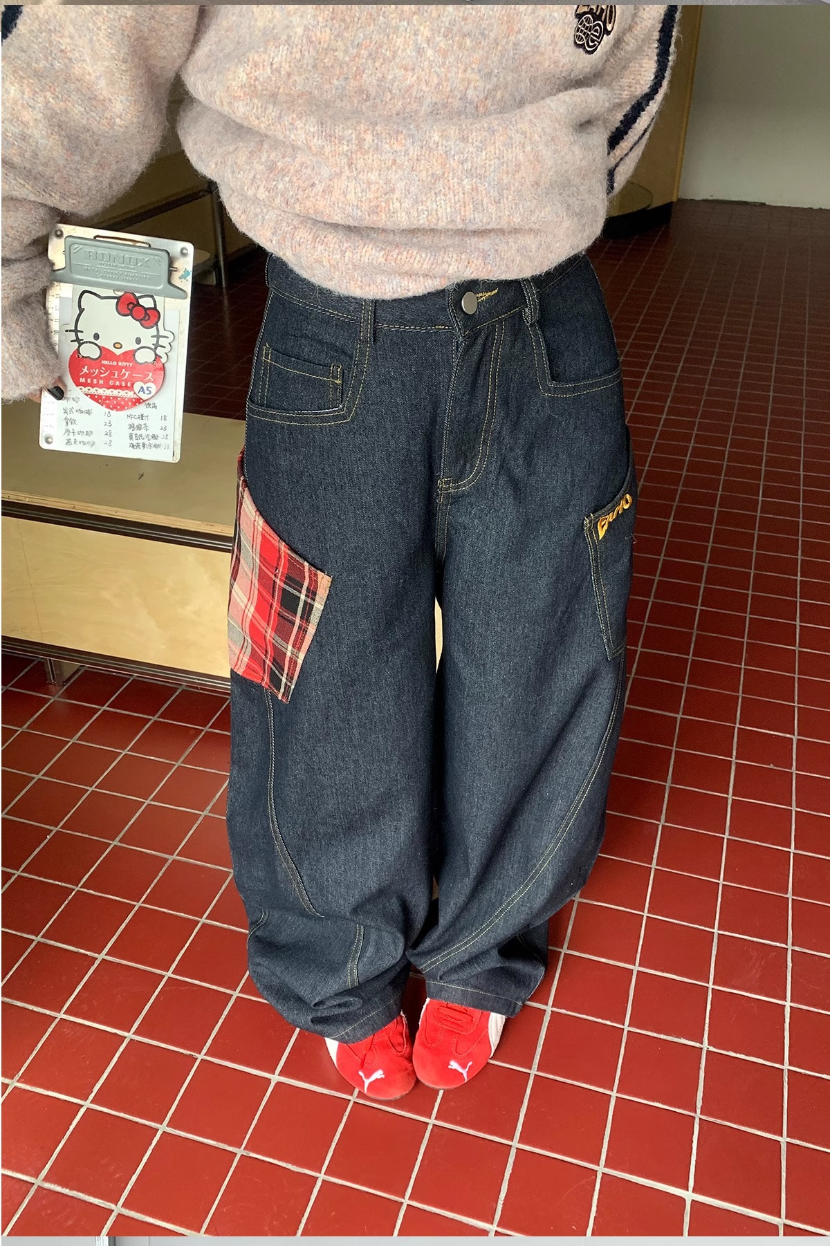미국 스타일의 격자 무늬 바느질 세탁 청바지 남성 봄과 가을 새로운 느슨한 패셔너블 캐주얼 와이드 레그 마체테 롱 팬츠스토어 가기