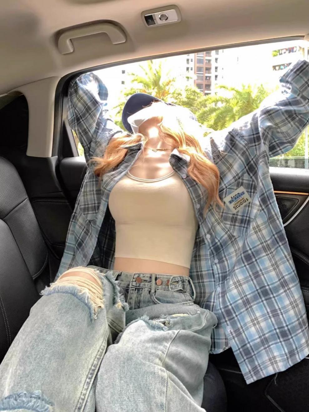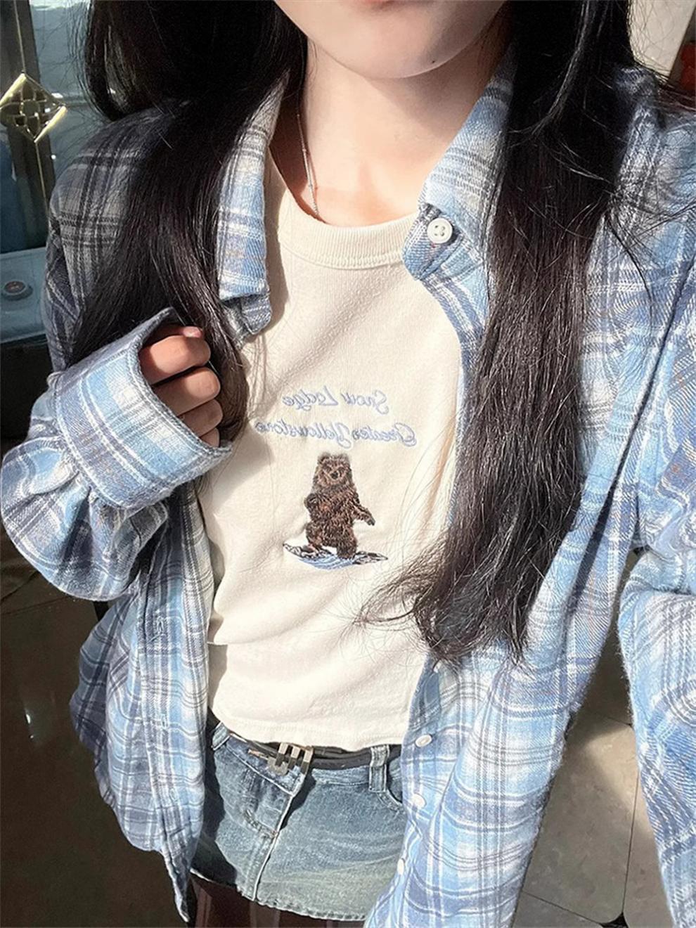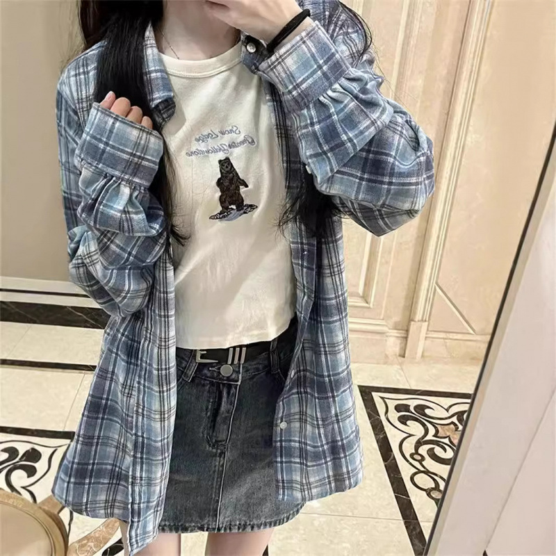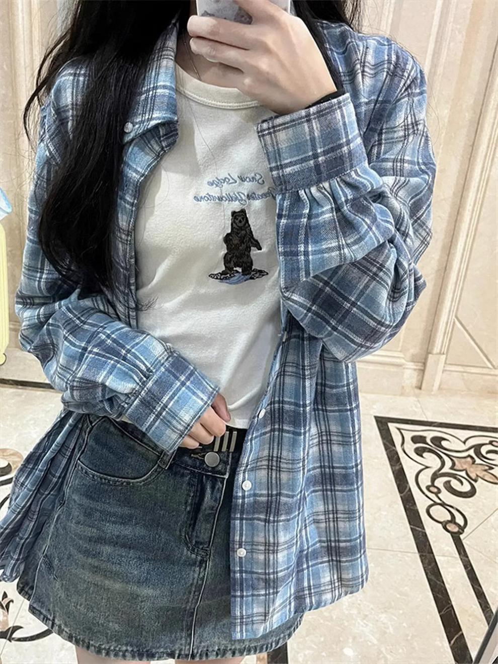 여성용 아메리칸 레트로 체크 무늬 셔츠 탑, 가을 루즈 캐주얼 중간 길이 긴팔 기모 셔츠 재킷스토어 가기