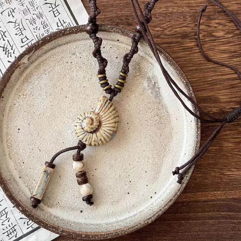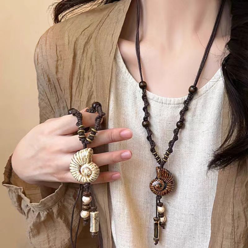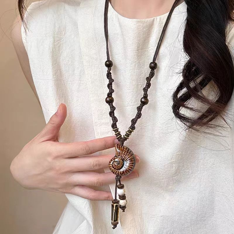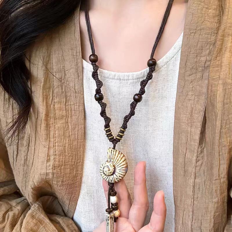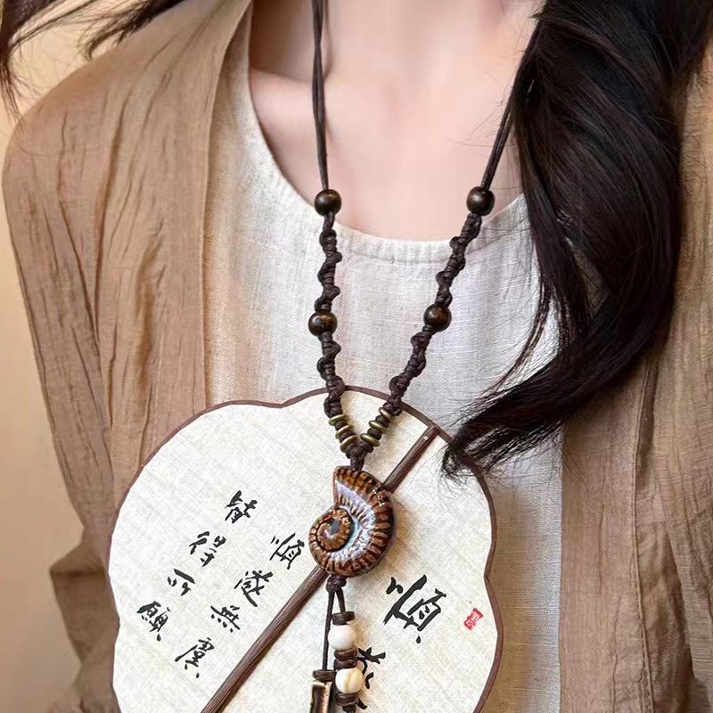 새로운 중국 스타일 세라믹 콘치 천연 석재 목걸이 여성용 빈티지 민족 스타일 목 액세서리 가을과 겨울 긴 모직 체인스토어 가기