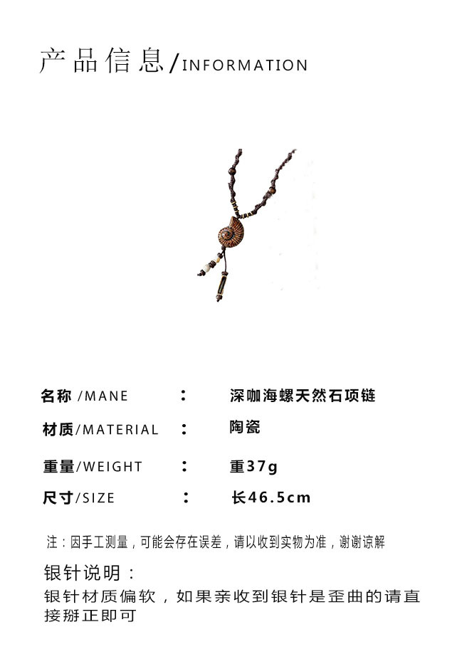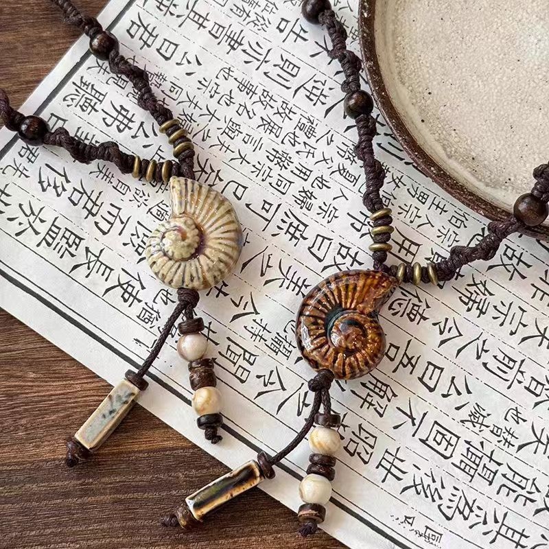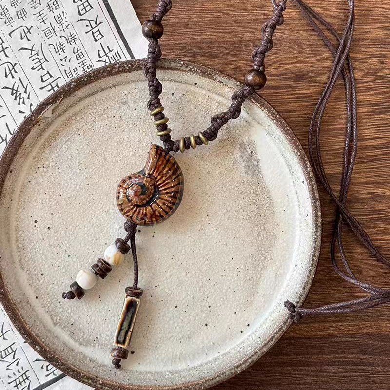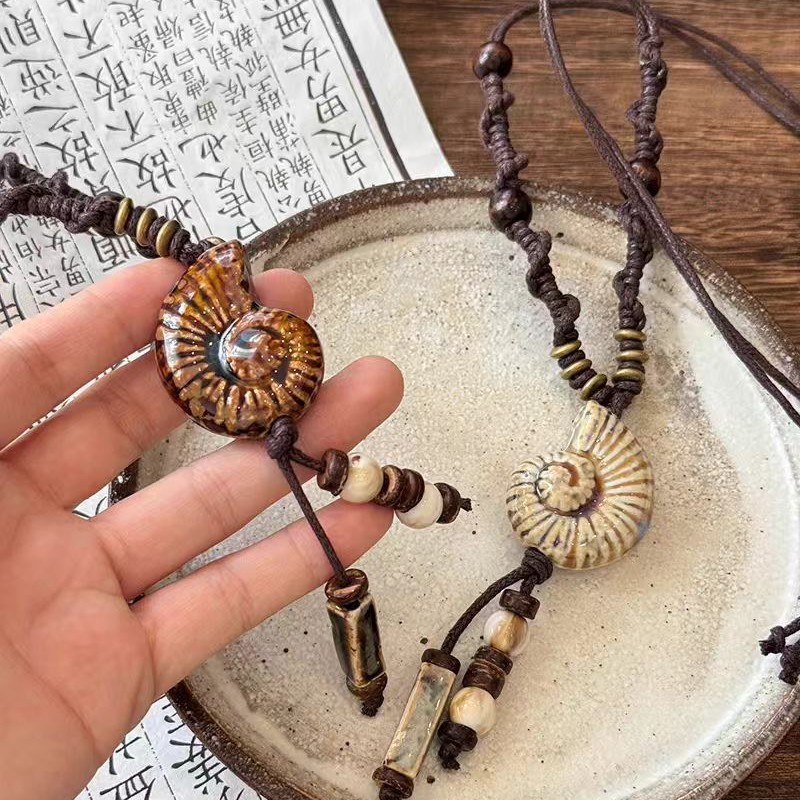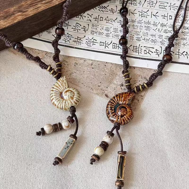 새로운 중국 스타일 세라믹 콘치 천연 석재 목걸이 여성용 빈티지 민족 스타일 목 액세서리 가을과 겨울 긴 모직 체인스토어 가기