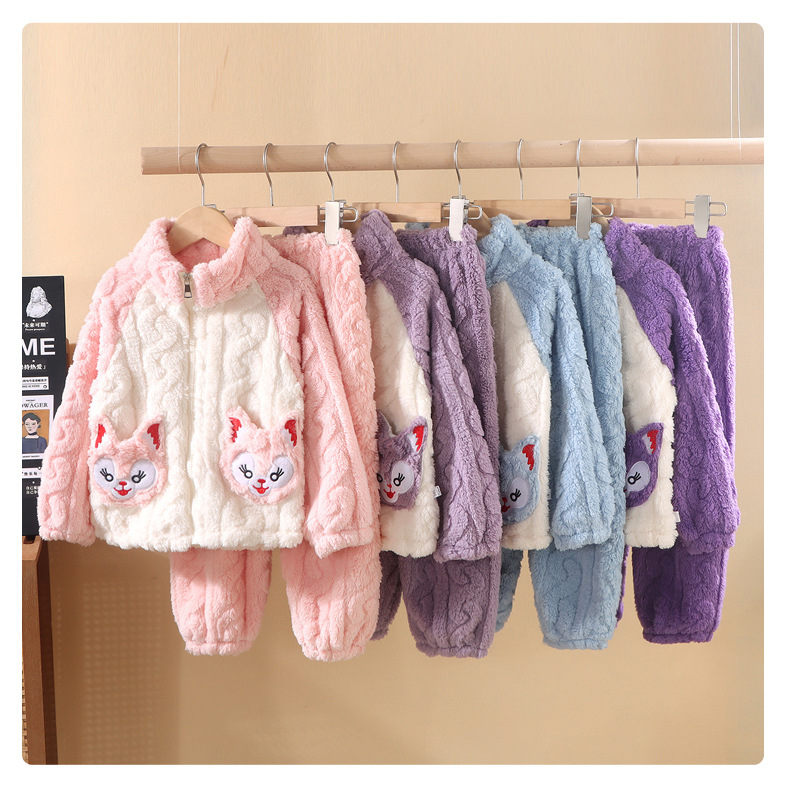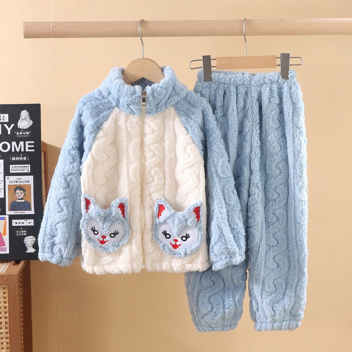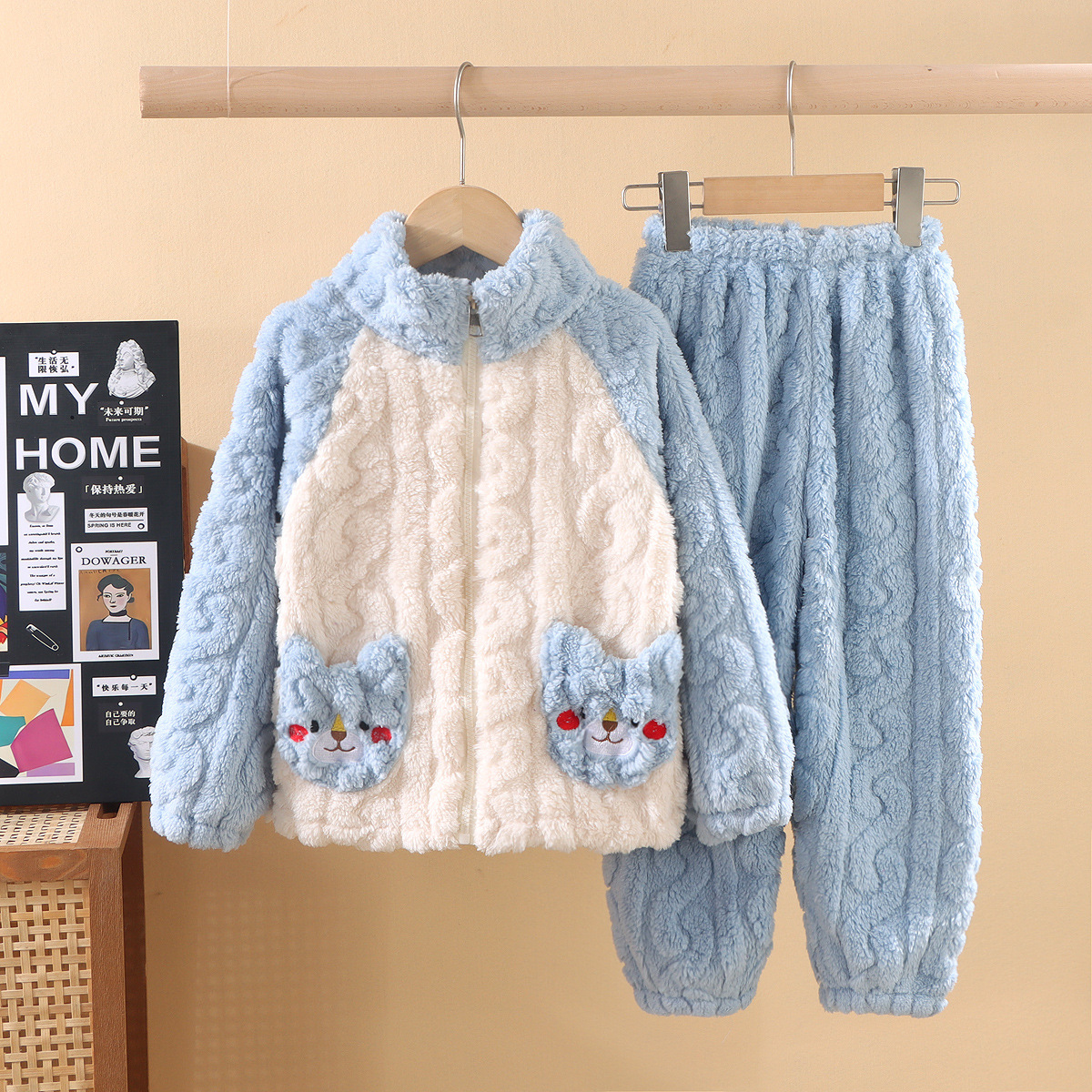 가을 겨울 남아 및 여아용 아동용 잠옷 세트, 양면 벨벳 플러스 벨벳 두꺼운 중대형 아동용 지퍼 산호 벨벳 가정복스토어 가기