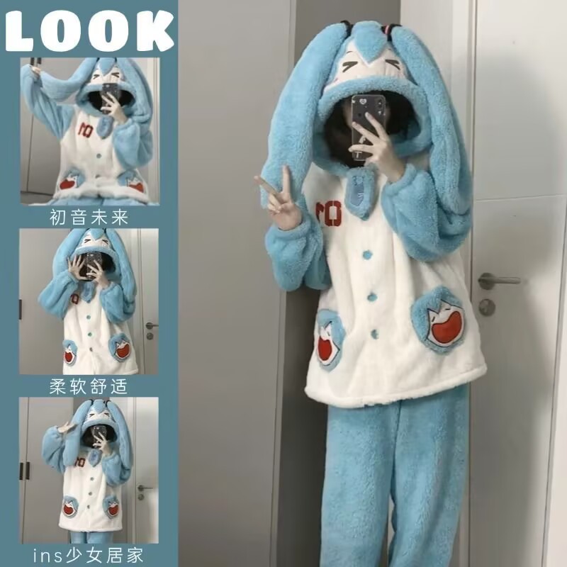 2025 새로운 귀여운 하츠네 미쿠 잠옷 여성 겨울 산호 벨벳 만화 두꺼운 플란넬 홈웨어 세트스토어 가기