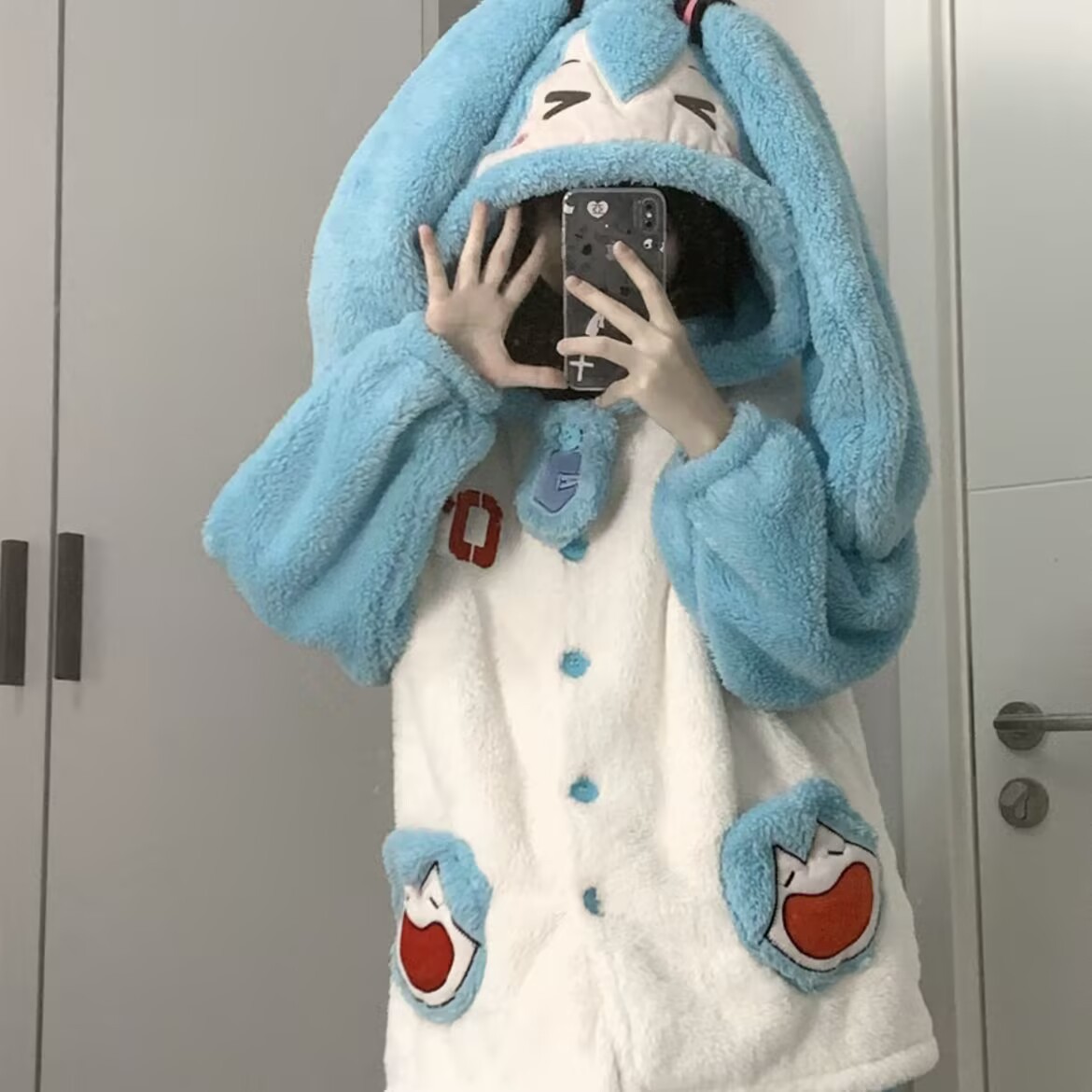 2025 새로운 귀여운 하츠네 미쿠 잠옷 여성 겨울 산호 벨벳 만화 두꺼운 플란넬 홈웨어 세트