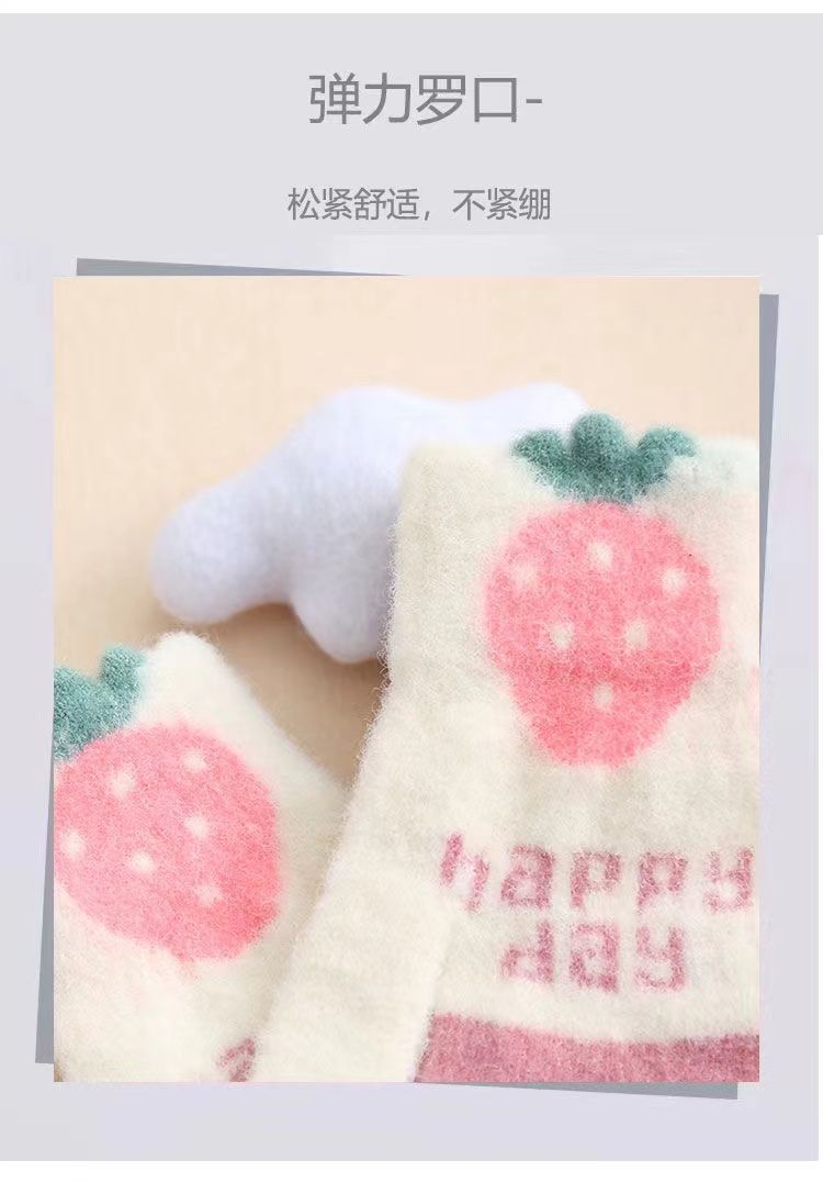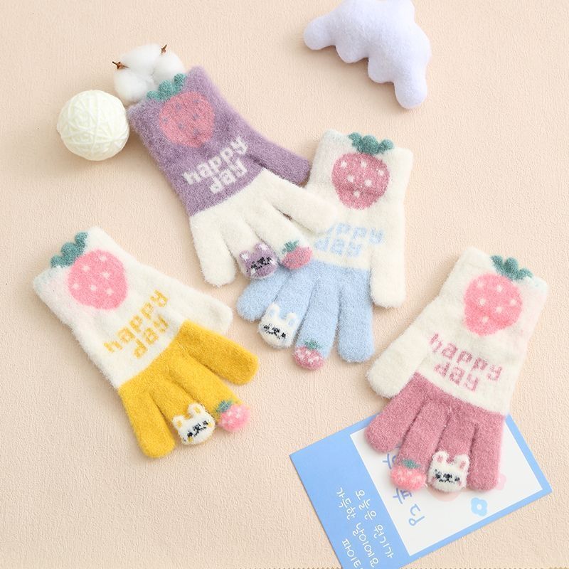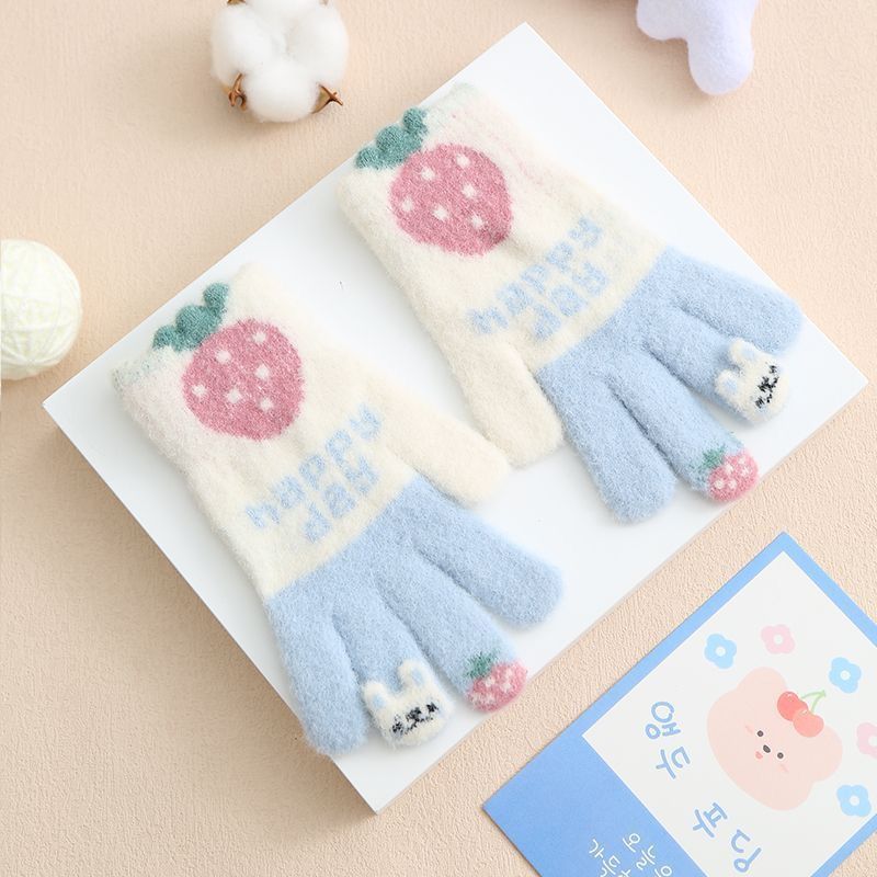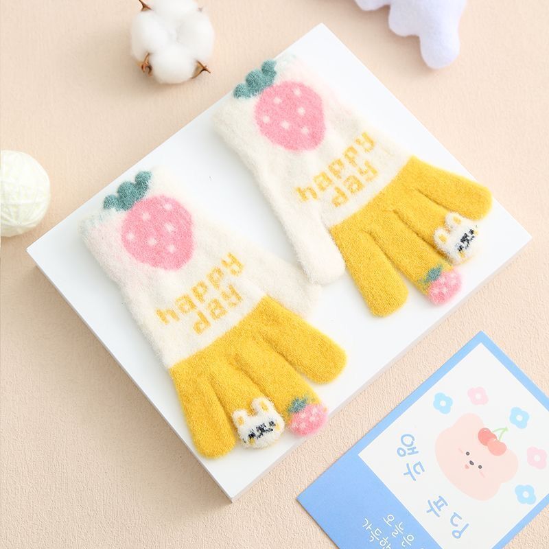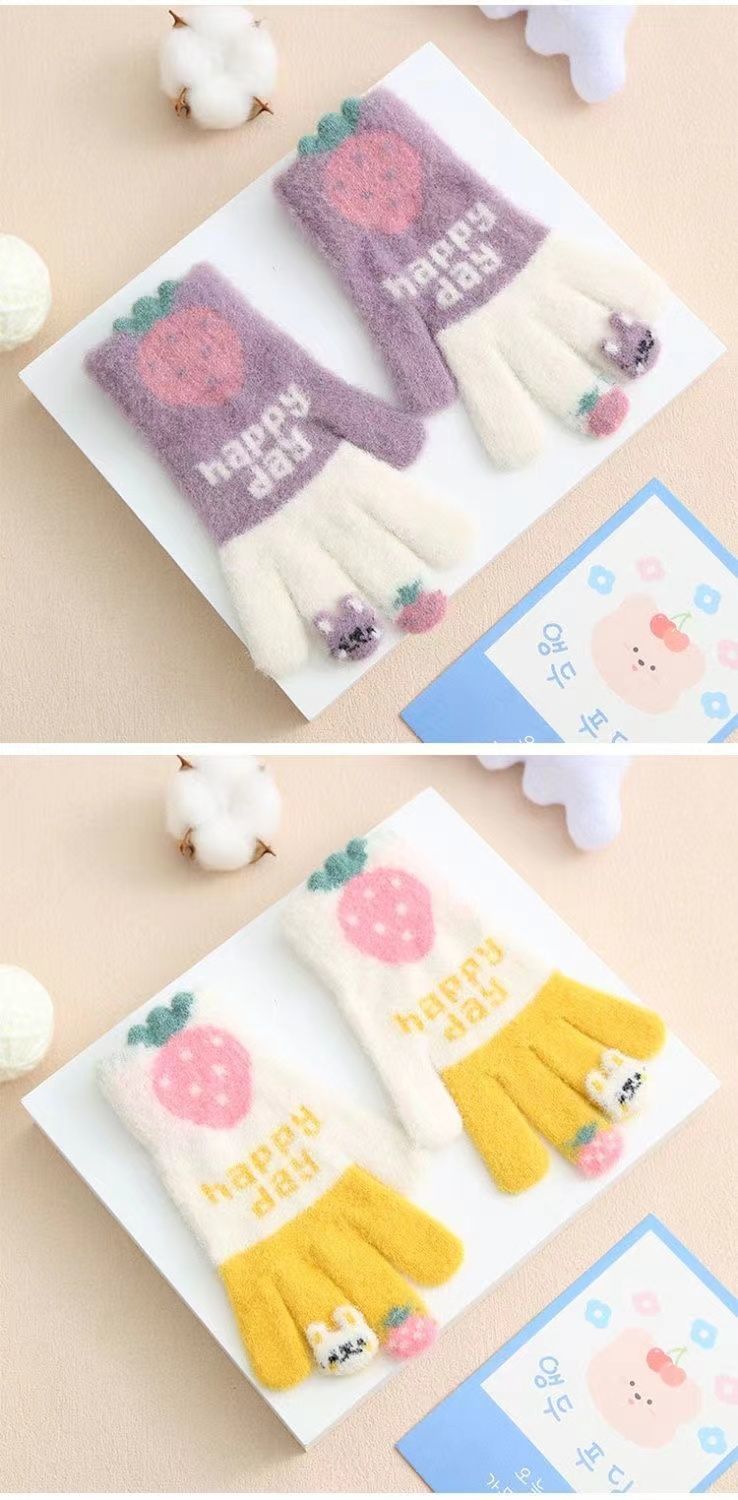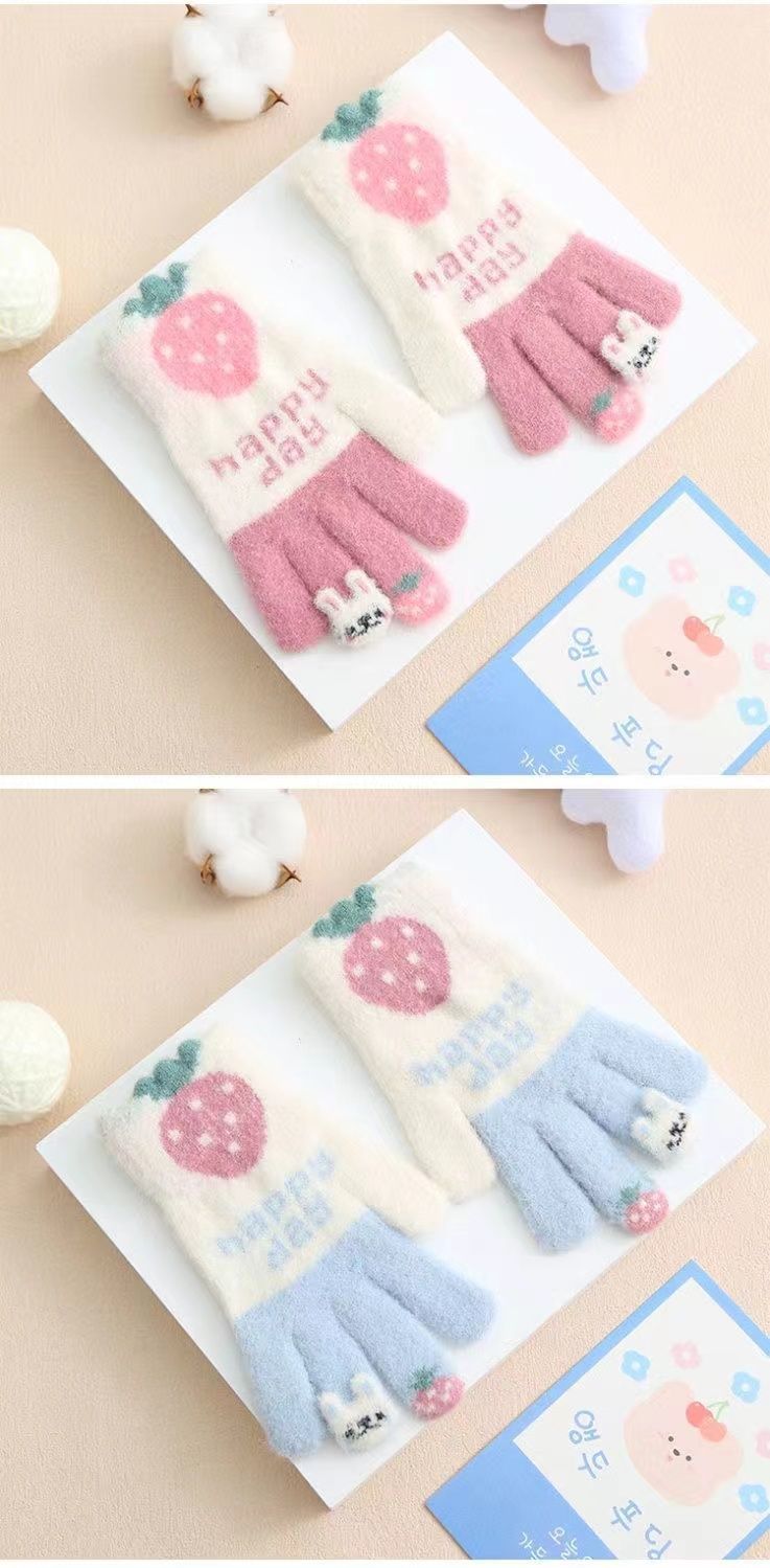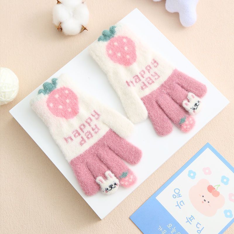 어린이 가을과 겨울 만화 장갑 소녀 기모 두꺼운 따뜻한 손가락 딸기 니트 감기 방지 다섯 손가락 장갑