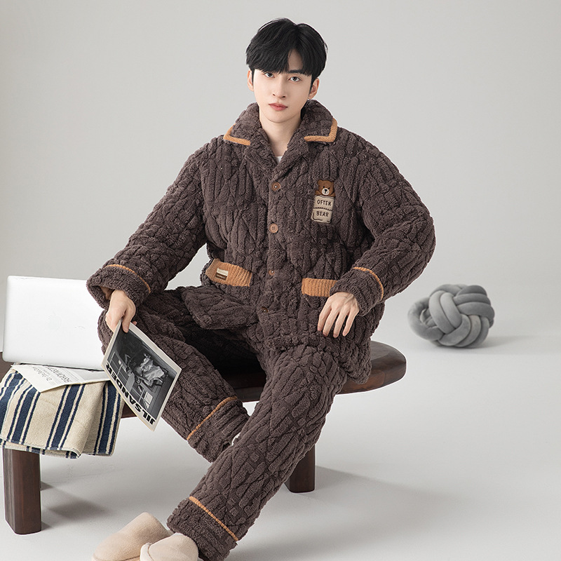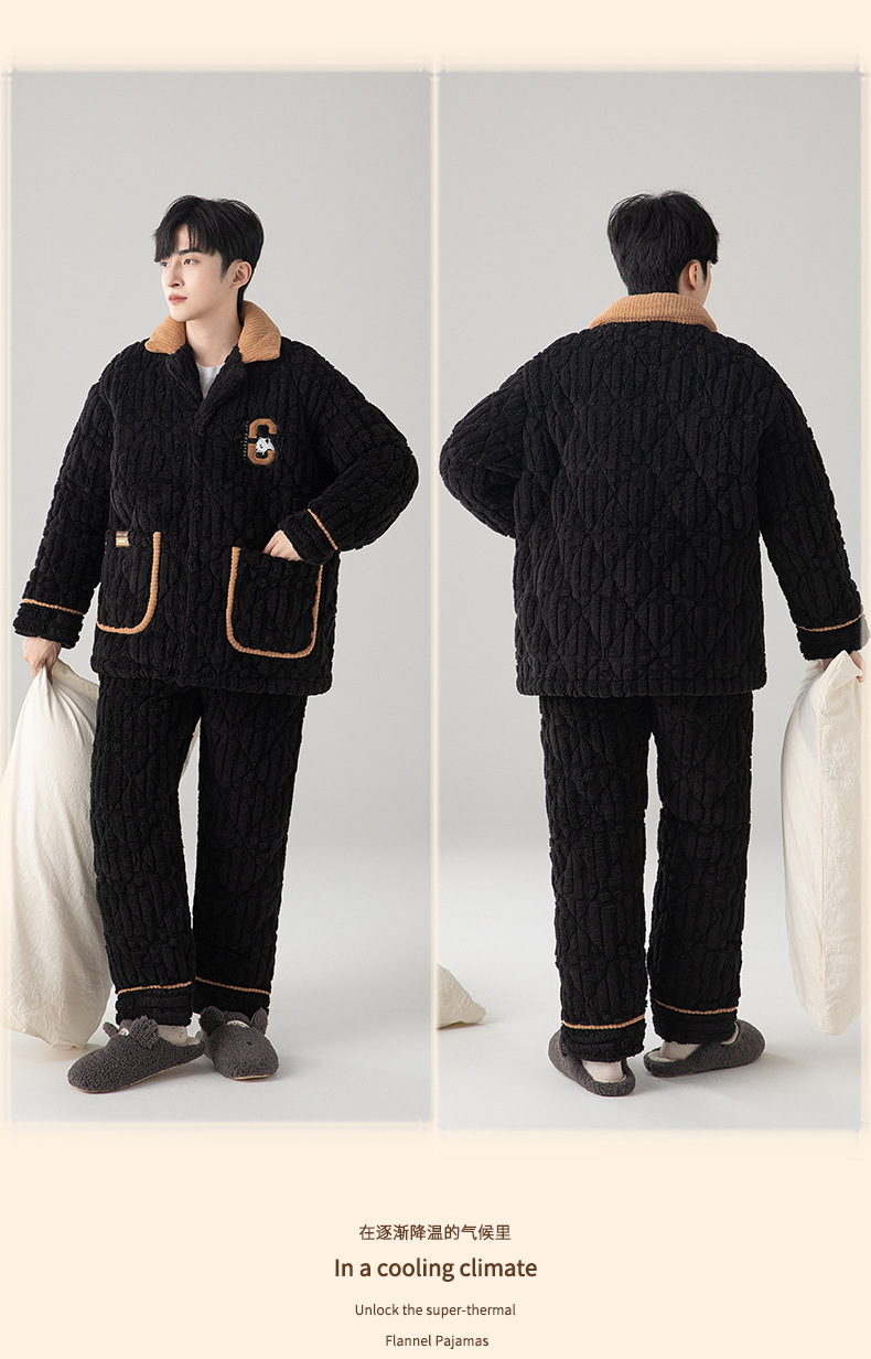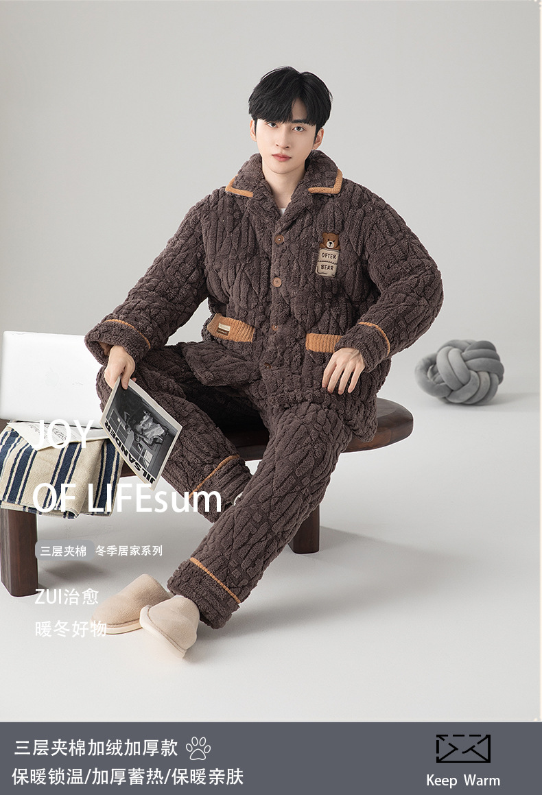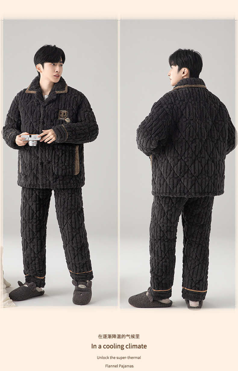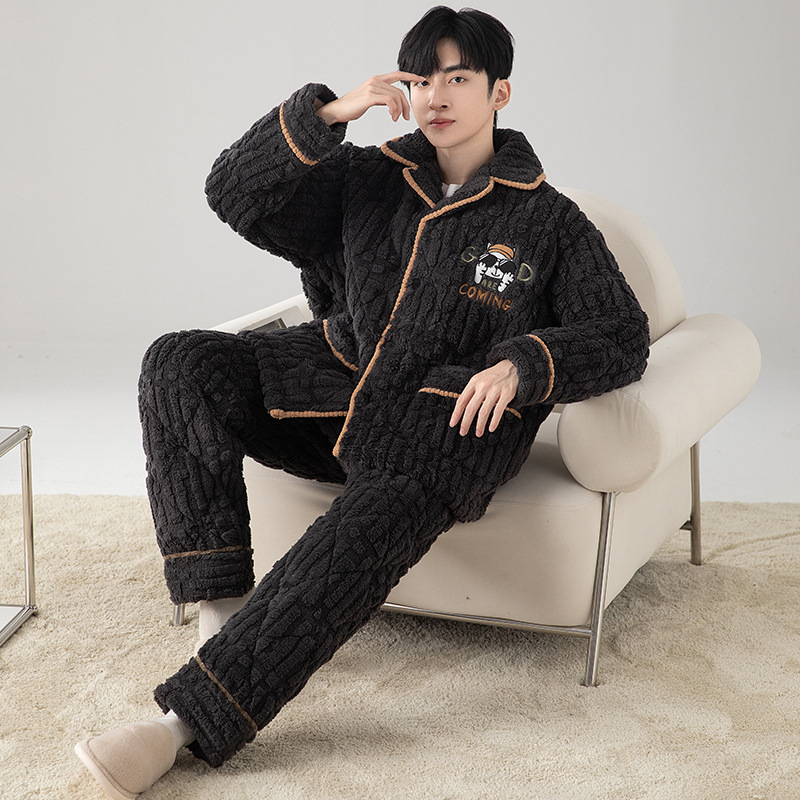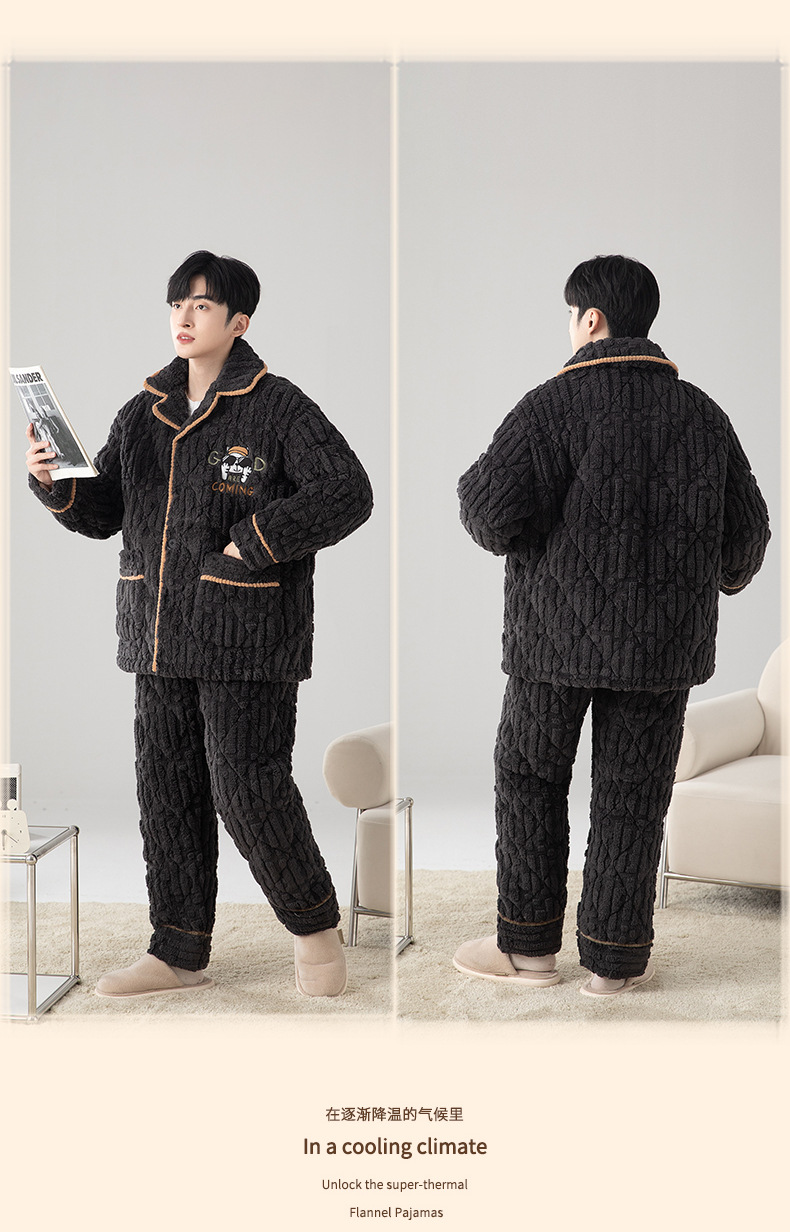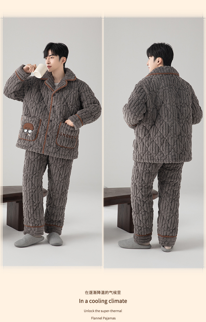 산호 양털 남성 퀼트 파자마 겨울 3 층 따뜻한 플러스 사이즈 간단한 캐주얼 남성 홈 의류 2 피스 세트
