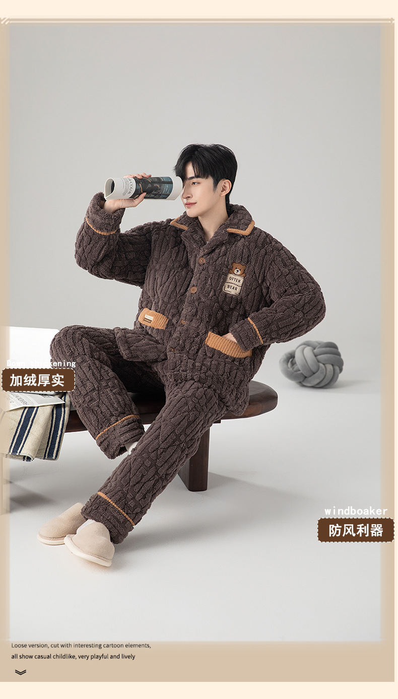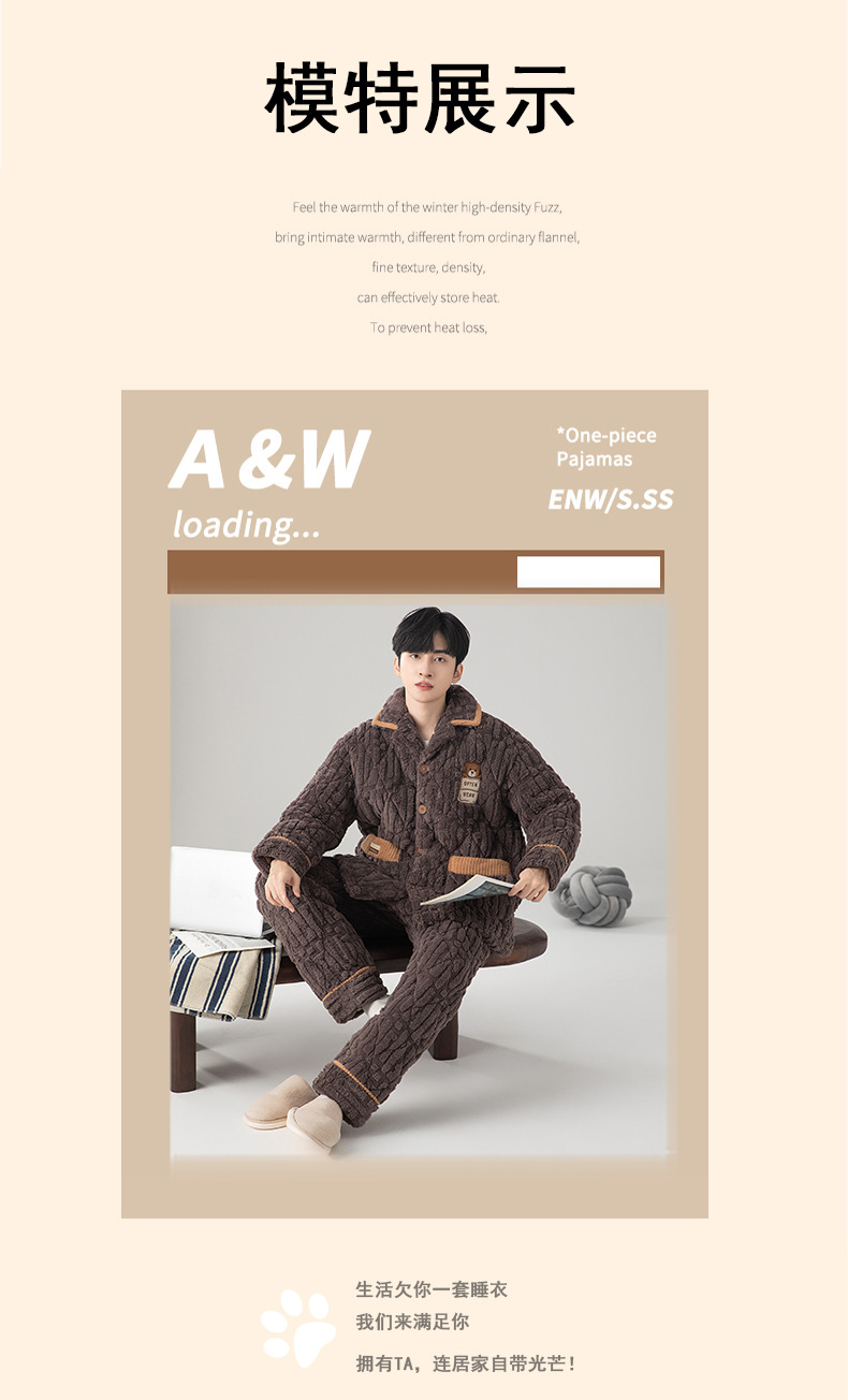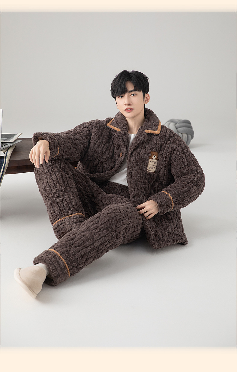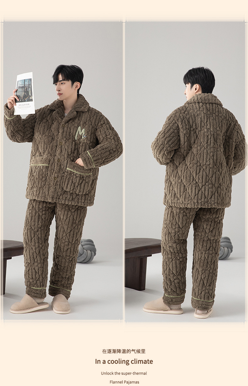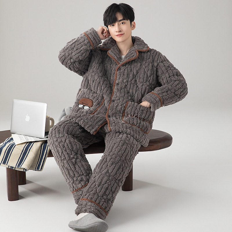 산호 양털 남성 퀼트 파자마 겨울 3 층 따뜻한 플러스 사이즈 간단한 캐주얼 남성 홈 의류 2 피스 세트스토어 가기