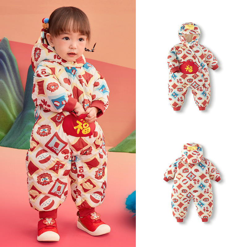 베이비 다운 재킷, 오리 다운 점프 슈트, 새해 복 많이 받으세요 드레스, 영유아 겨울 따뜻하고 세련된 중국 빨간색 외출복