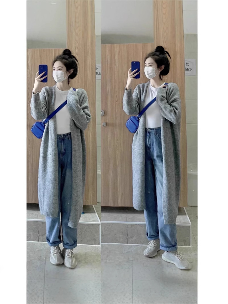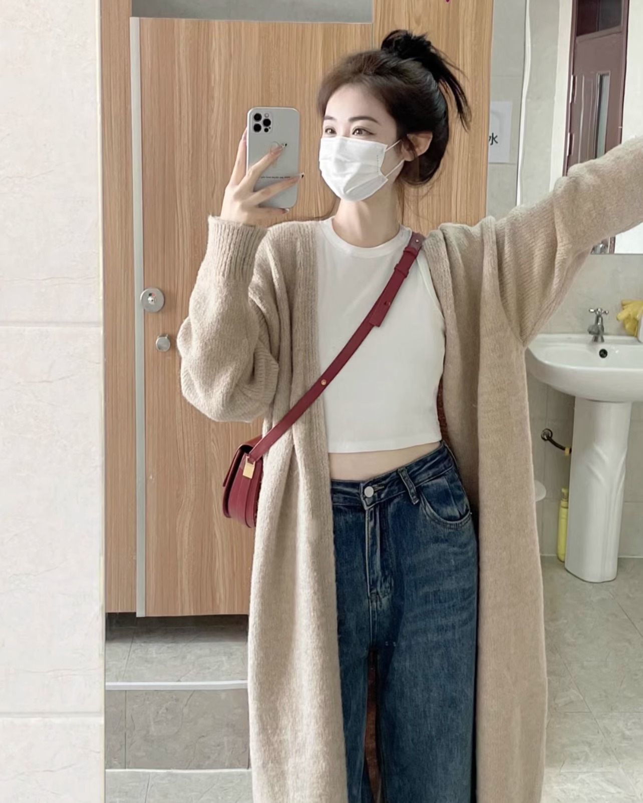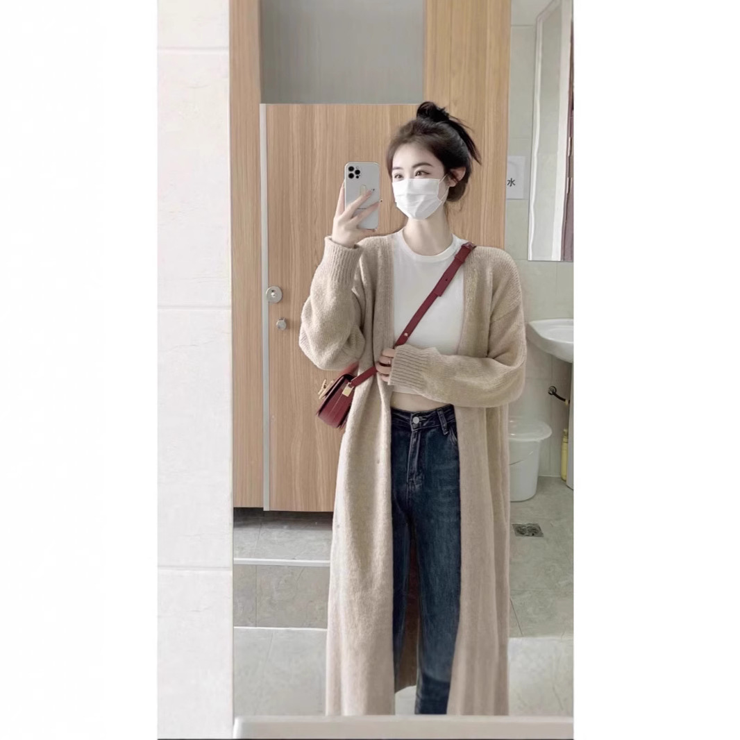 오트밀 니트 카디건 여성 최고급 가을과 겨울 복장 중간 길이의 스웨터 재킷 게으른 루즈스토어 가기