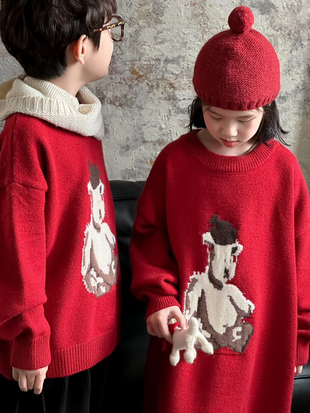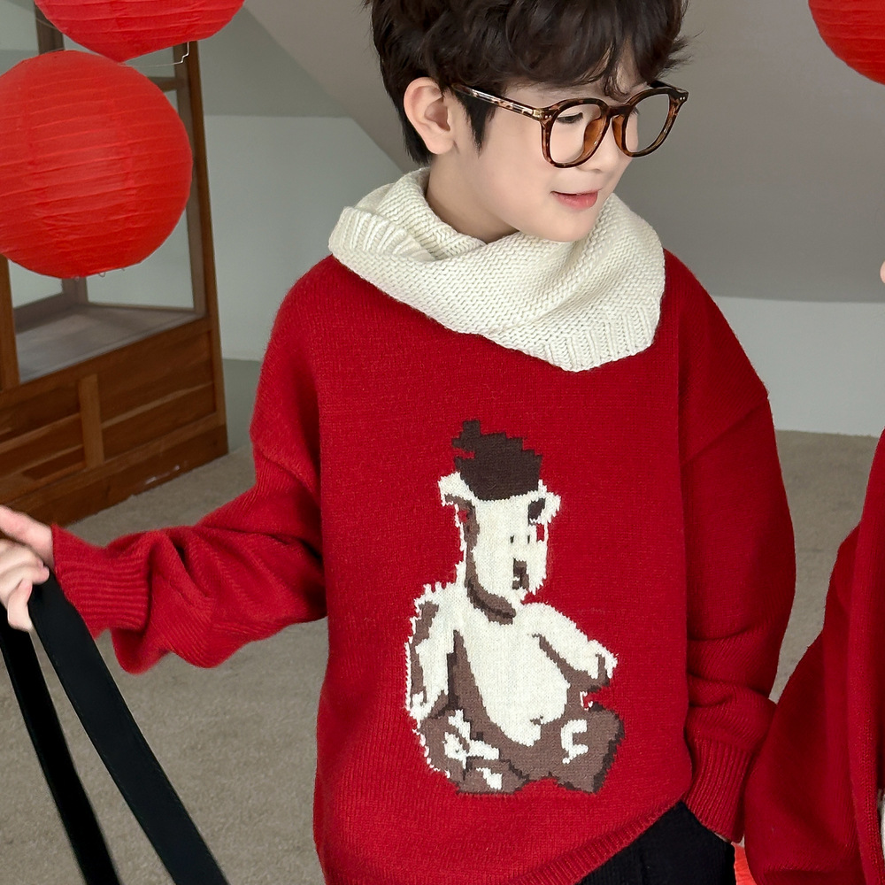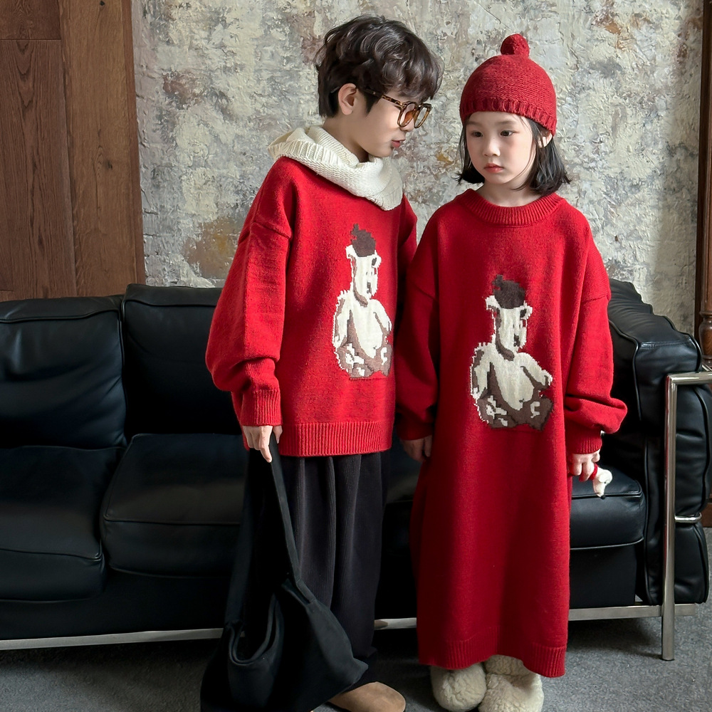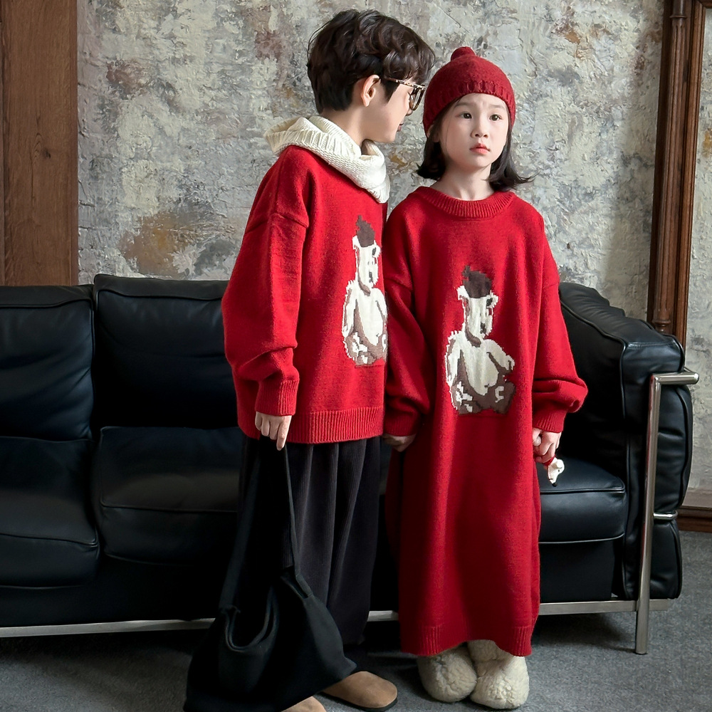 아동용 스웨터 2025 겨울 남녀 아동용 한국 스타일 곰돌이 모양 니트 상의 두꺼운 라운드넥 니트 형제자매룩 연말복스토어 가기
