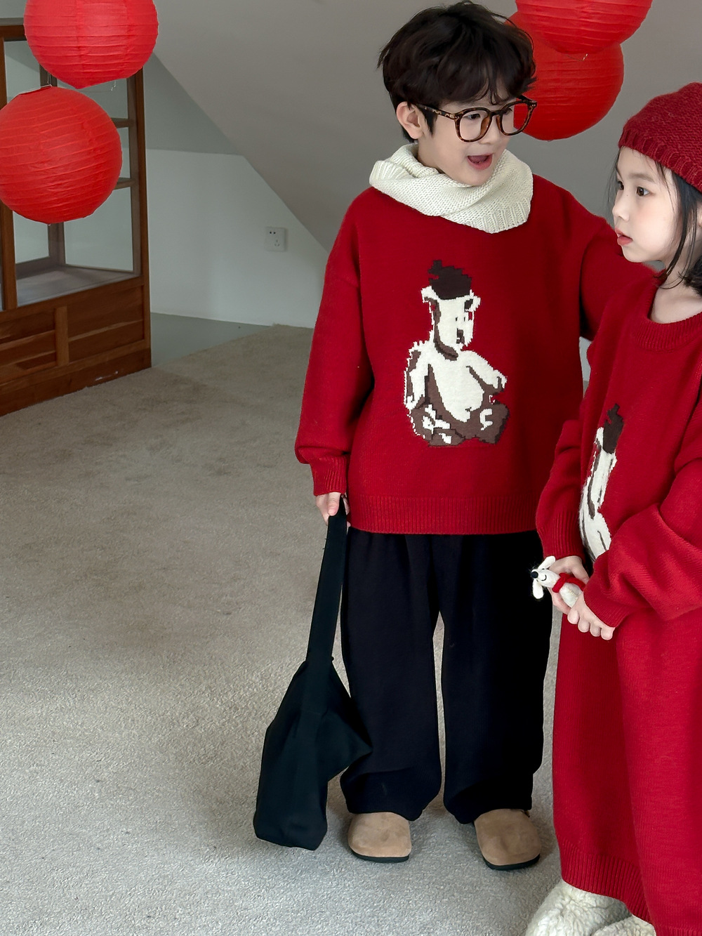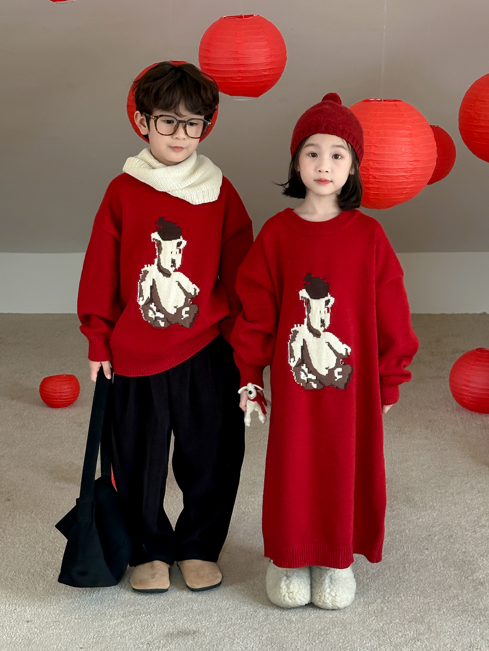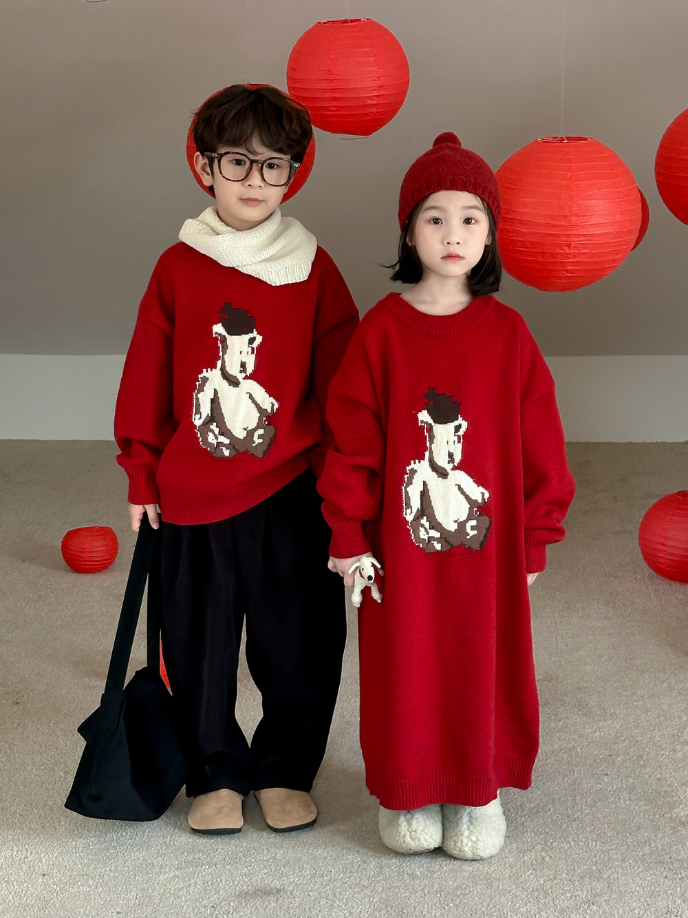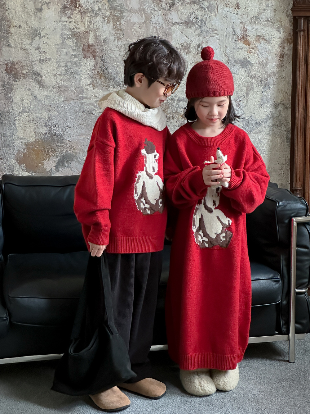 아동용 스웨터 2025 겨울 남녀 아동용 한국 스타일 곰돌이 모양 니트 상의 두꺼운 라운드넥 니트 형제자매룩 연말복스토어 가기