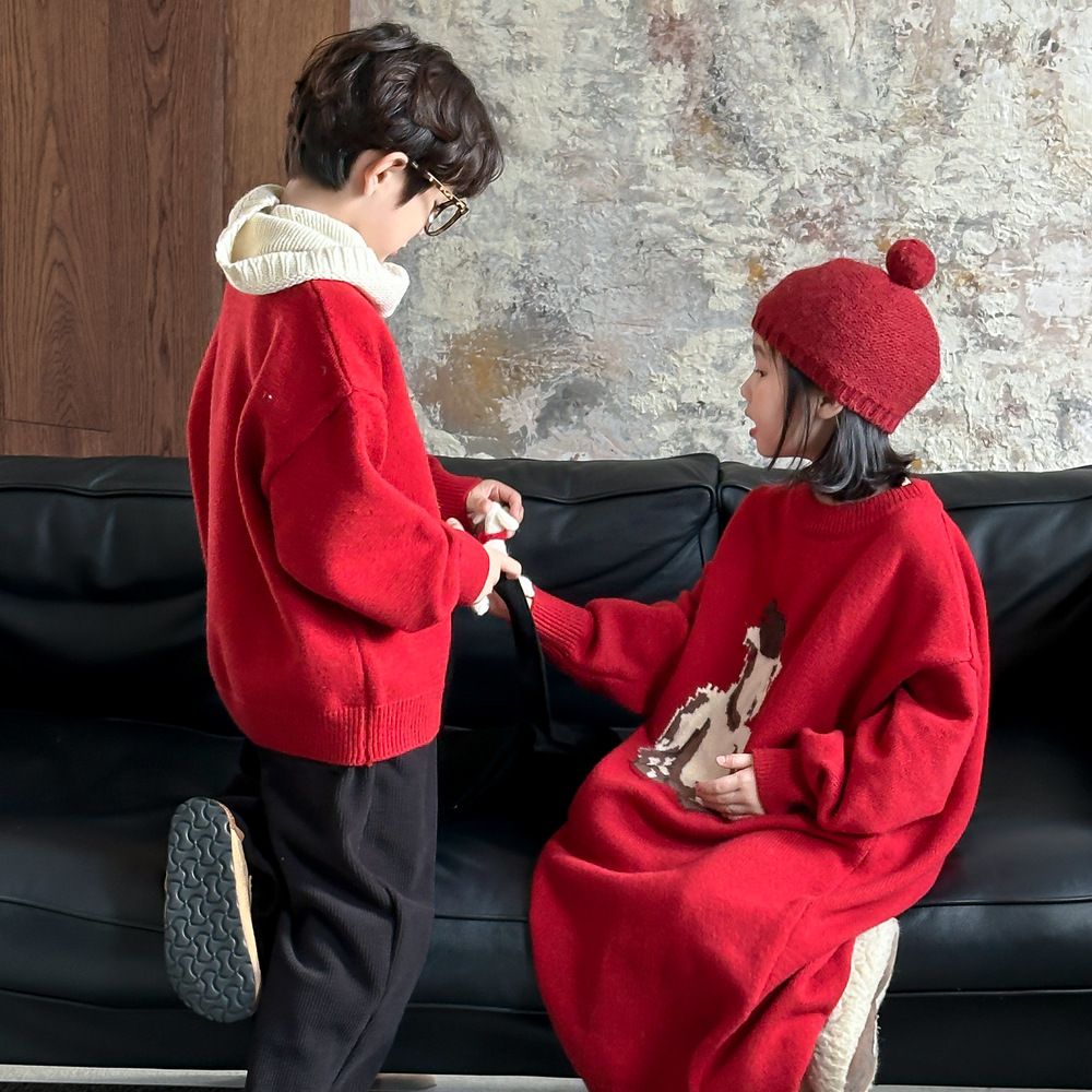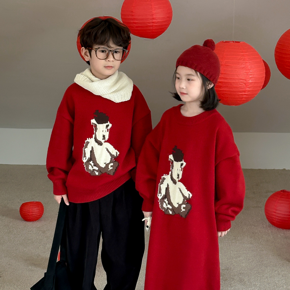 아동용 스웨터 2025 겨울 남녀 아동용 한국 스타일 곰돌이 모양 니트 상의 두꺼운 라운드넥 니트 형제자매룩 연말복