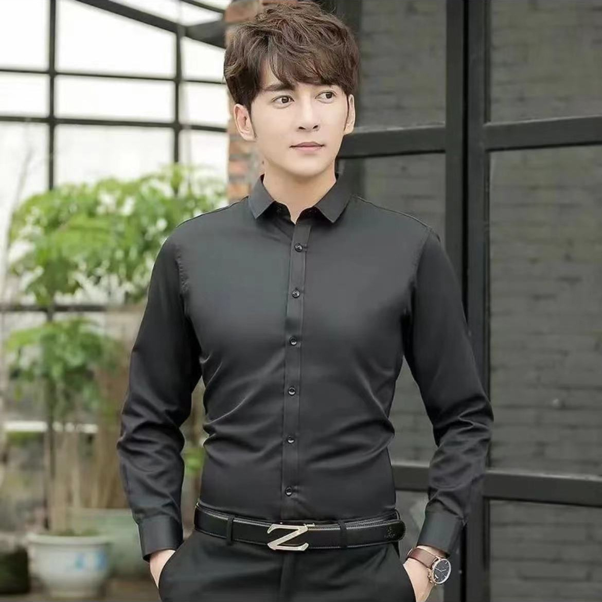 비즈니스 캐주얼 블랙 셔츠 봄과 가을 남성용 슬림 핏 한국 유행 수제 카디건 긴팔 옷깃 셔츠스토어 가기