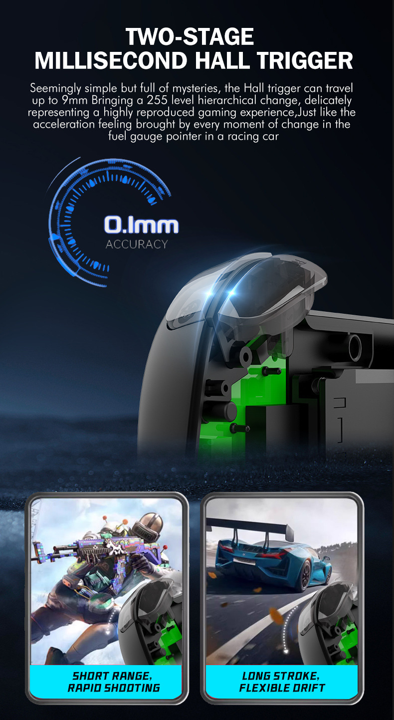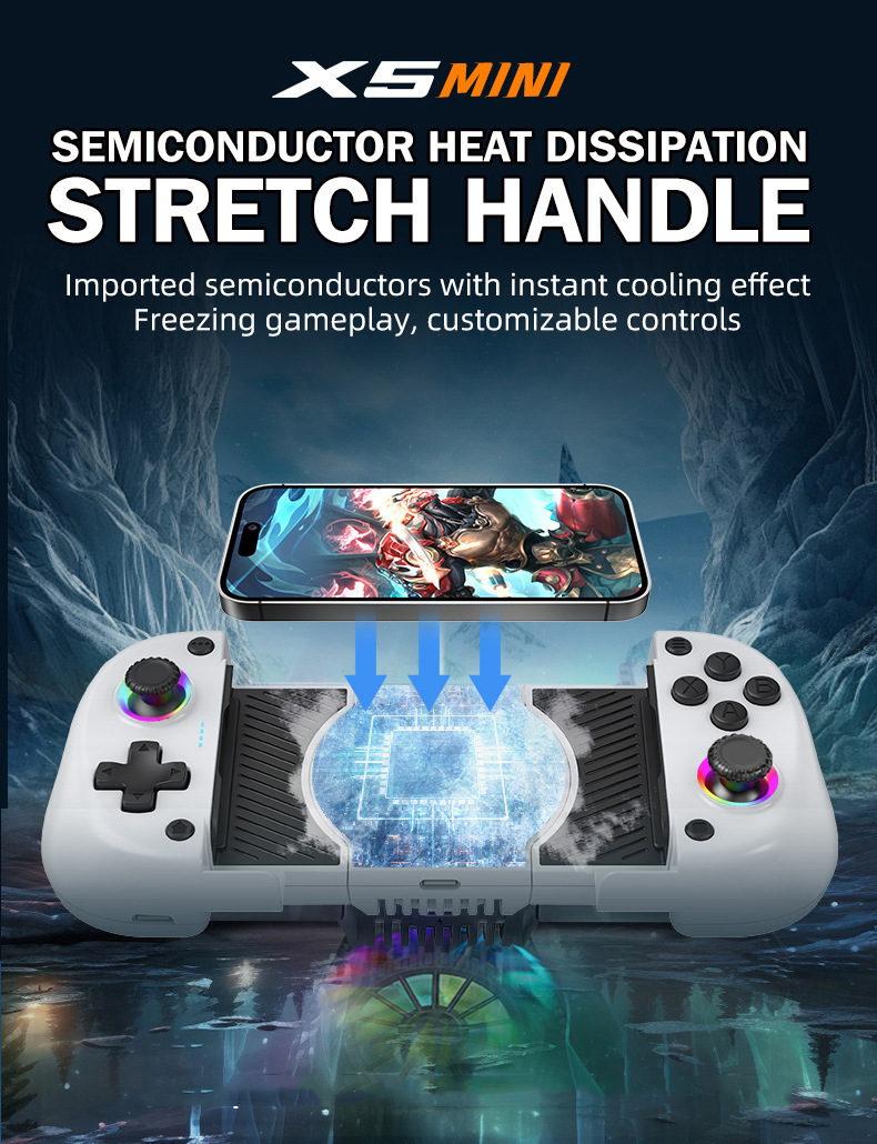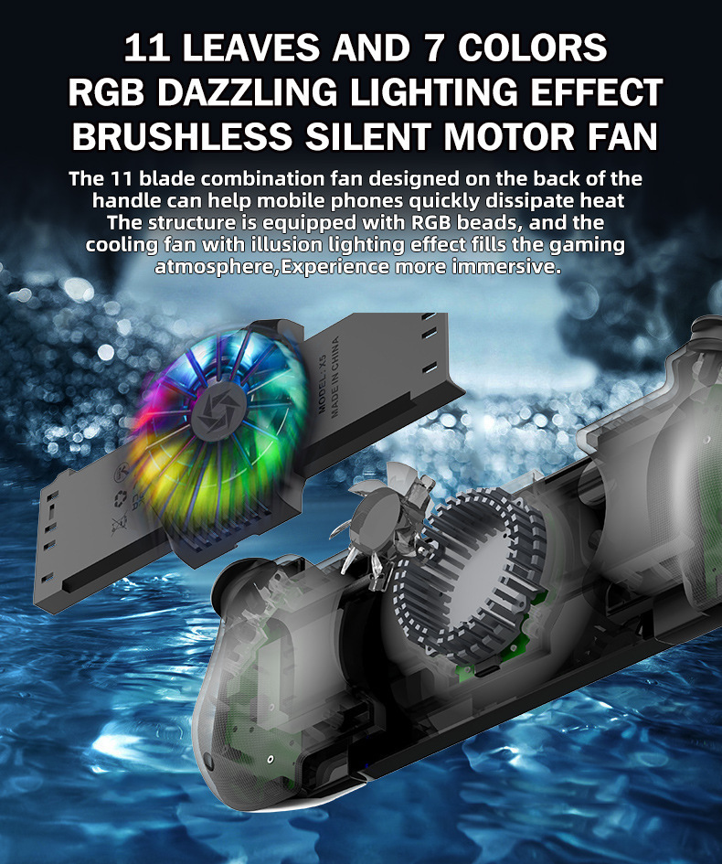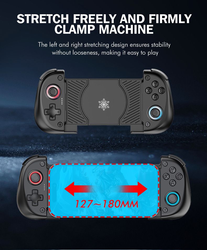 1.二合一散热风扇拉伸游戏手柄,本产品采用人体工学设计,手感舒适,操作灵敏,采用高端电子元器件组成。产品支持所有市场上型号的手机,同时具备自动识别功能。玩家在玩游戏过程中运行二合一散热风扇,彻底解决了玩游戏时手机发烫,手机电池寿命问题困扰,大大提高了游戏玩家在游戏中的体验和喜悦,增长了手机电池使用寿命。