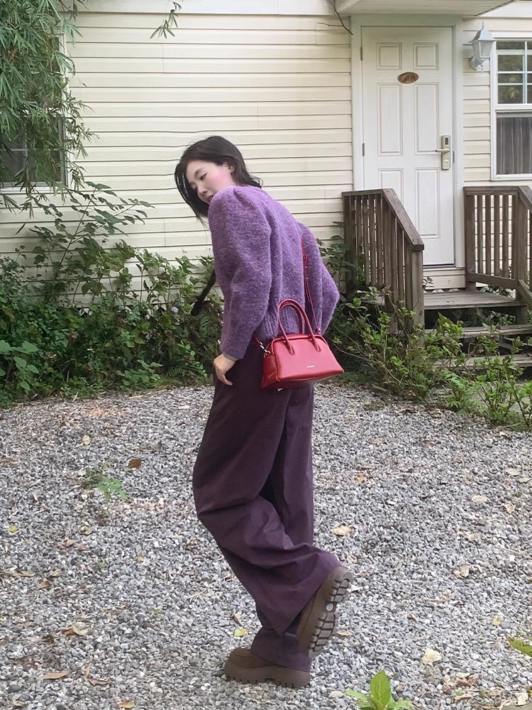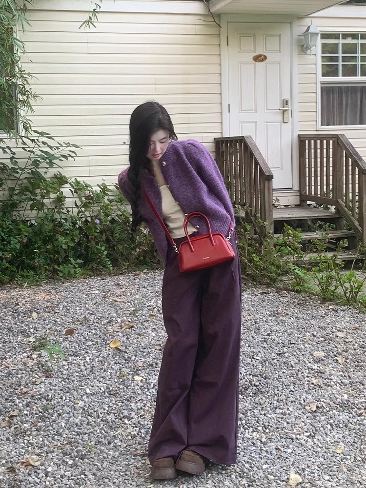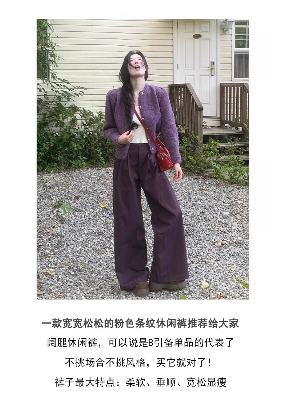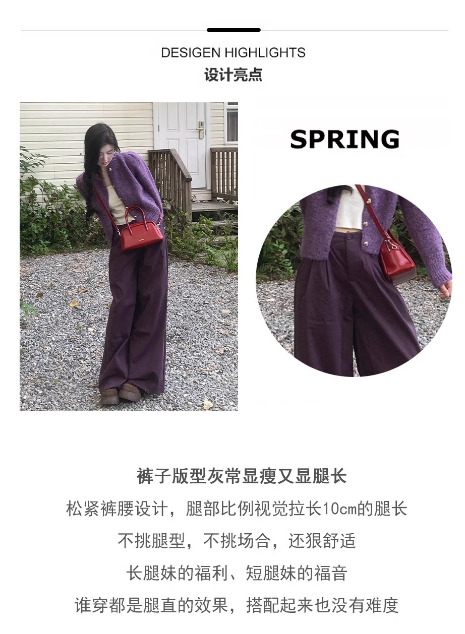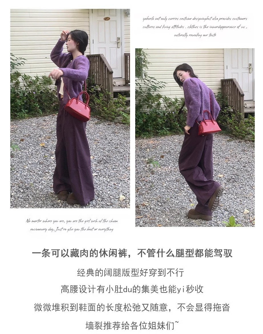 빈티지 다크 퍼플 게으른 스타일 넓은 다리 캐주얼 바지 여성의 2024 가을과 겨울 높은 허리 느슨한 덤프 긴 바지스토어 가기