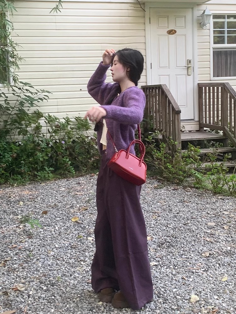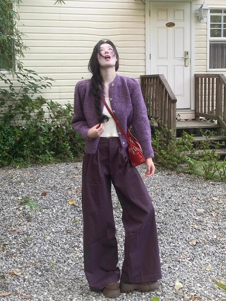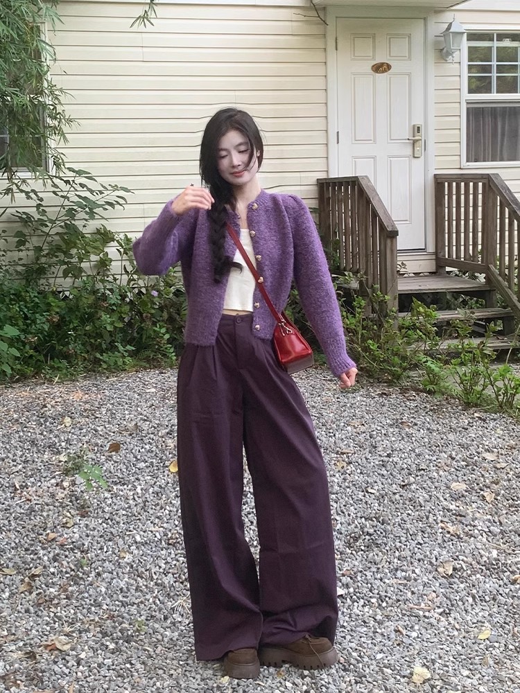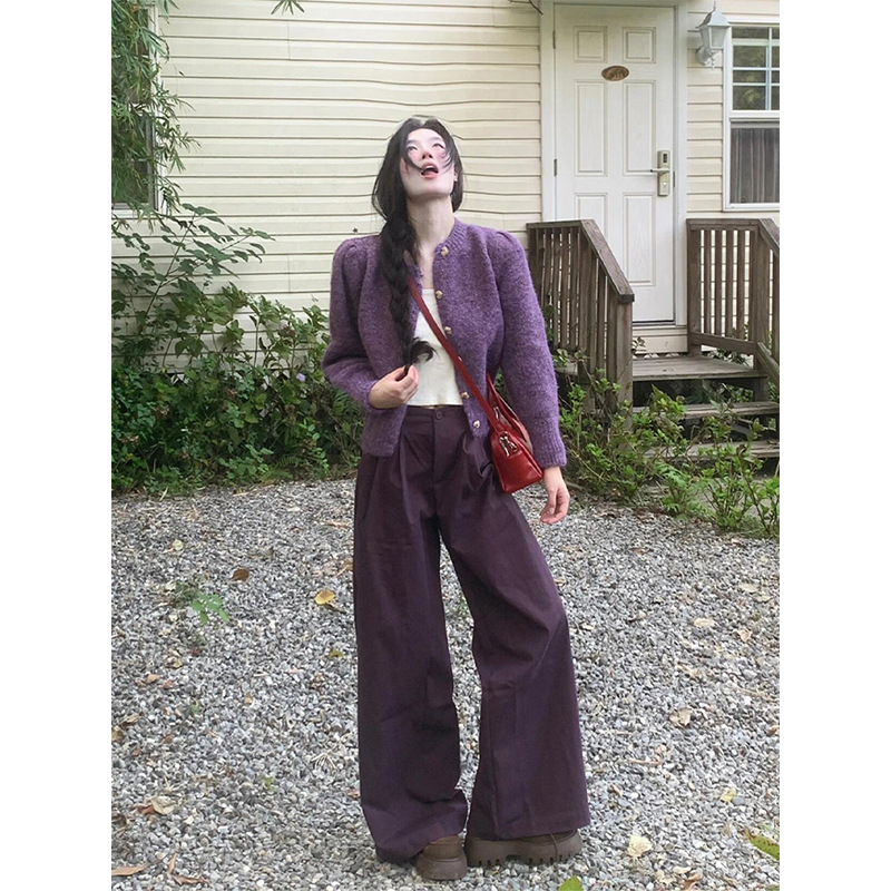 빈티지 다크 퍼플 게으른 스타일 넓은 다리 캐주얼 바지 여성의 2024 가을과 겨울 높은 허리 느슨한 덤프 긴 바지