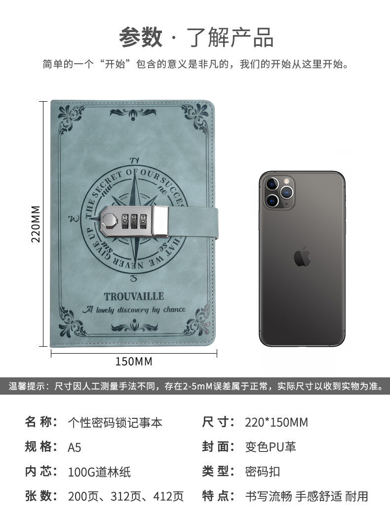 잠금 저널이있는 A5 비밀번호 노트북 두꺼운 간단한 비밀번호 책 일본과 한국 창조적 인 학생 메모장은 왕진이 될 수 있습니다스토어 가기