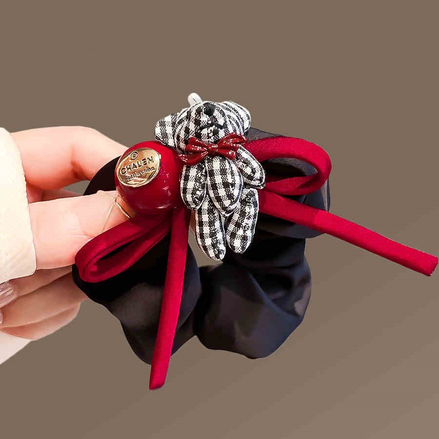 프랑스 스타일 흑백 격자 무늬 곰 활 머리 반지 여성의 2024 새로운 머리 밧줄 머리 스트랩 대형 그릇 반지 머리 로프