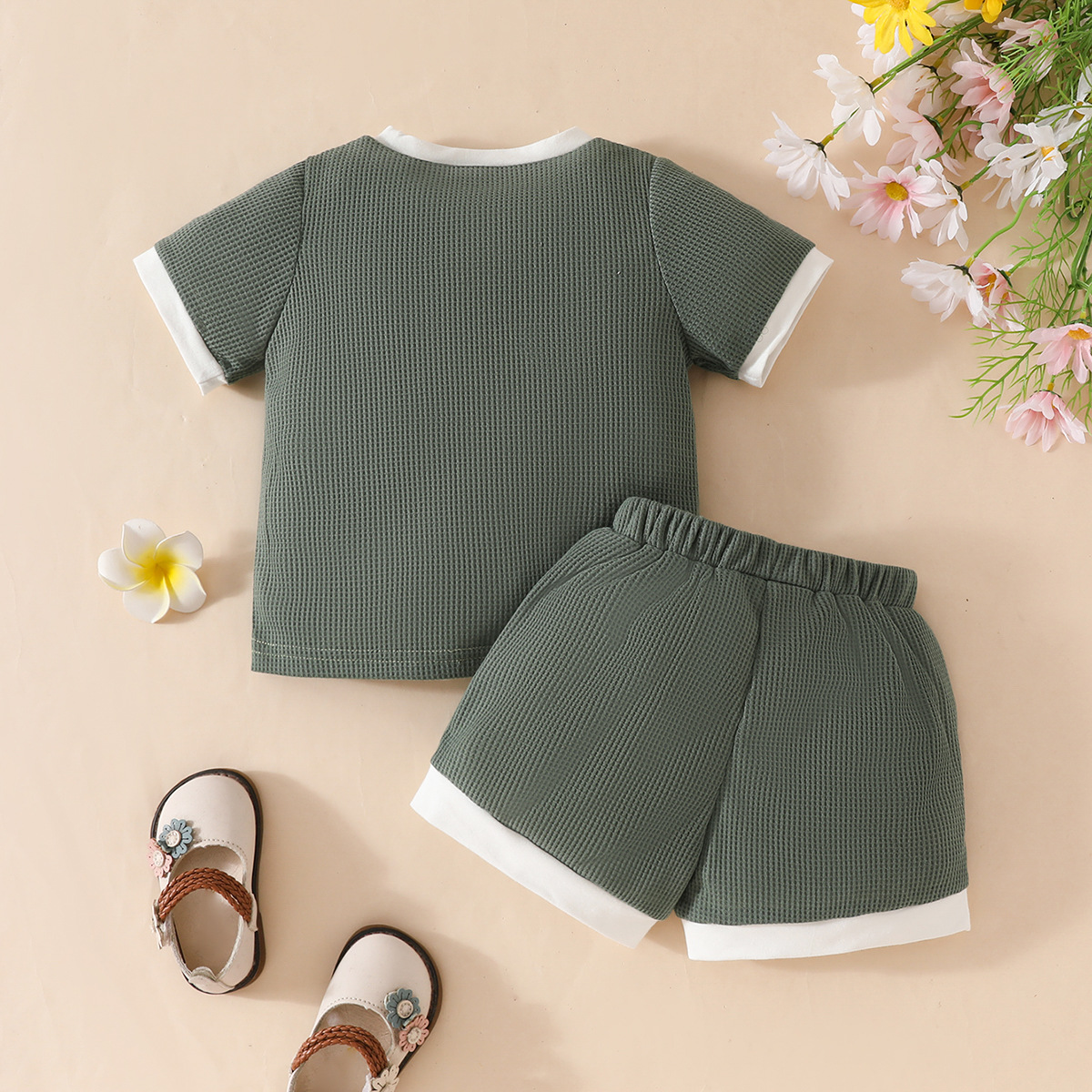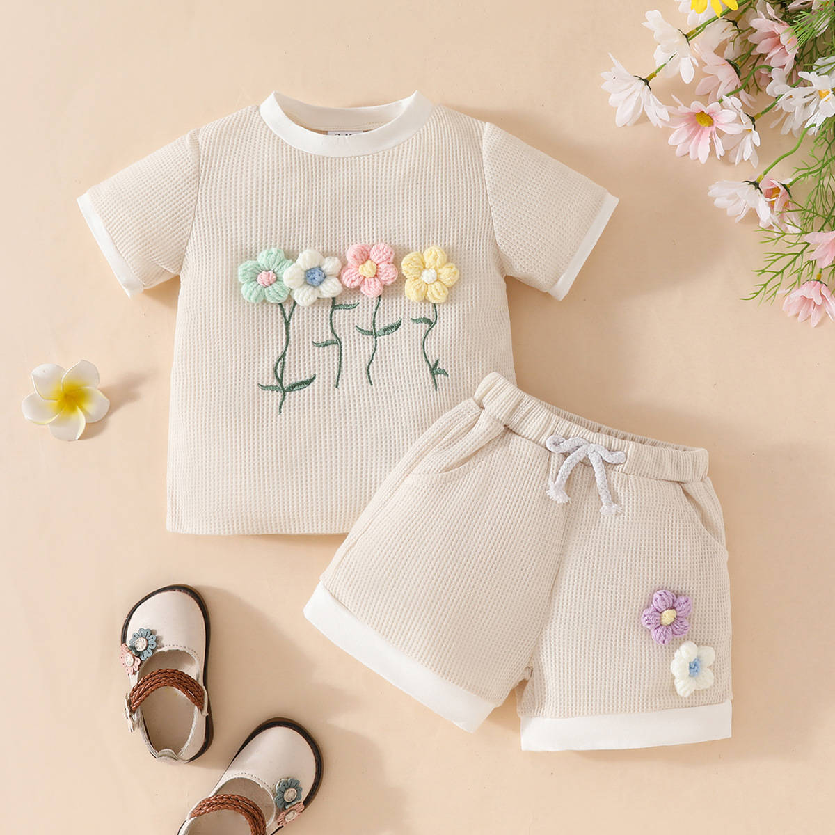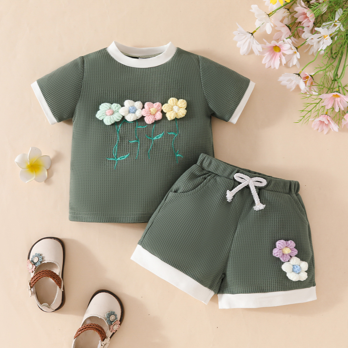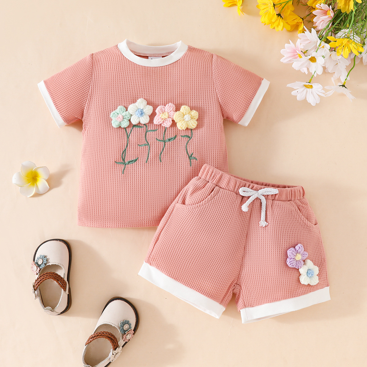 국경 간 대외 무역 아동복 어린이 여름 와플 둥근 목 색상 대비 짧은 소매 세트 3 차원 꽃 2 조각 세트스토어 가기
