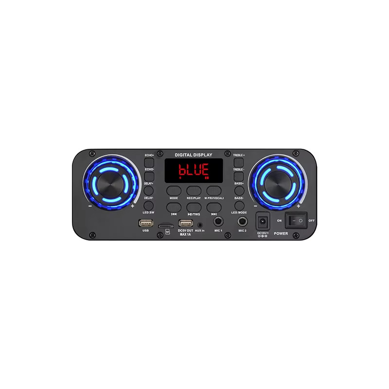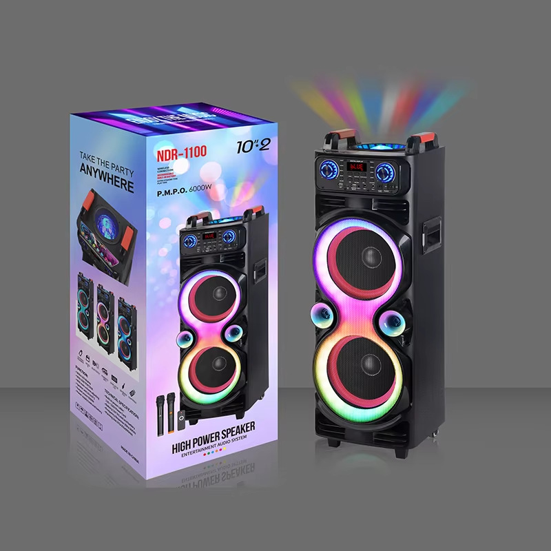 Product Configuration: double 10-inch high-power wood plastic audio, top headlight ball, front colorful light, 15V3A charger, front and rear universal wheels, dual display microphone, large remote control.