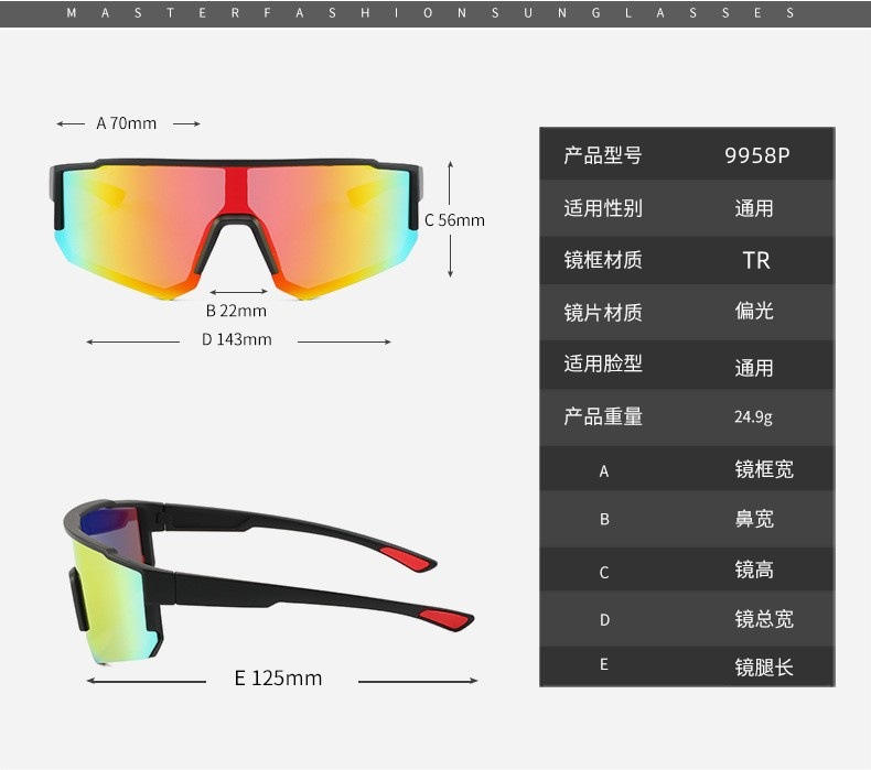 此款眼镜型号是9958,材质采用优质TR镜框偏光宝丽来镜片,大量现货供应!!箱规是78*25*57cm,300副一箱,一箱毛重16kg。