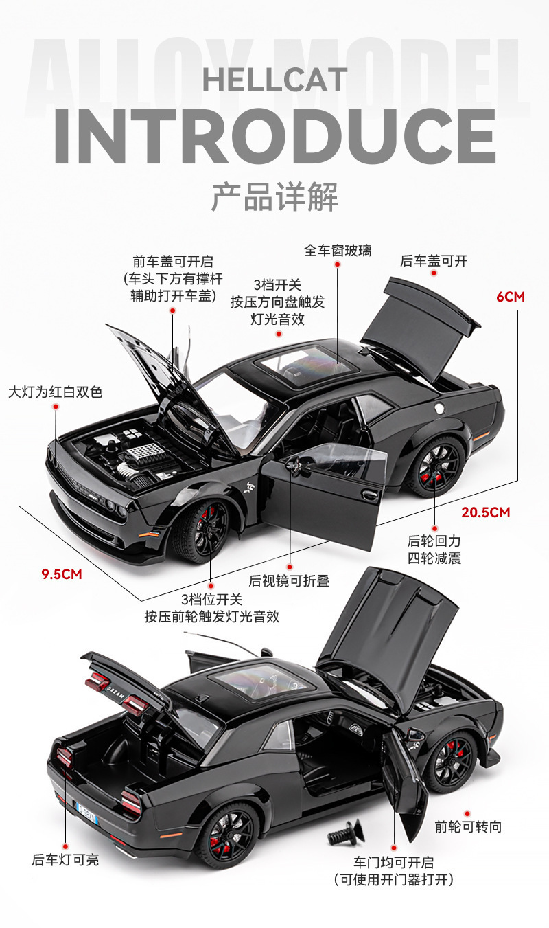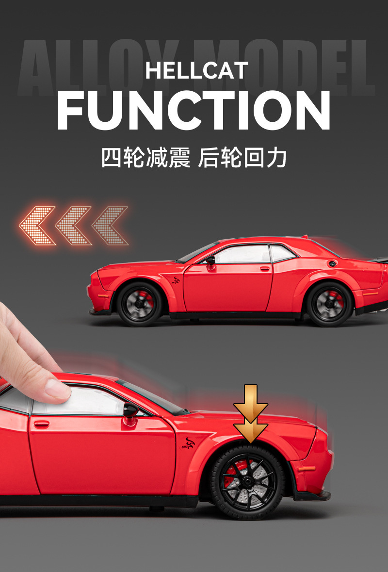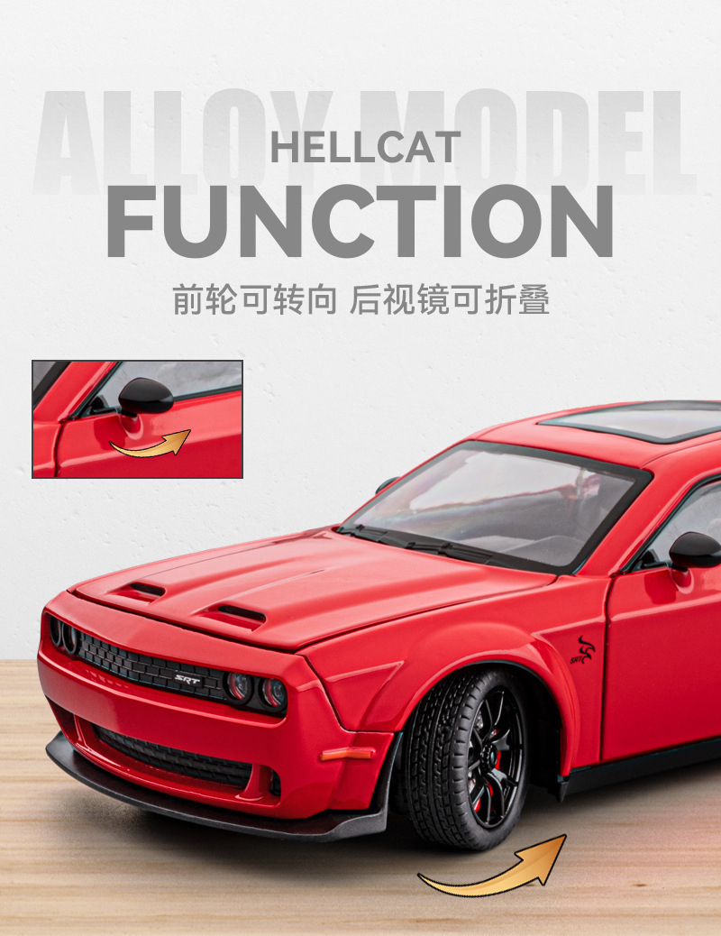합금 자동차 모형 1:24 헬캣 챌린저 스포츠카 모형 시뮬레이션 사운드 및 라이트 후진 기능 도어 개폐 가능 시뮬레이션 모형 자동차