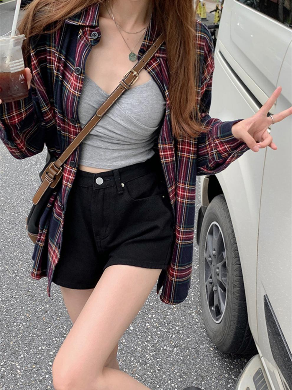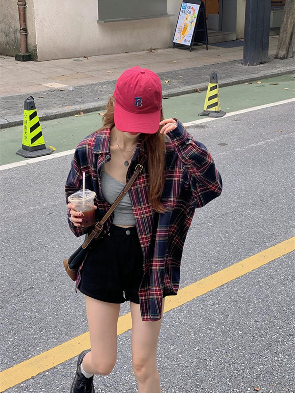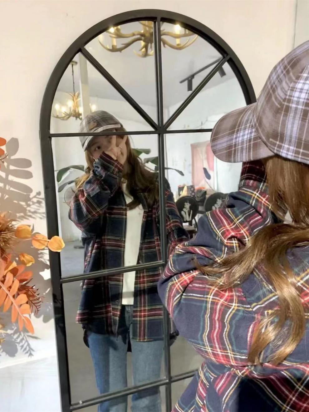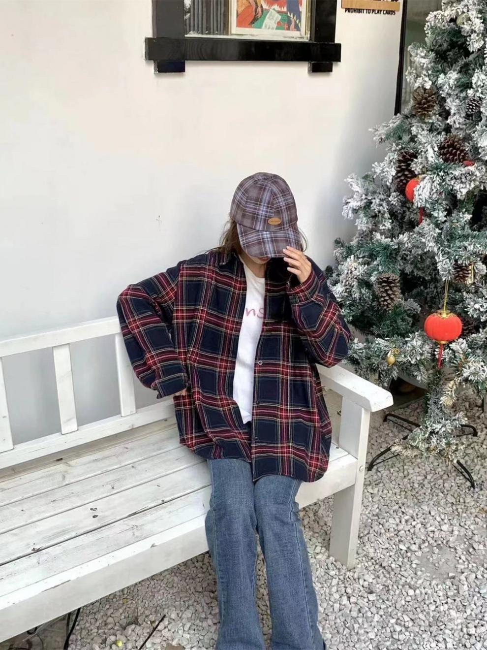 미국 복고풍 격자 무늬 셔츠 여성용 가을 최고 느슨한 Bf 게으른 스타일 캐주얼 긴 소매 셔츠 재킷스토어 가기