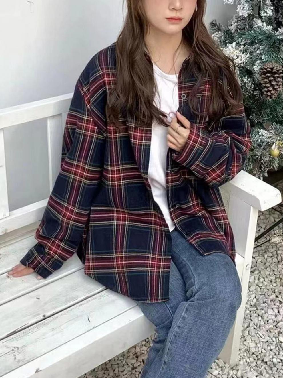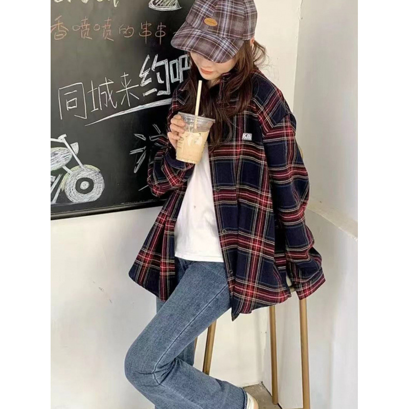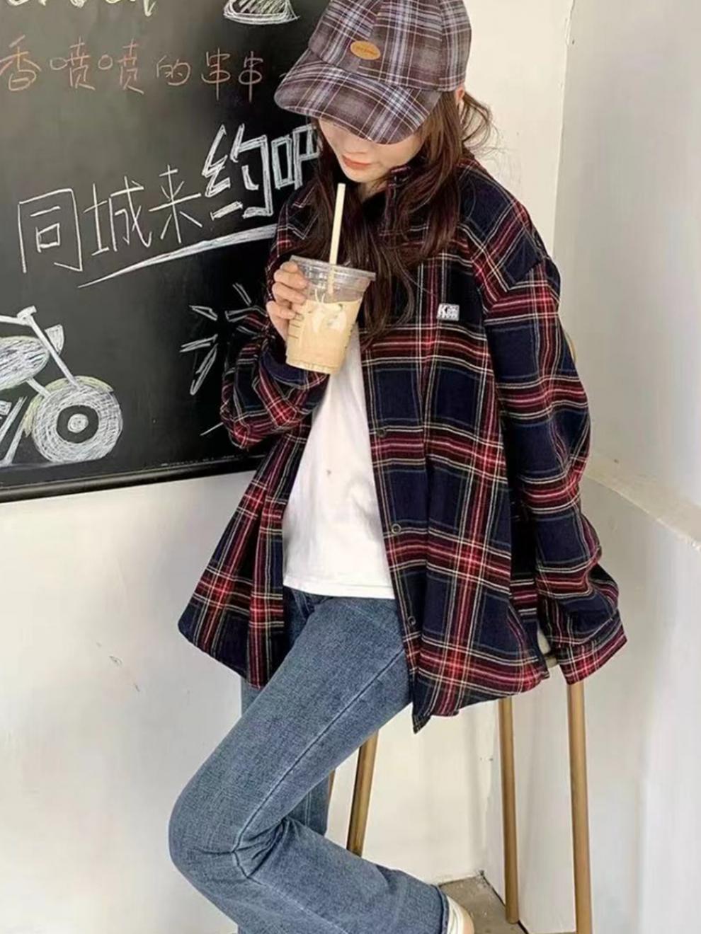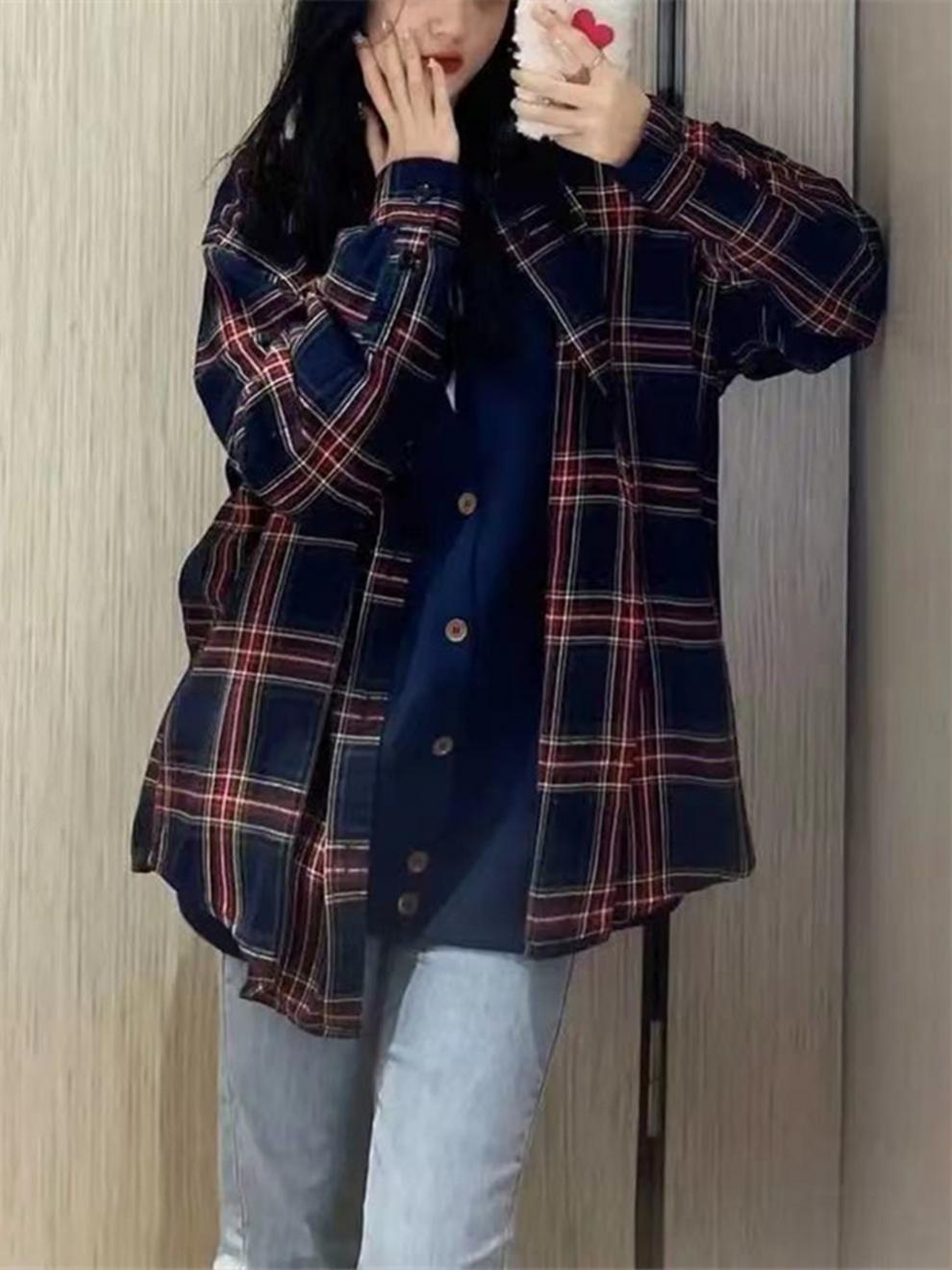 미국 복고풍 격자 무늬 셔츠 여성용 가을 최고 느슨한 Bf 게으른 스타일 캐주얼 긴 소매 셔츠 재킷