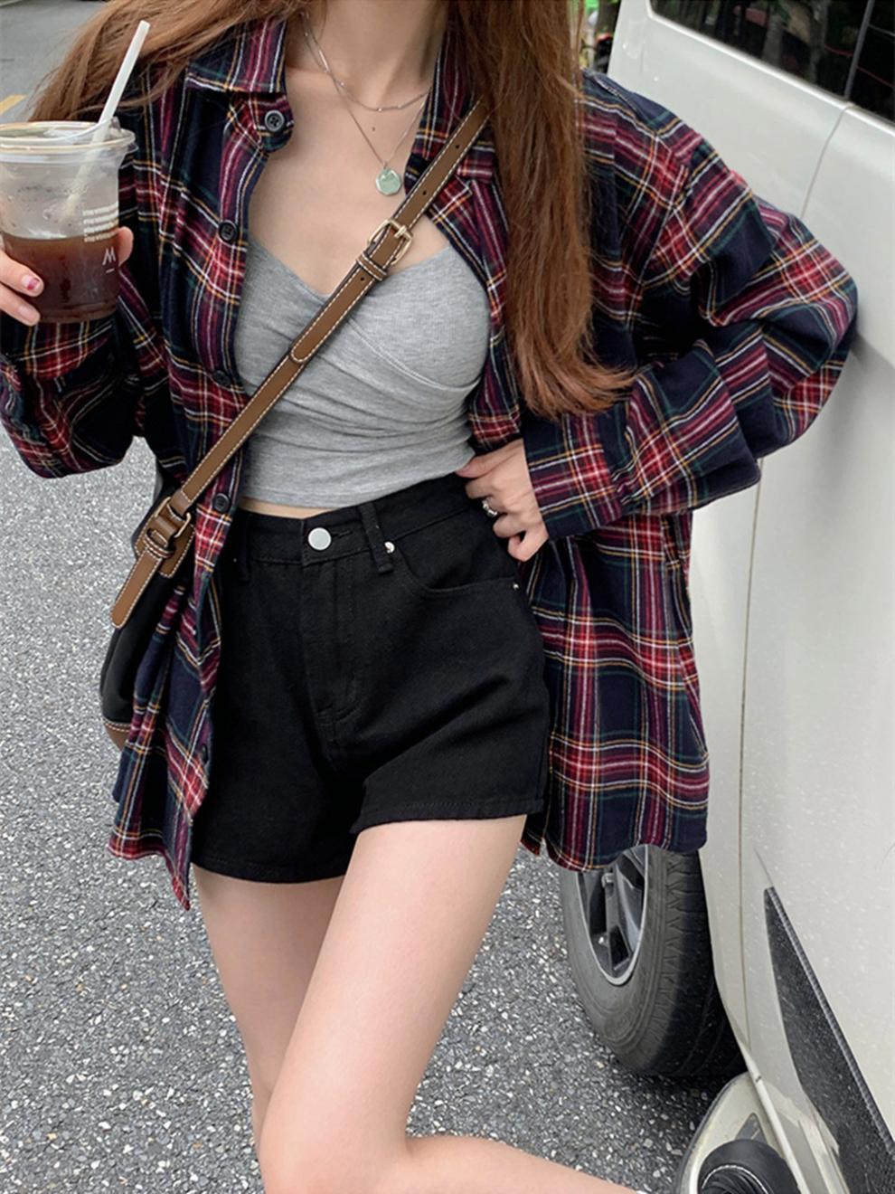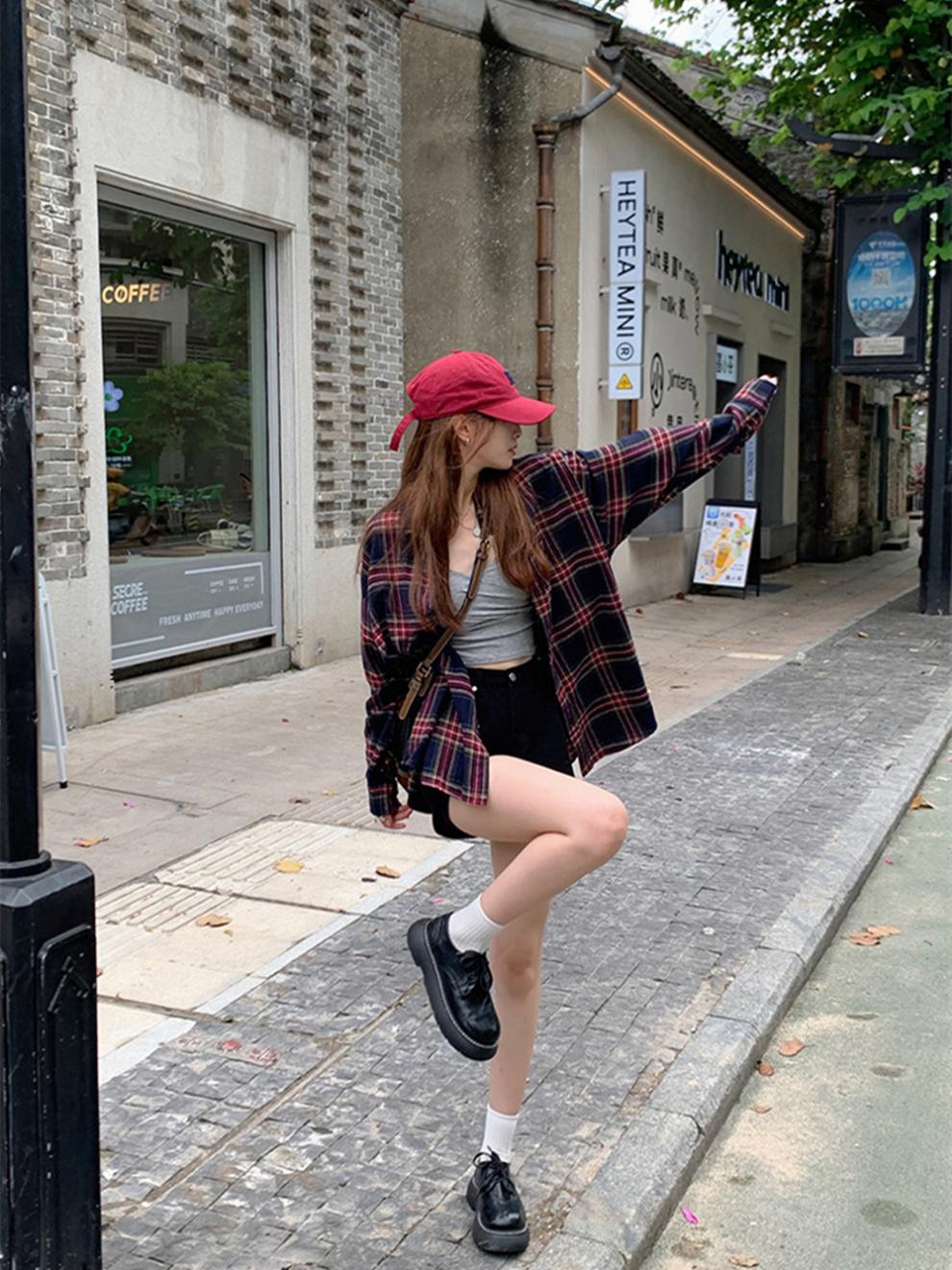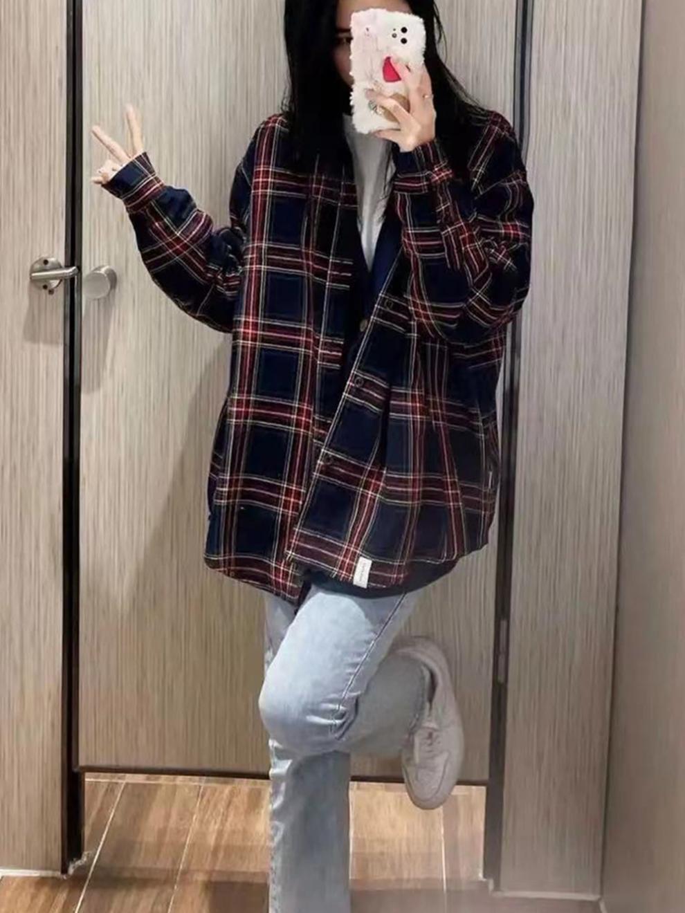 미국 복고풍 격자 무늬 셔츠 여성용 가을 최고 느슨한 Bf 게으른 스타일 캐주얼 긴 소매 셔츠 재킷