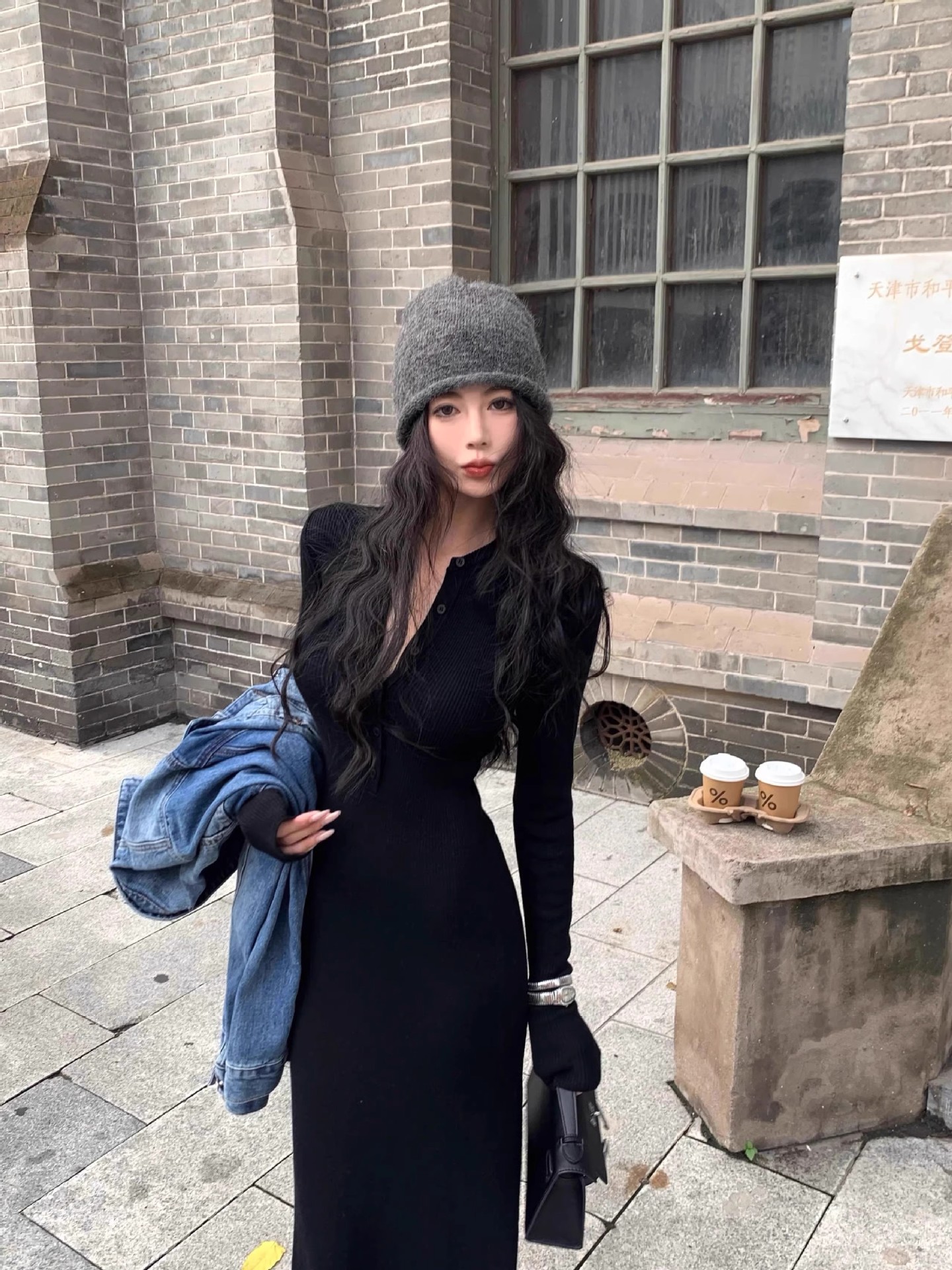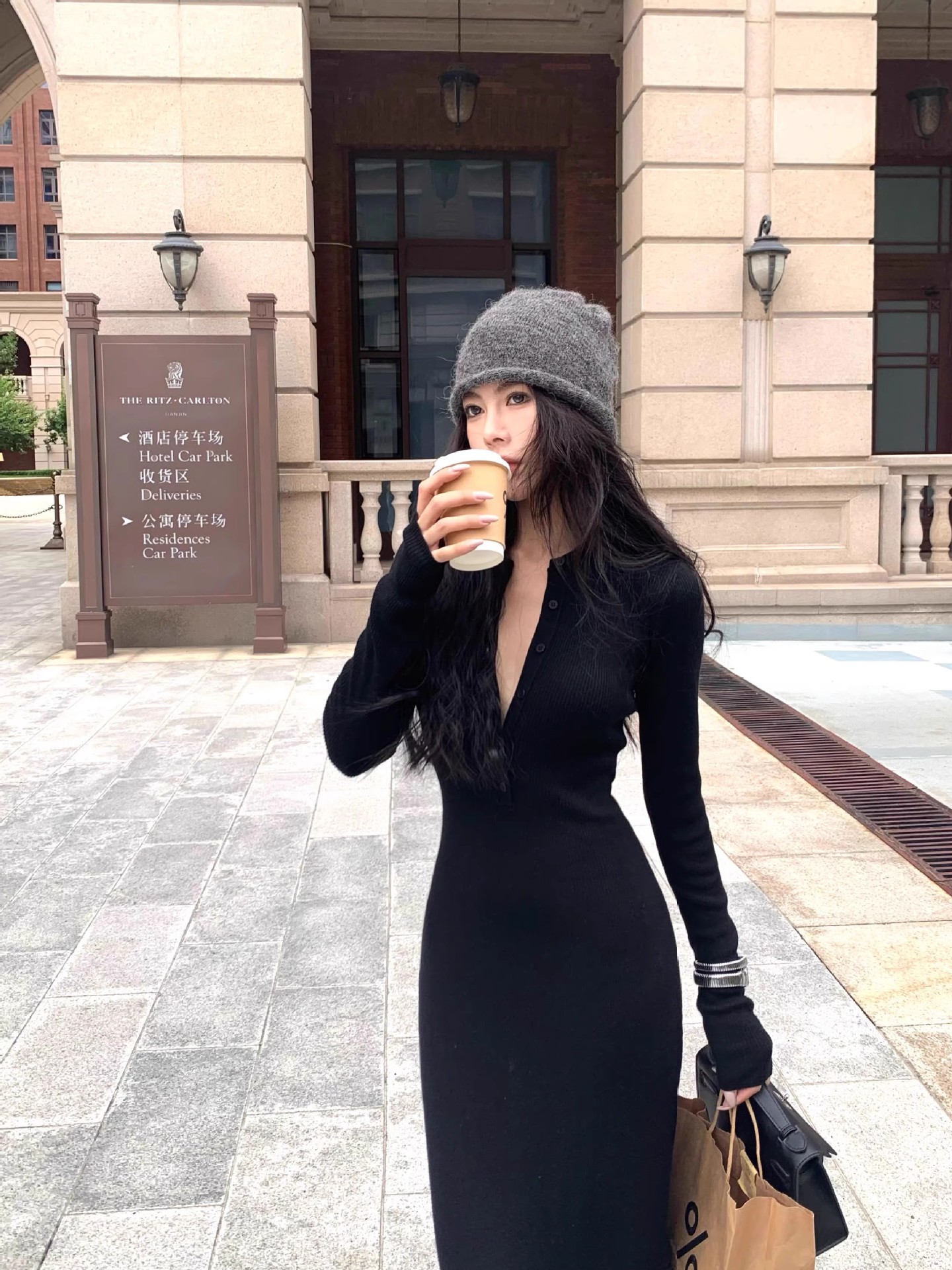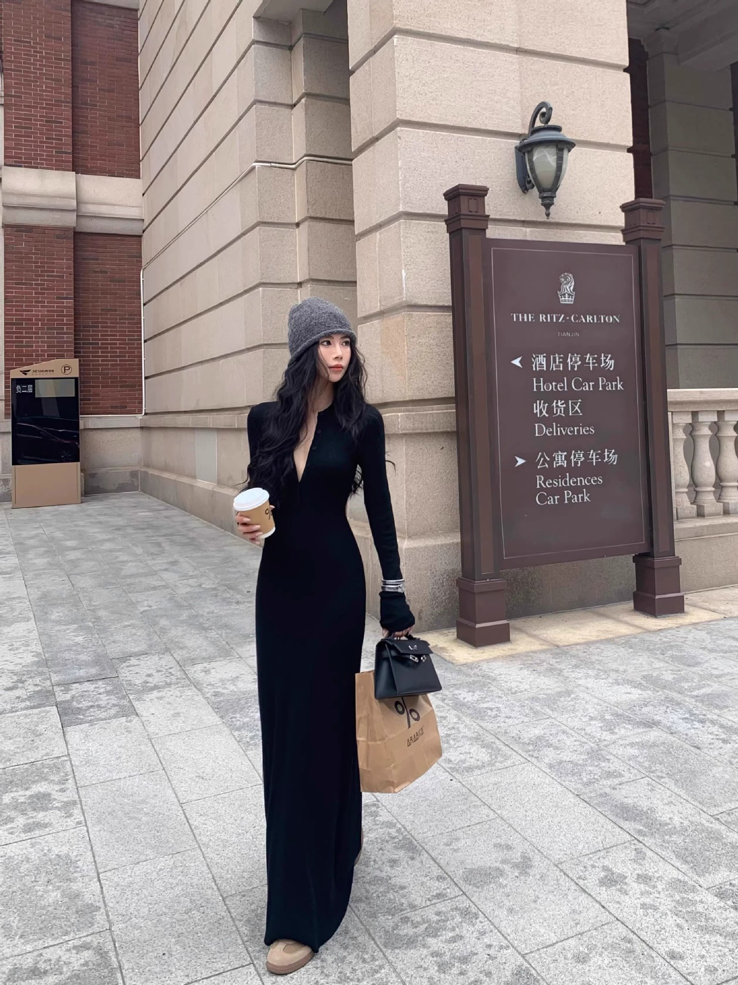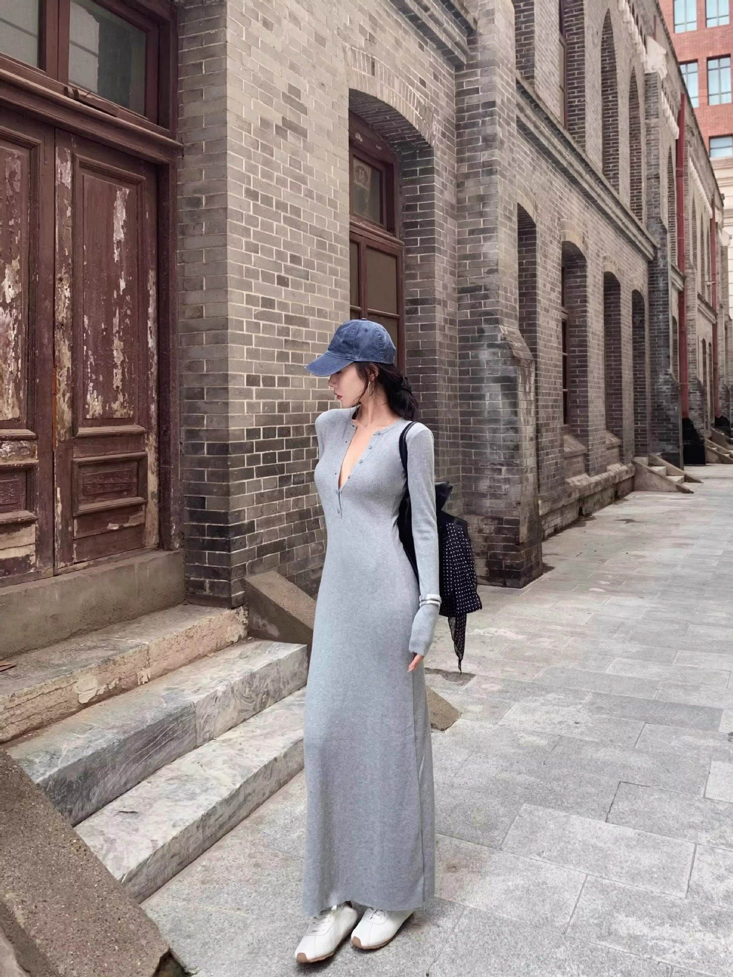 섹시한 스파이스 소녀 회색 긴팔 니트 원피스 여성의 가을과 겨울 우아한 슬림-맞는 긴 원피스 타이트 허리 스커트스토어 가기