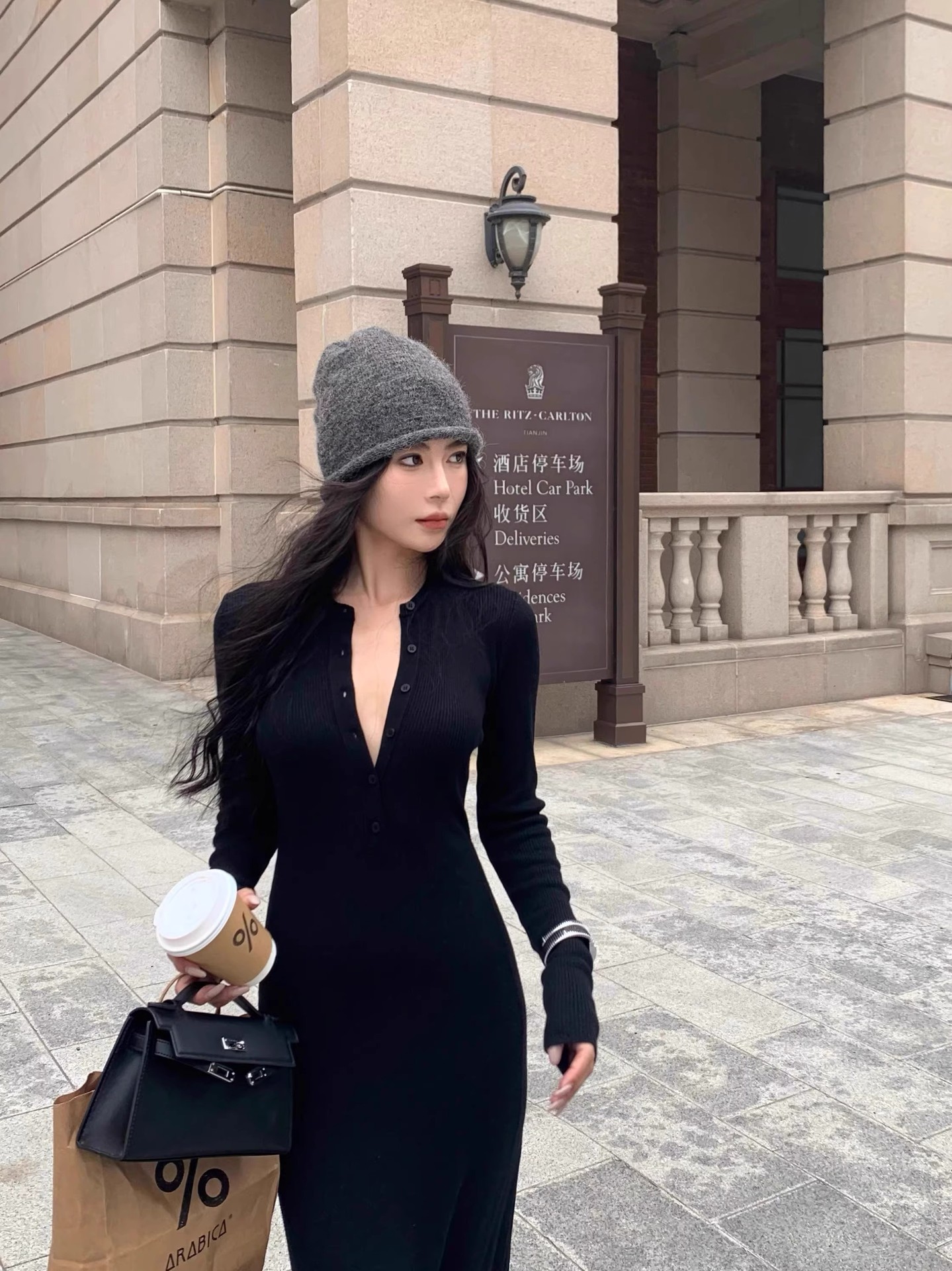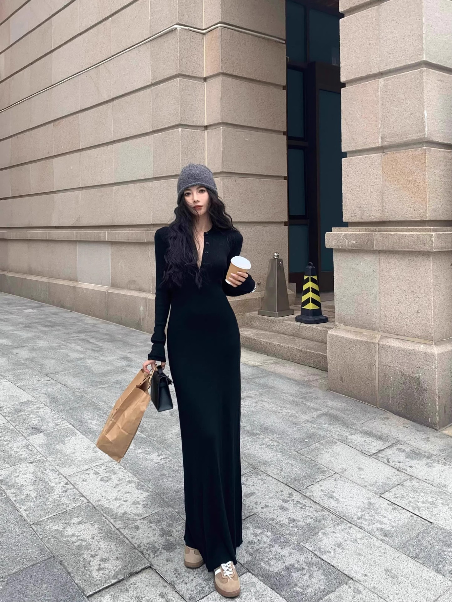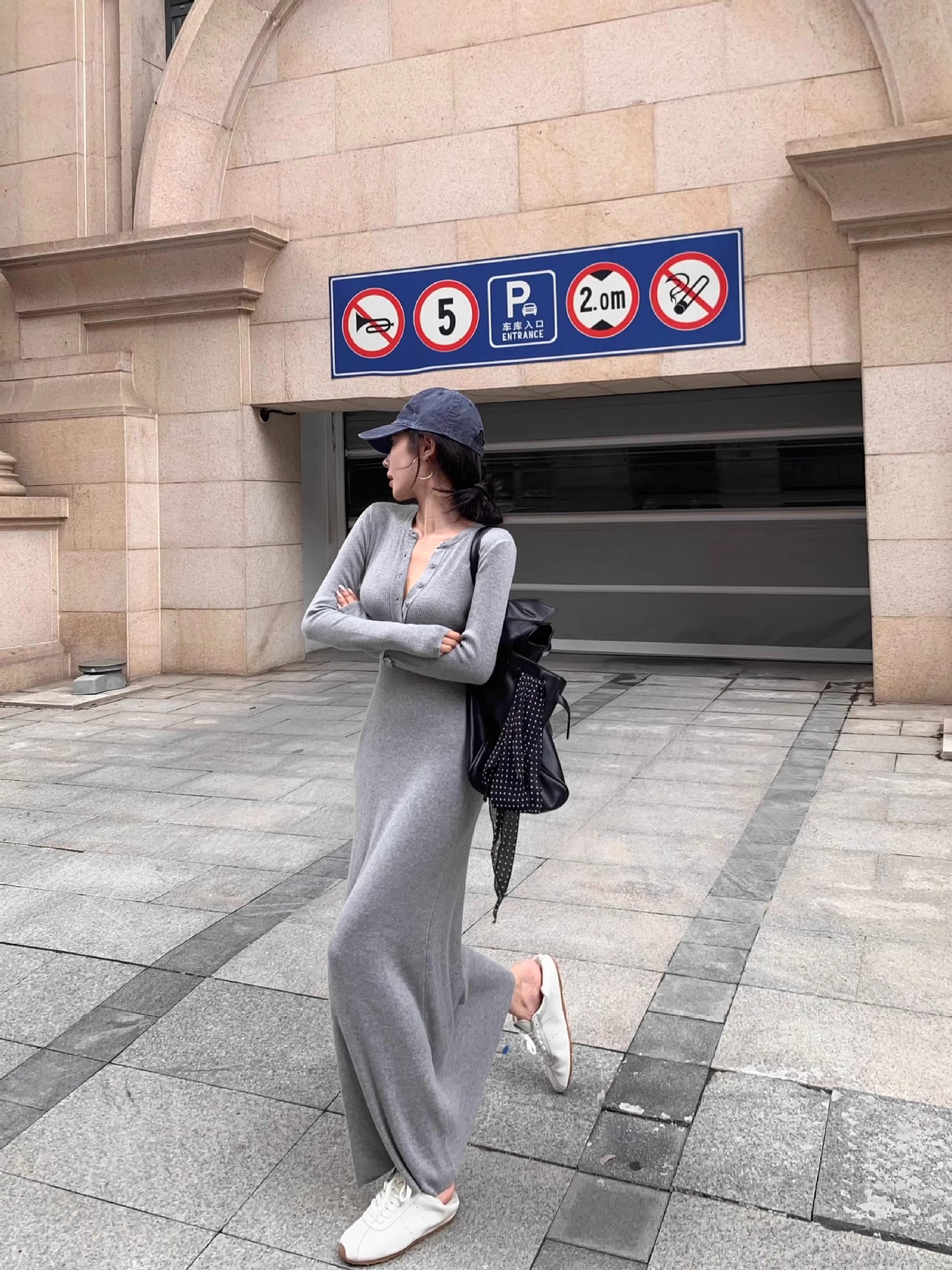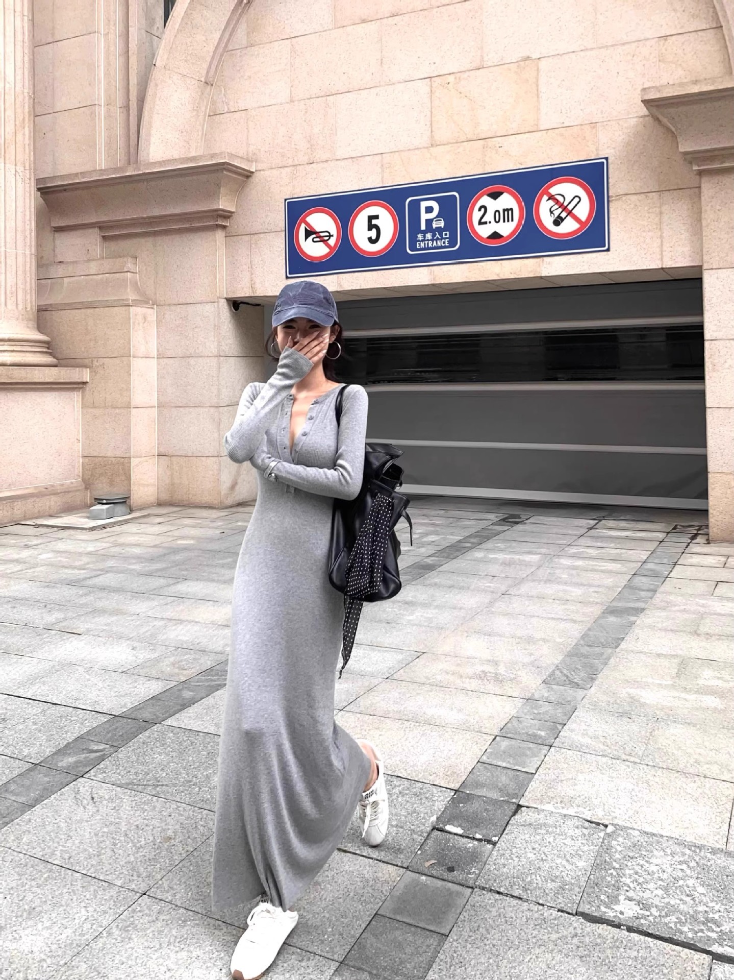섹시한 스파이스 소녀 회색 긴팔 니트 원피스 여성의 가을과 겨울 우아한 슬림-맞는 긴 원피스 타이트 허리 스커트스토어 가기