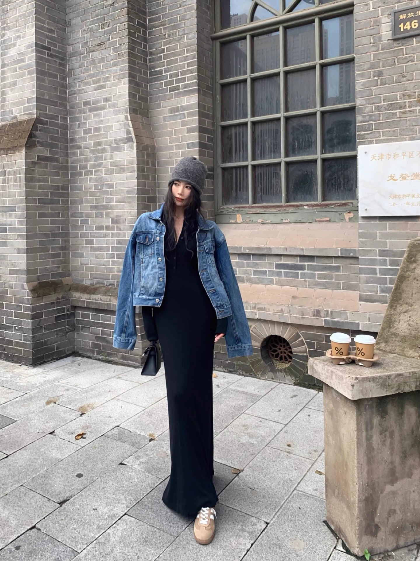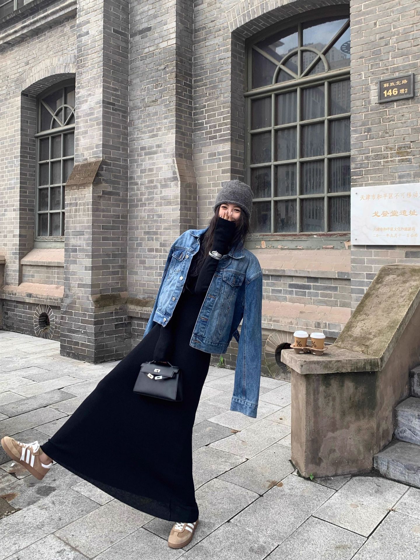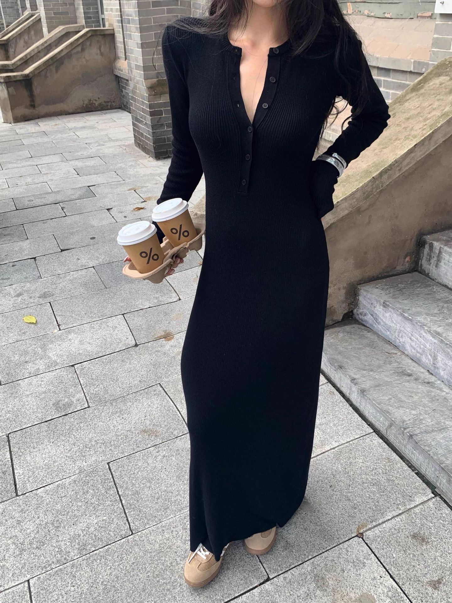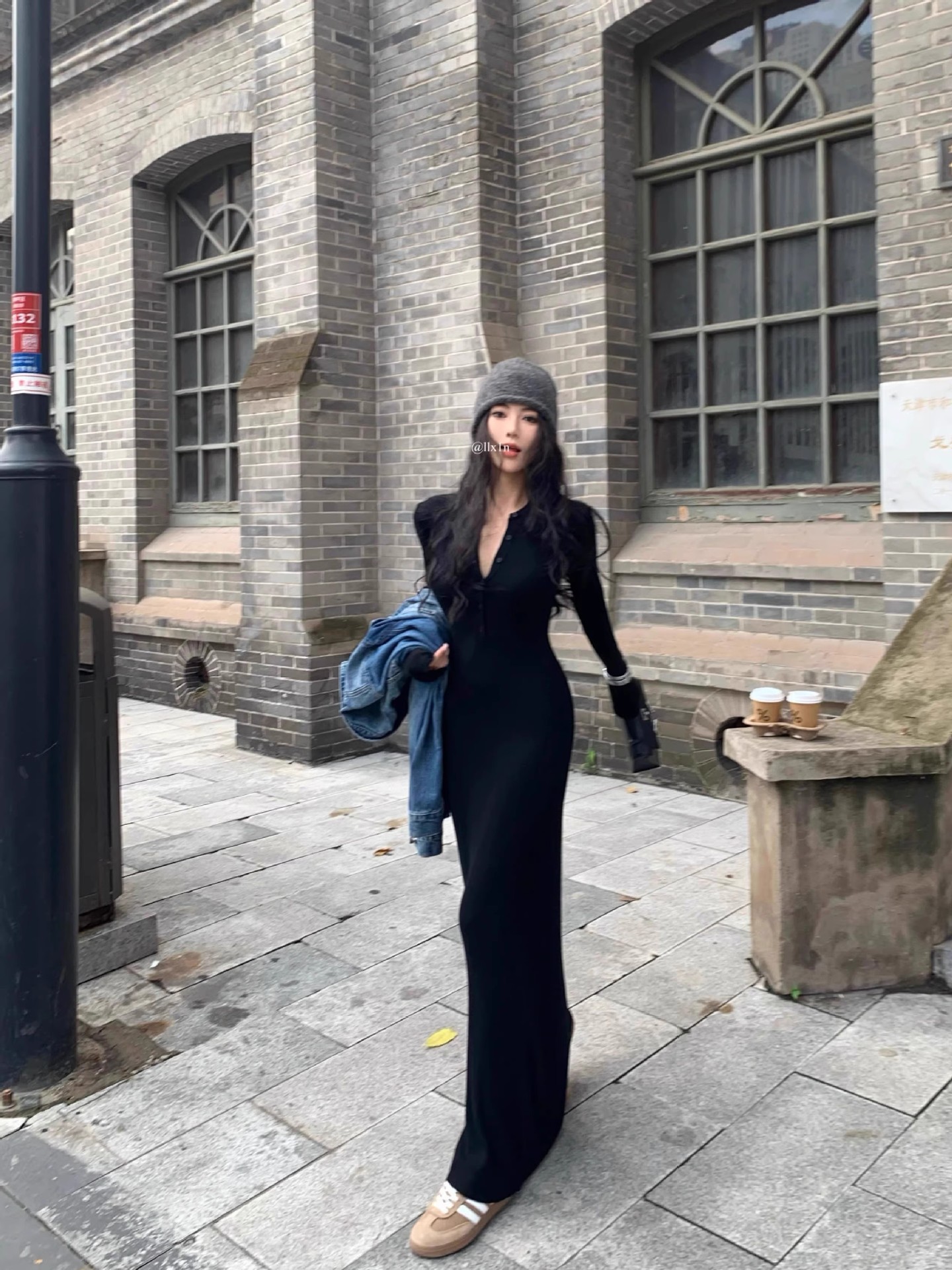 섹시한 스파이스 소녀 회색 긴팔 니트 원피스 여성의 가을과 겨울 우아한 슬림-맞는 긴 원피스 타이트 허리 스커트스토어 가기