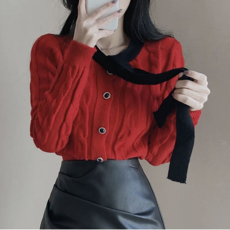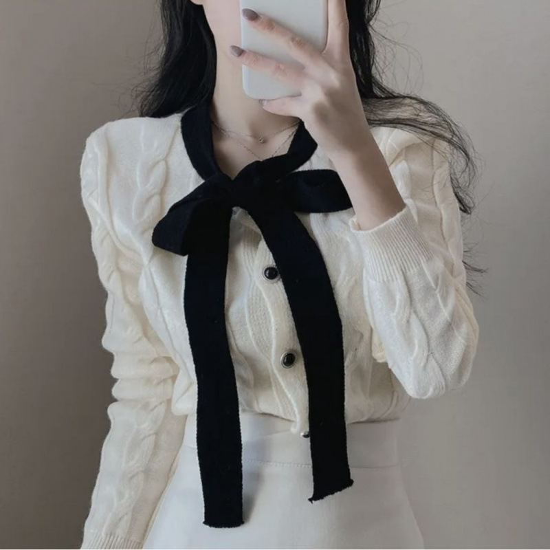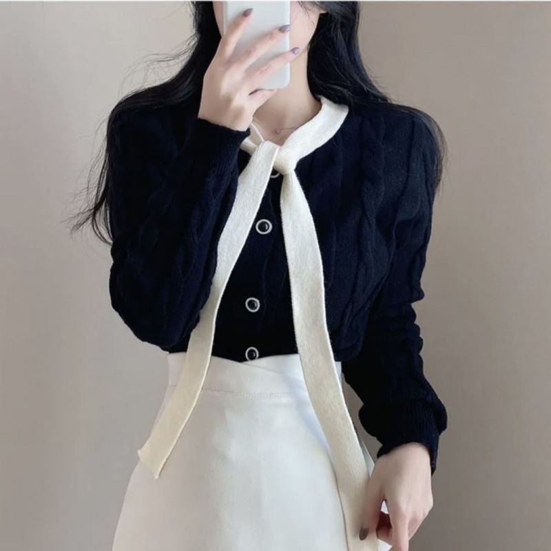 대학 스타일의 나이를 줄이는 활 레이스 업 니트웨어 여성 디자인 센스 작은 서양식 쇼트 트위스트 스웨터 코트스토어 가기