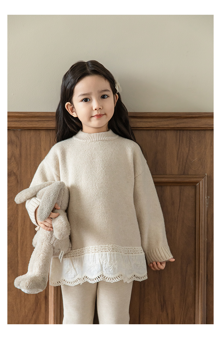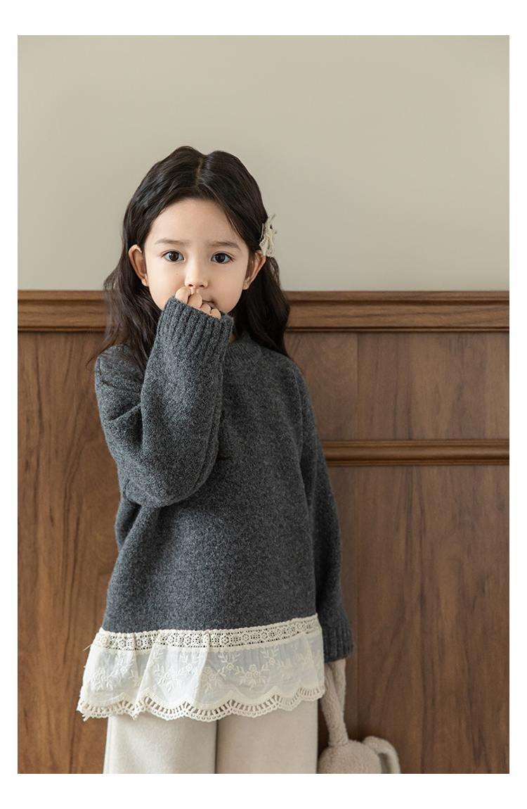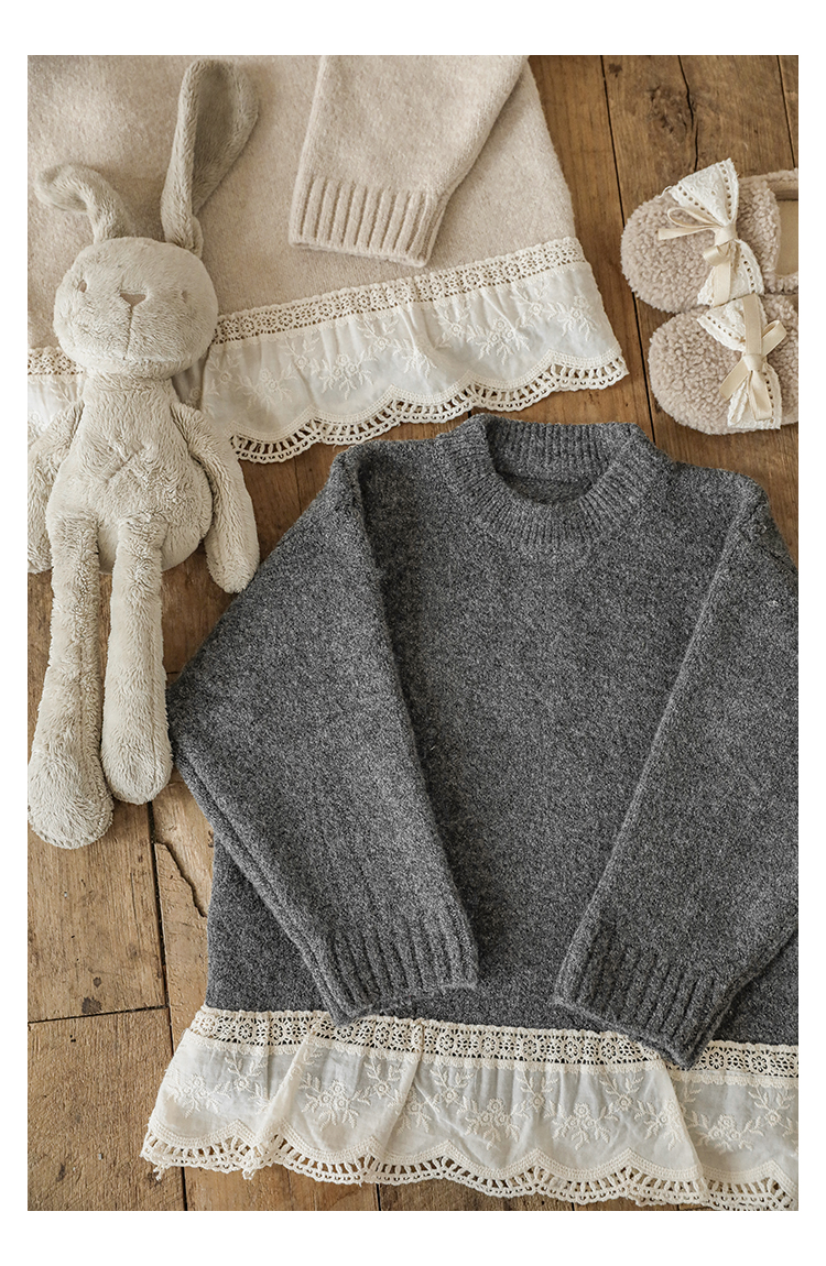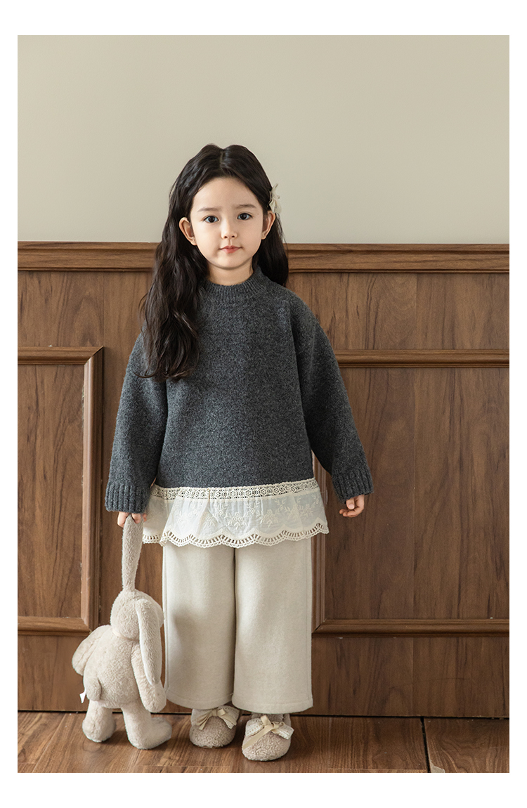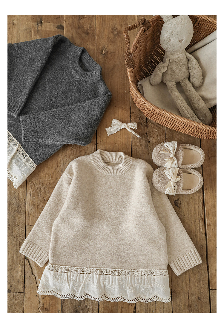 Wuri Bub 소녀 레이스 가짜 두 두꺼운 짠 푹신한 스웨터 2024 겨울 귀여운 따뜻한 코트