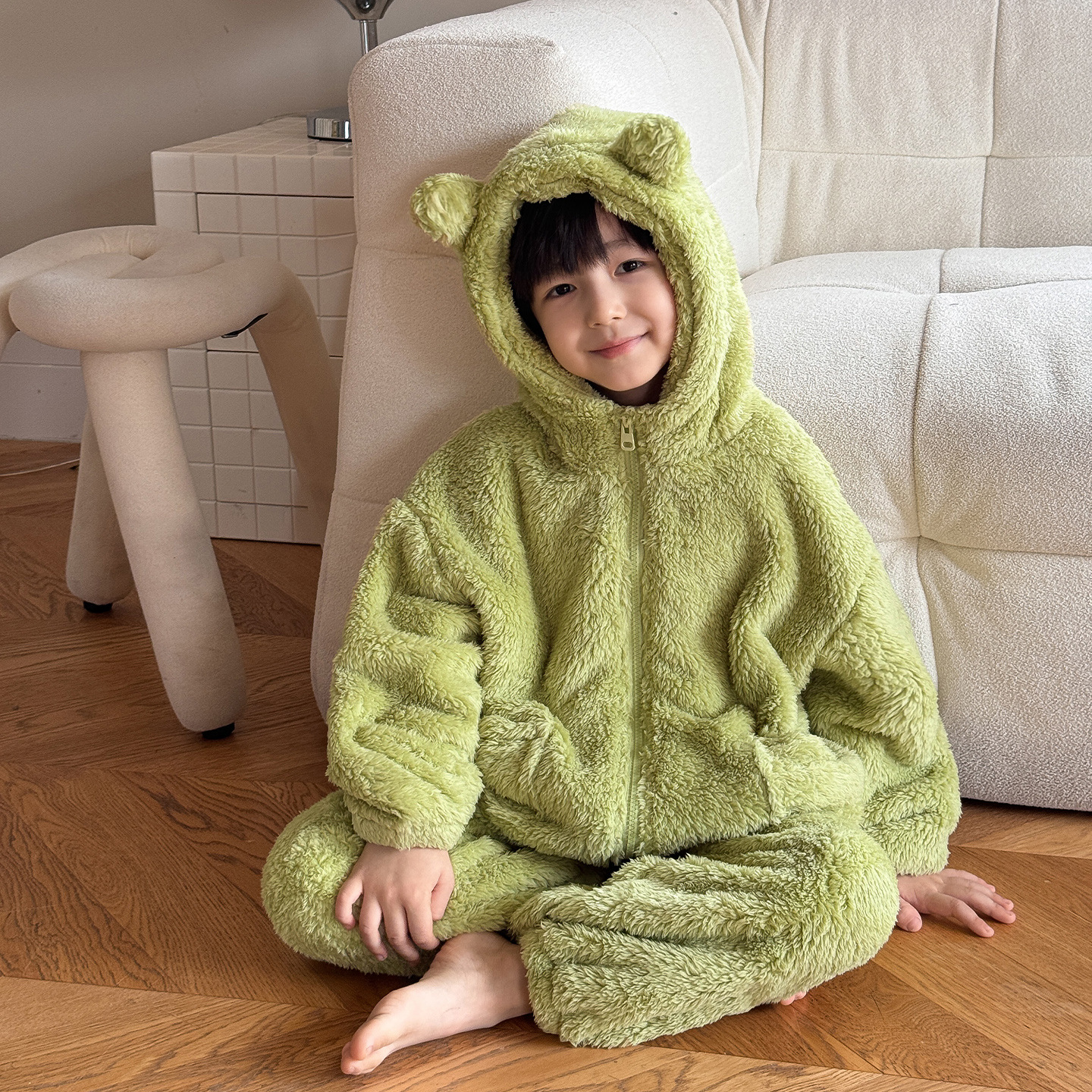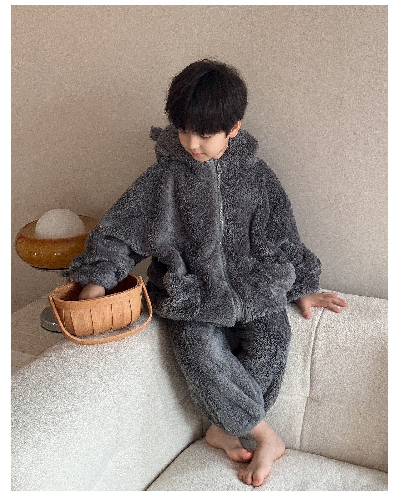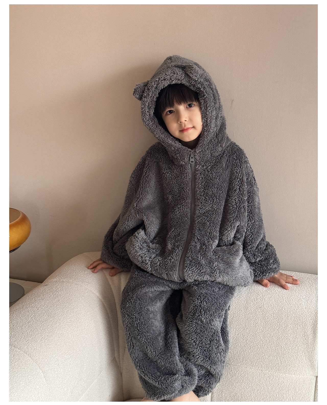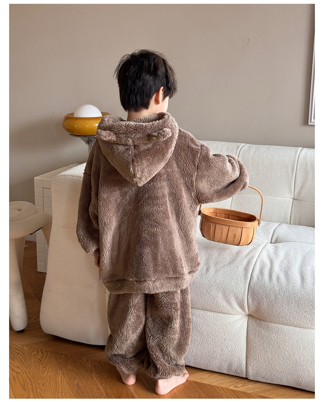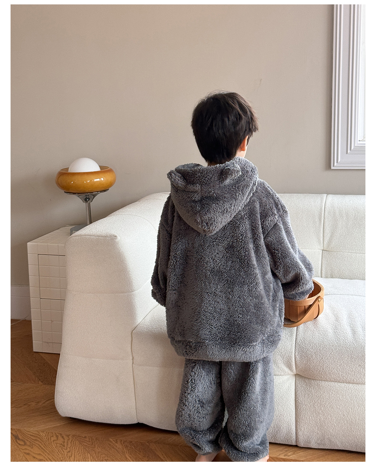 통쿠 2025 아동용 겨울 플러시 소프트 입체 귀 잠옷 두꺼운 단색 홈웨어 남아 세트
