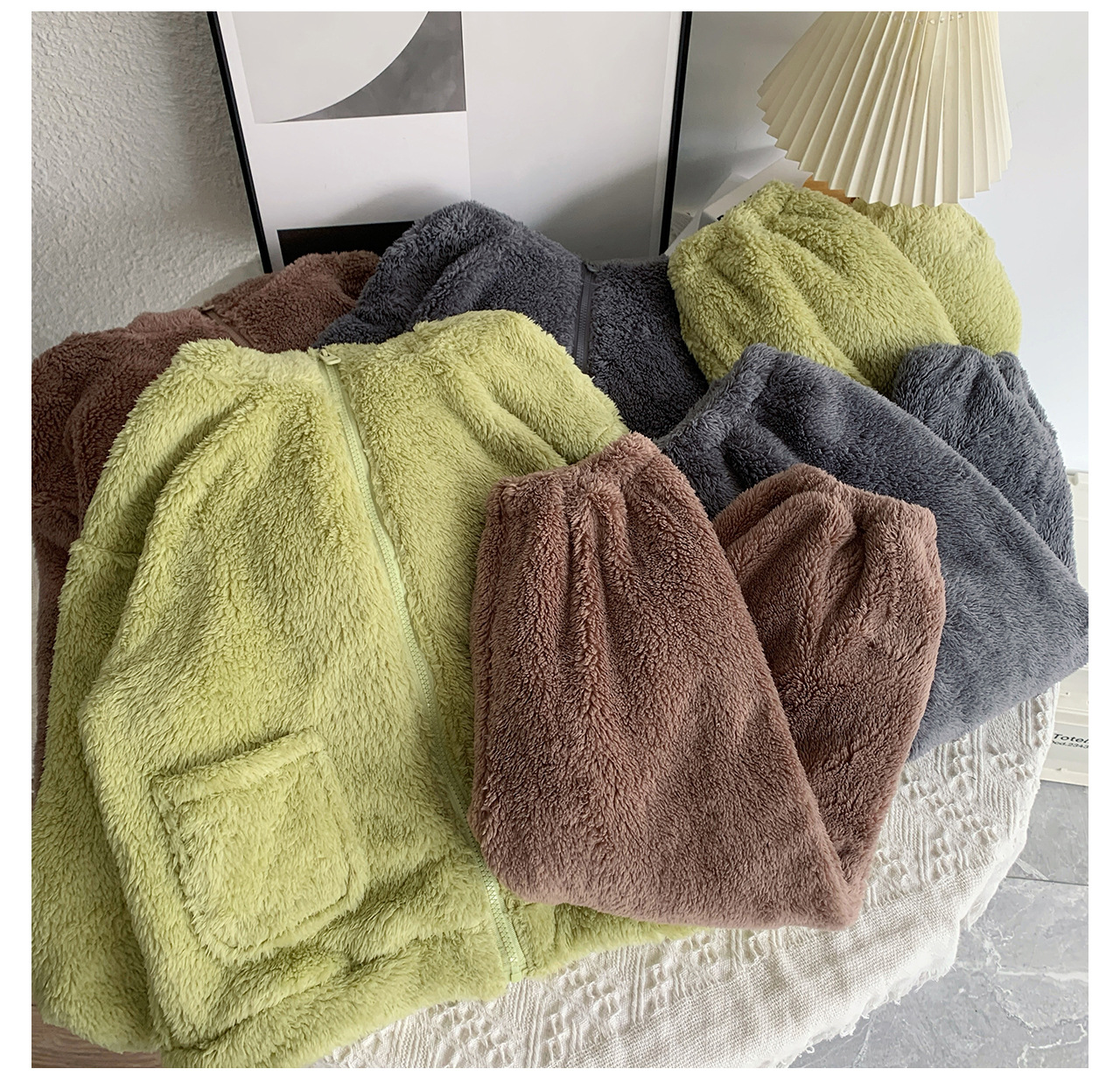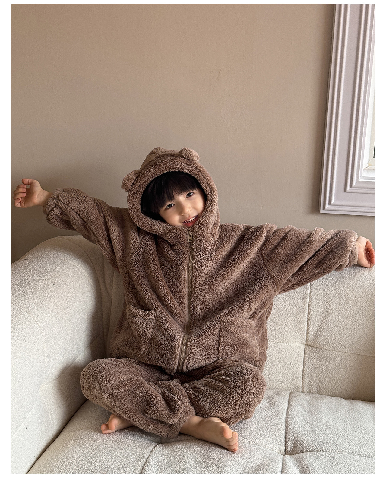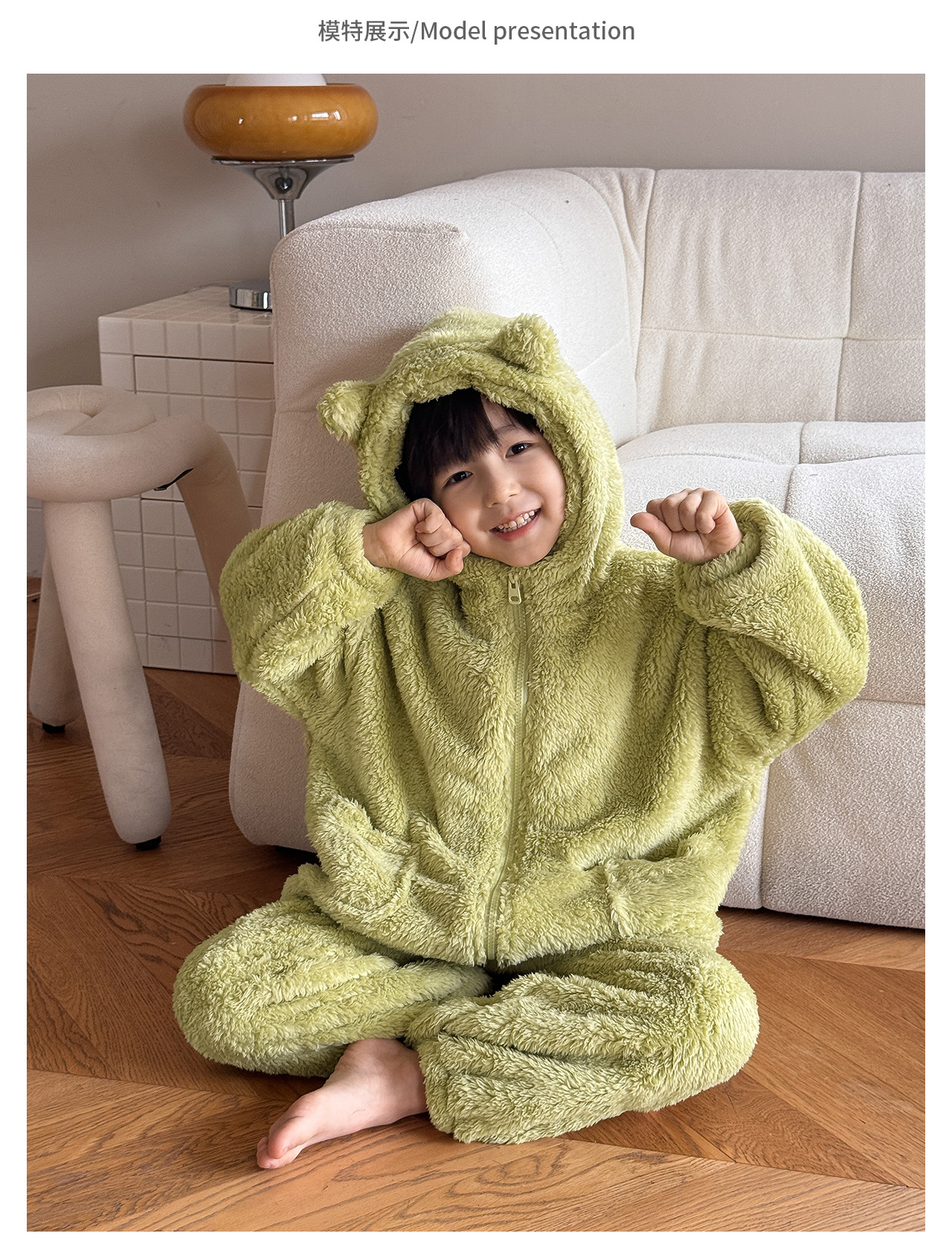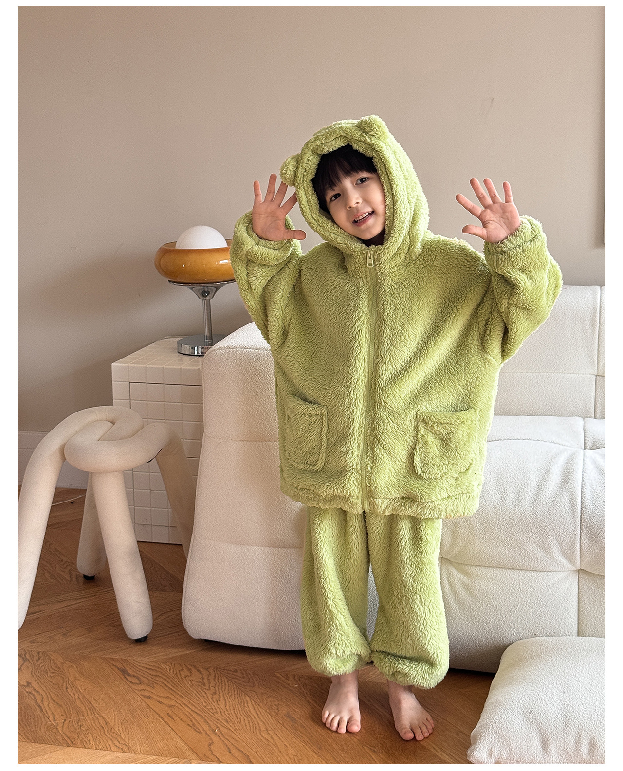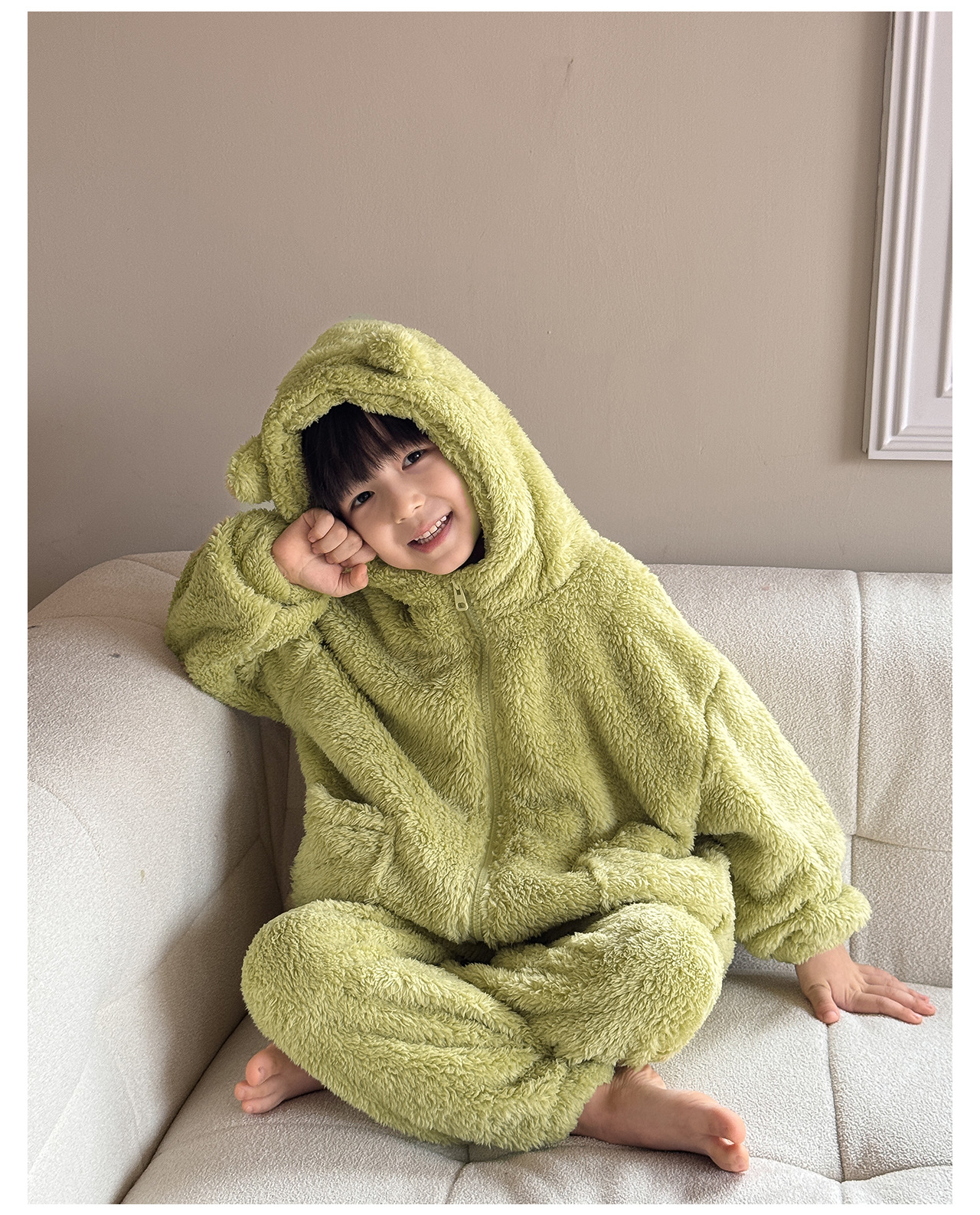 통쿠 2025 아동용 겨울 플러시 소프트 입체 귀 잠옷 두꺼운 단색 홈웨어 남아 세트