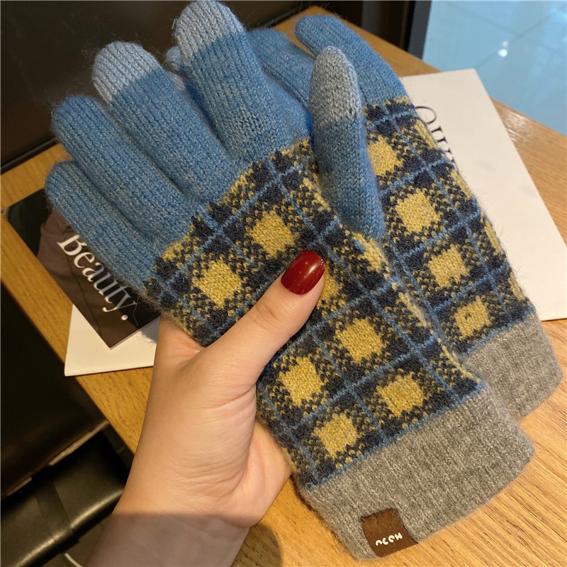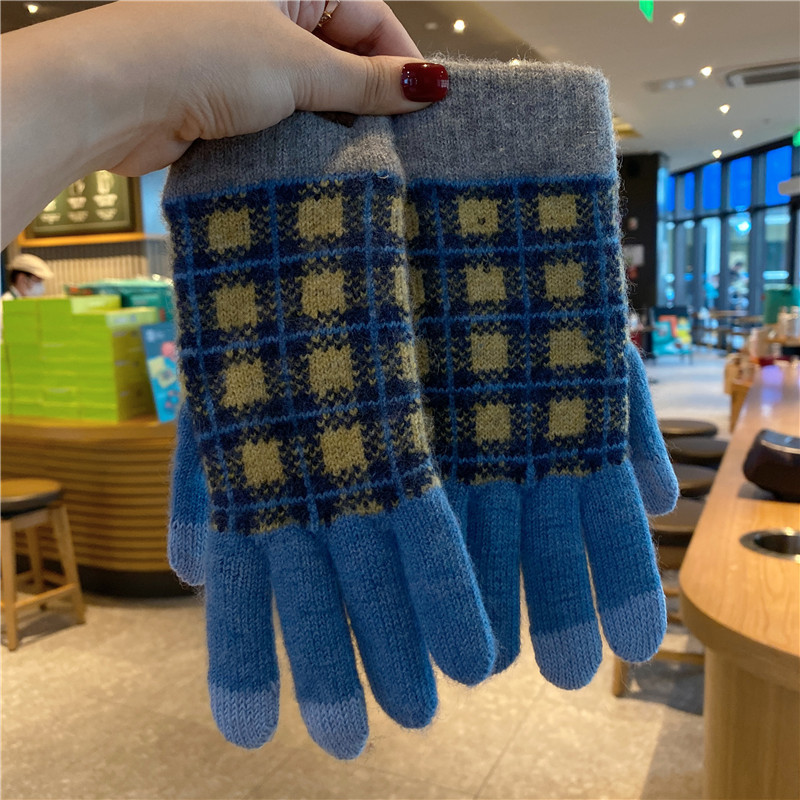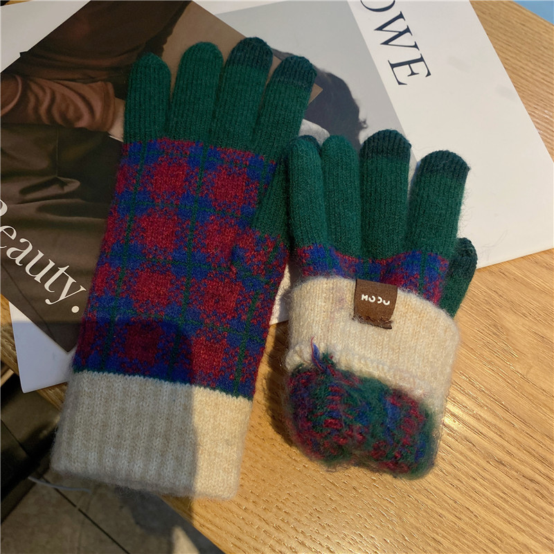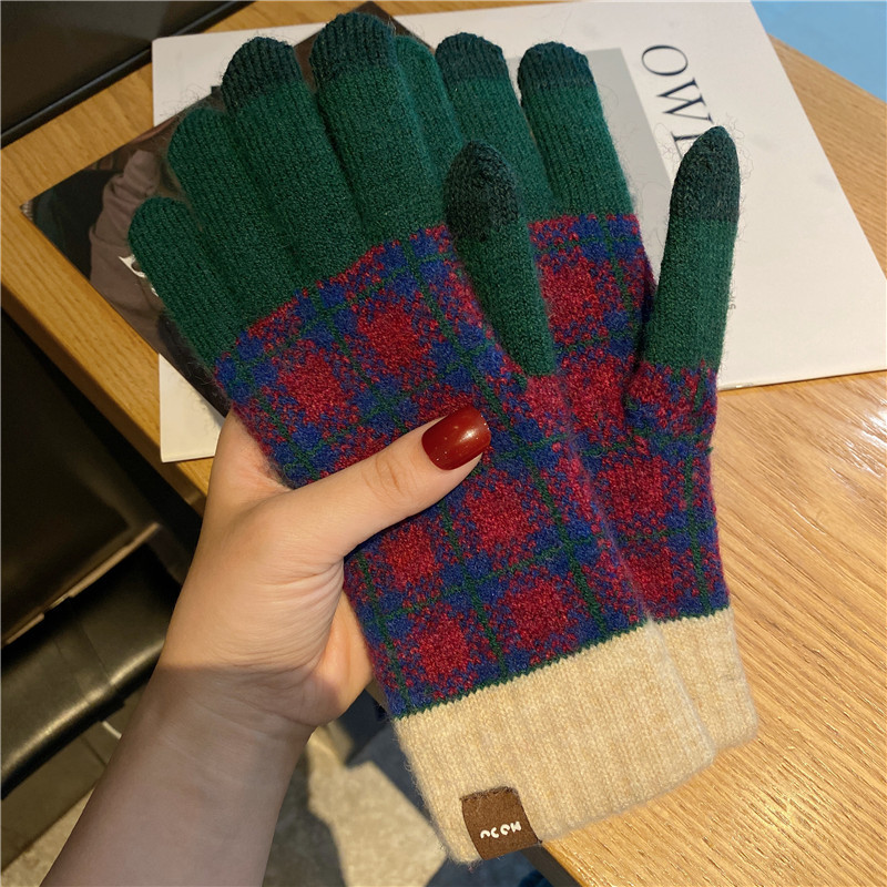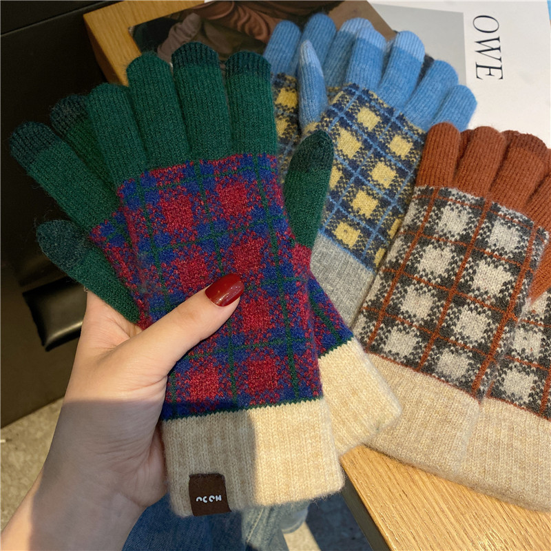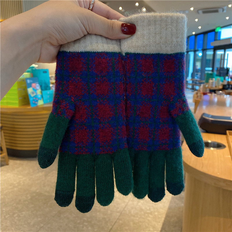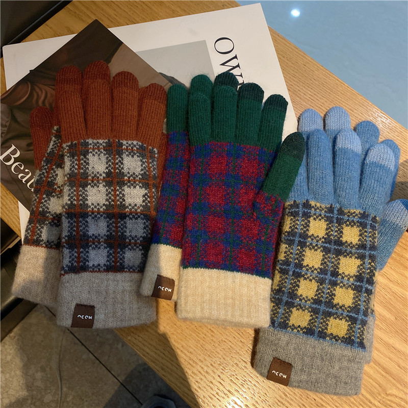 일본 명암 컬러 격자 무늬 터치 스크린 따뜻한 장갑 여성의 가을과 겨울 새로운 니트 기모 운전 모리 여학생스토어 가기