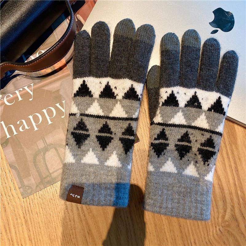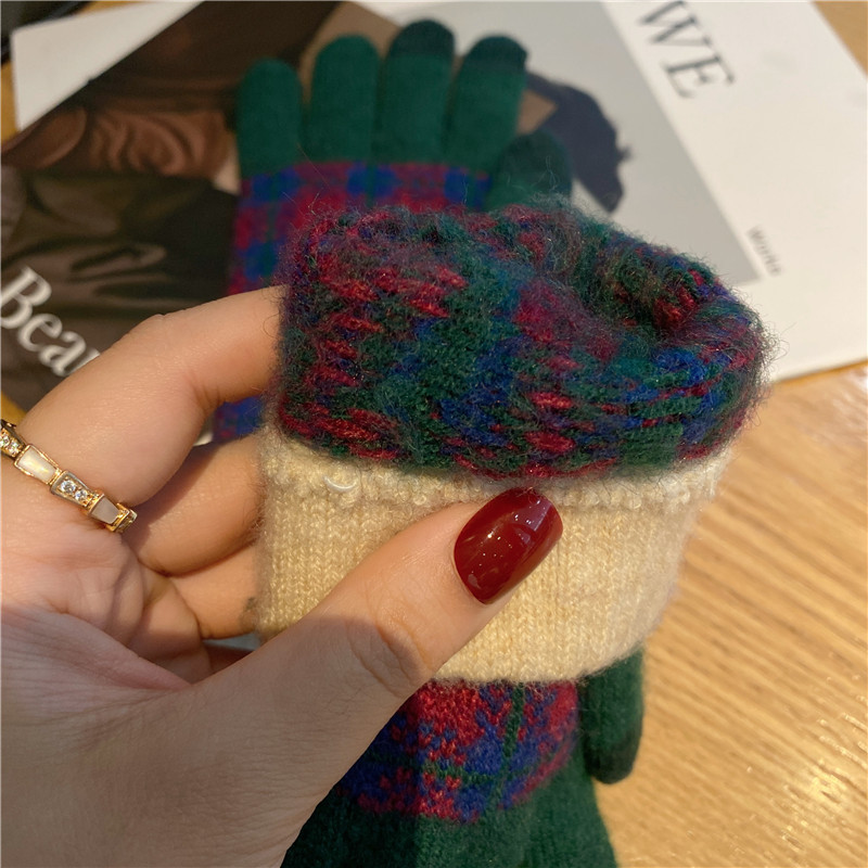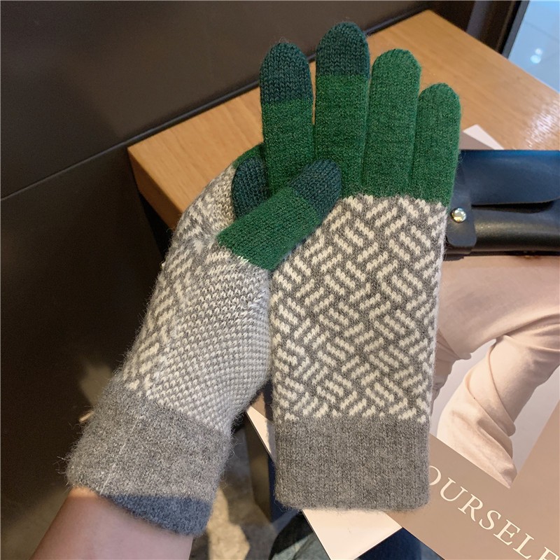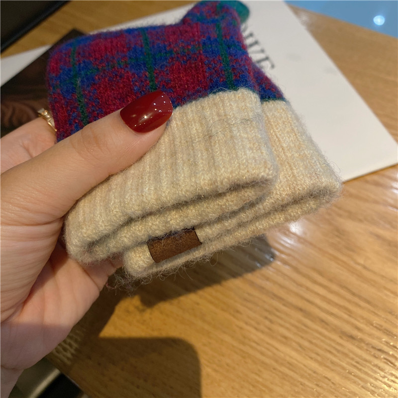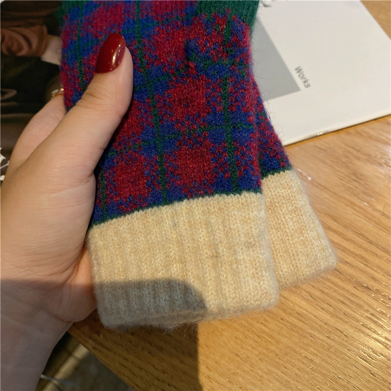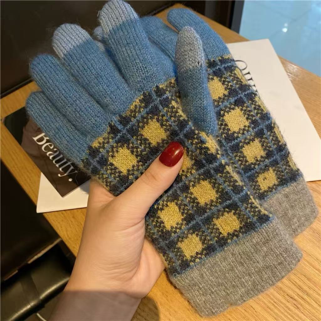 일본 명암 컬러 격자 무늬 터치 스크린 따뜻한 장갑 여성의 가을과 겨울 새로운 니트 기모 운전 모리 여학생스토어 가기
