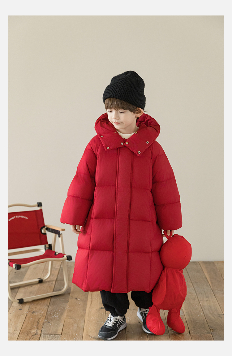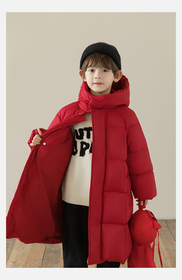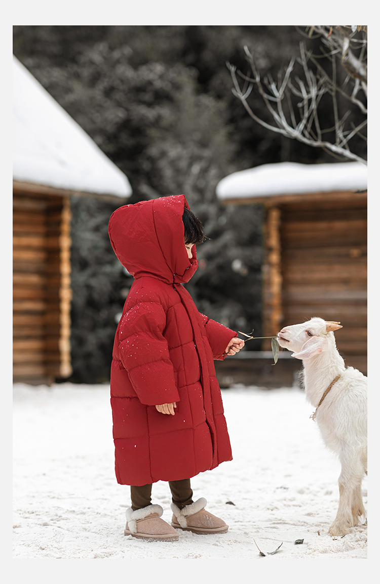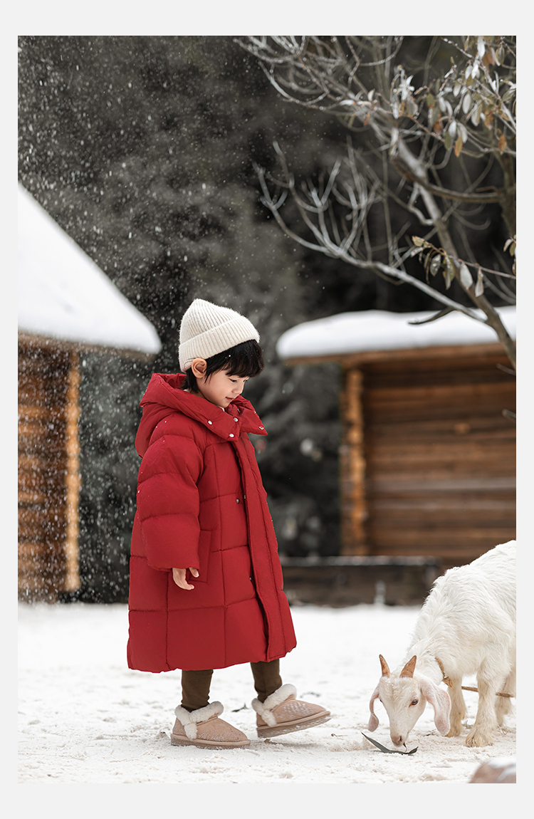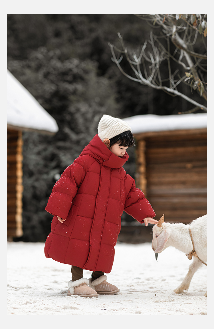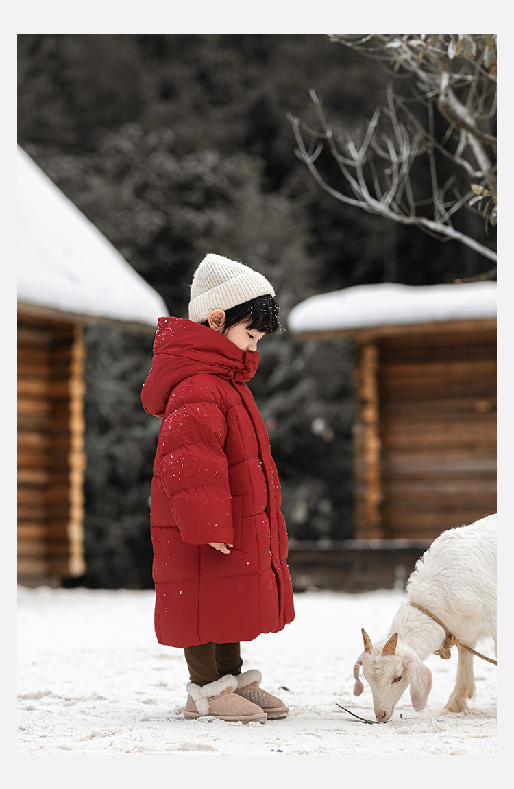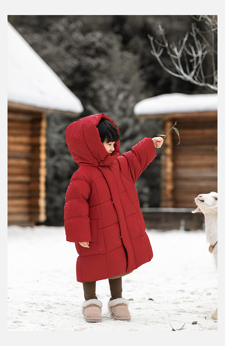 Wulibu Yinan 소년 다운 재킷 2025 신상 겨울 아동용 빨간색 중간 길이 후드 체크 무늬 두꺼운 재킷