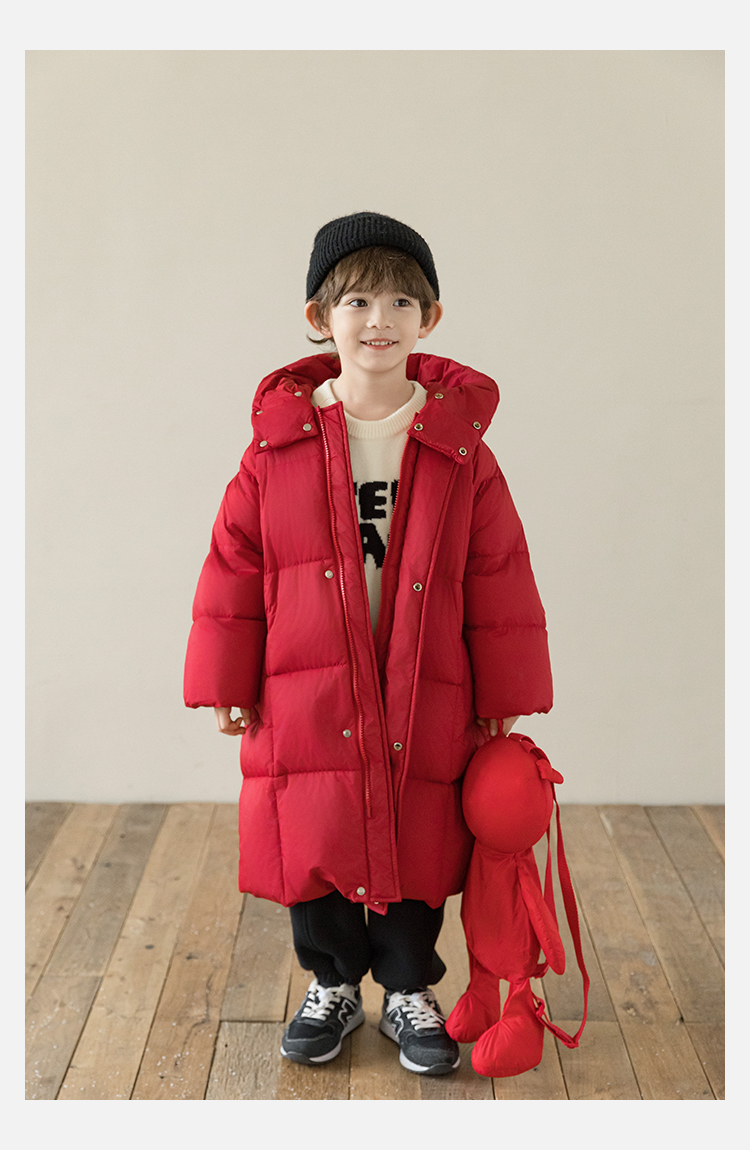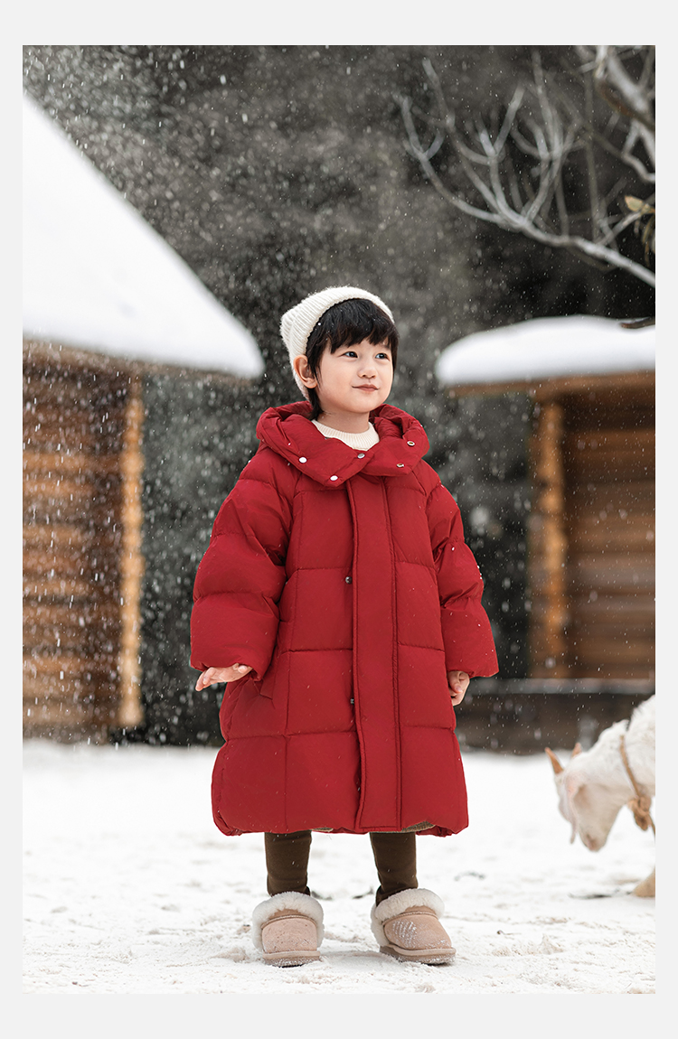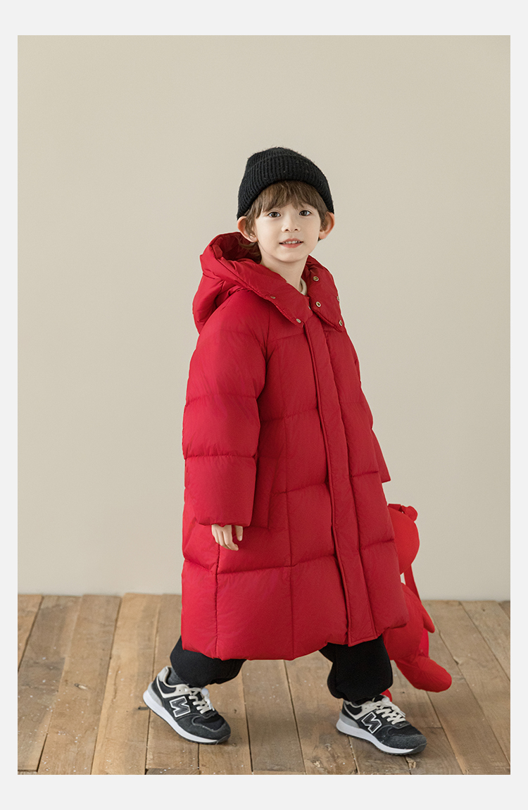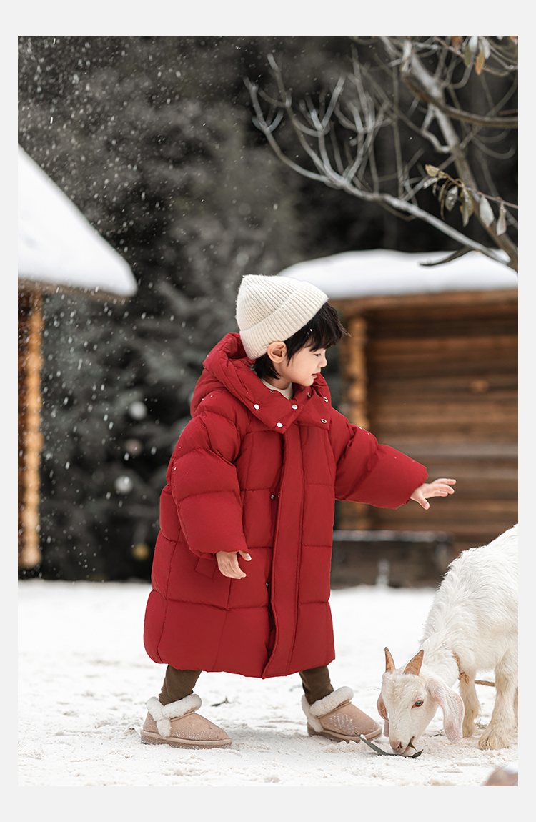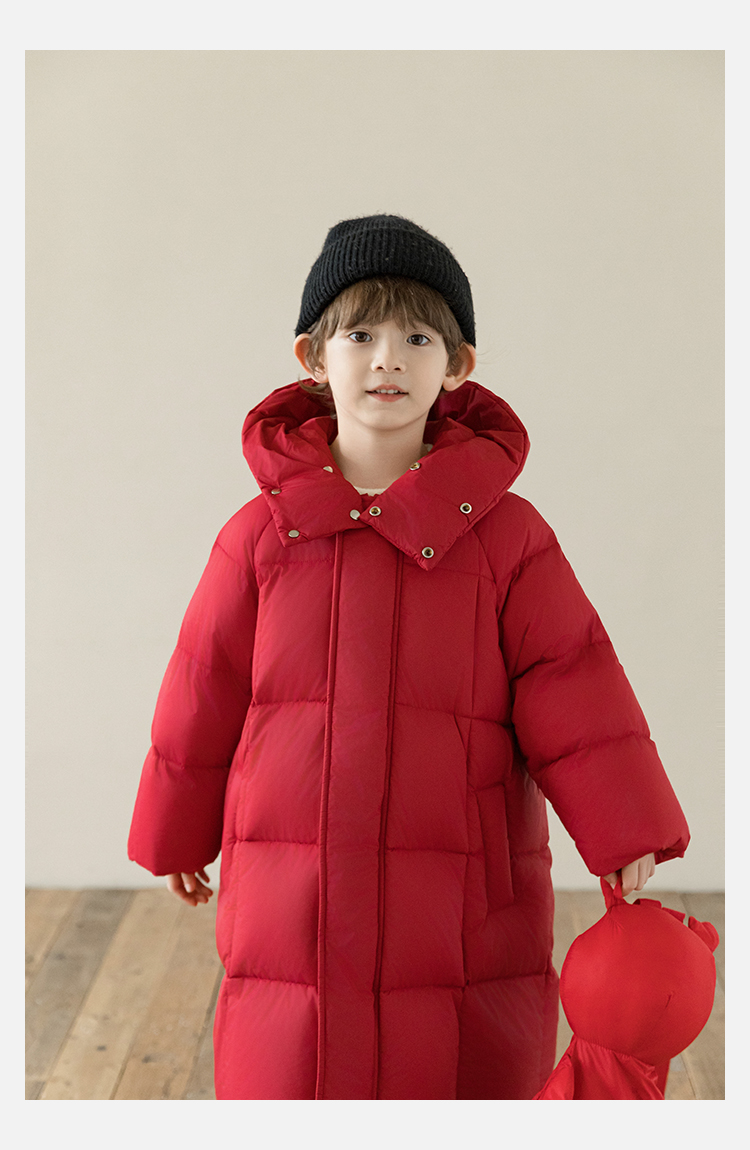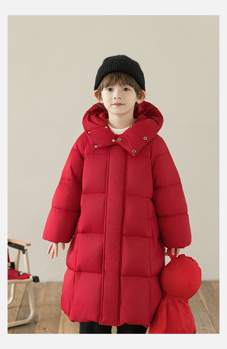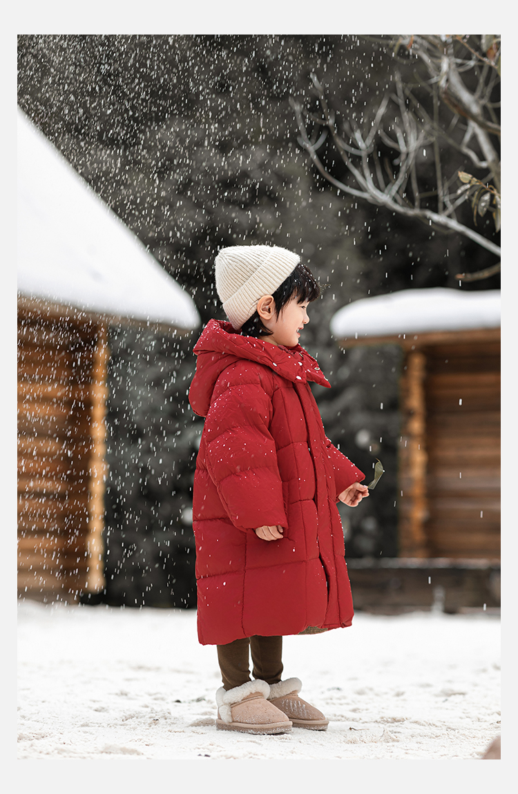 Wulibu Yinan 소년 다운 재킷 2025 신상 겨울 아동용 빨간색 중간 길이 후드 체크 무늬 두꺼운 재킷