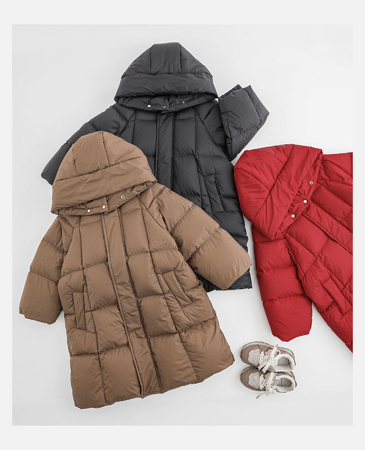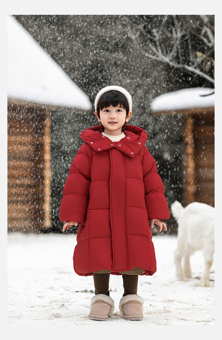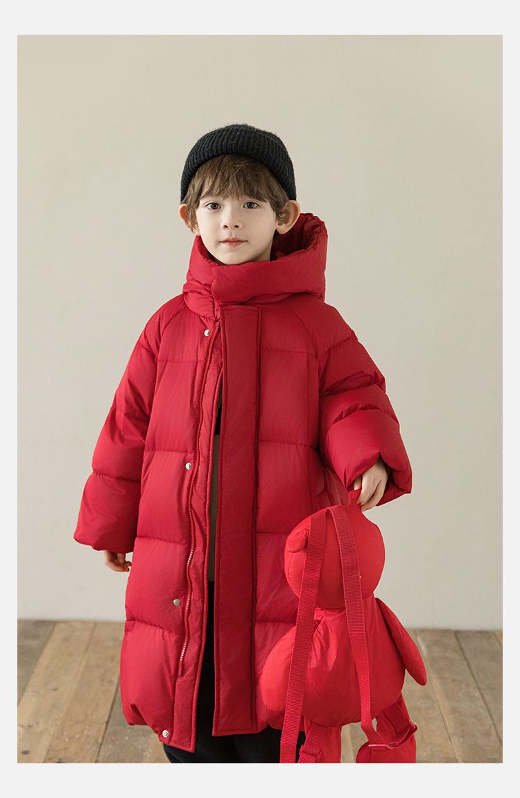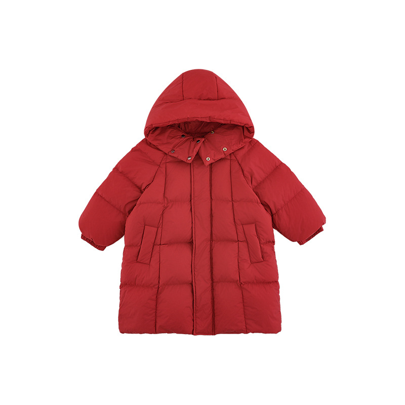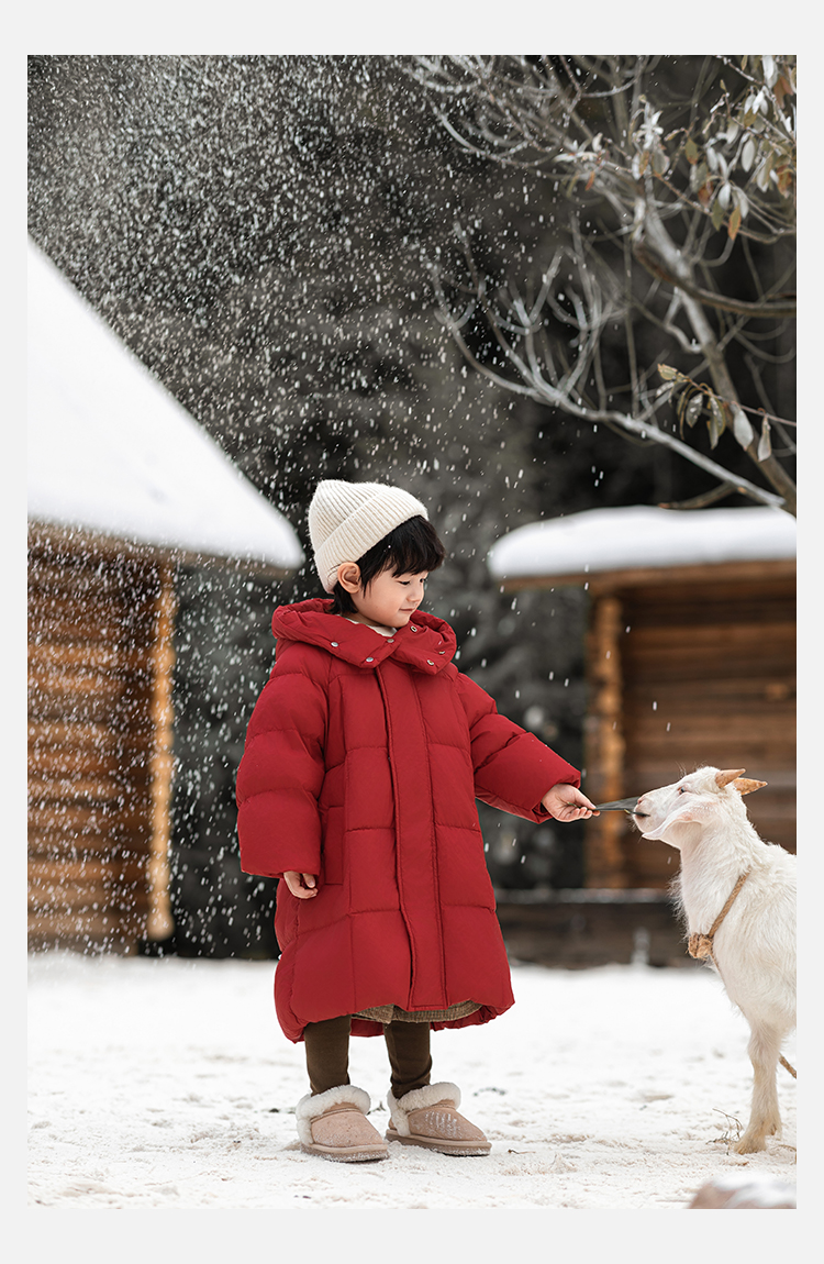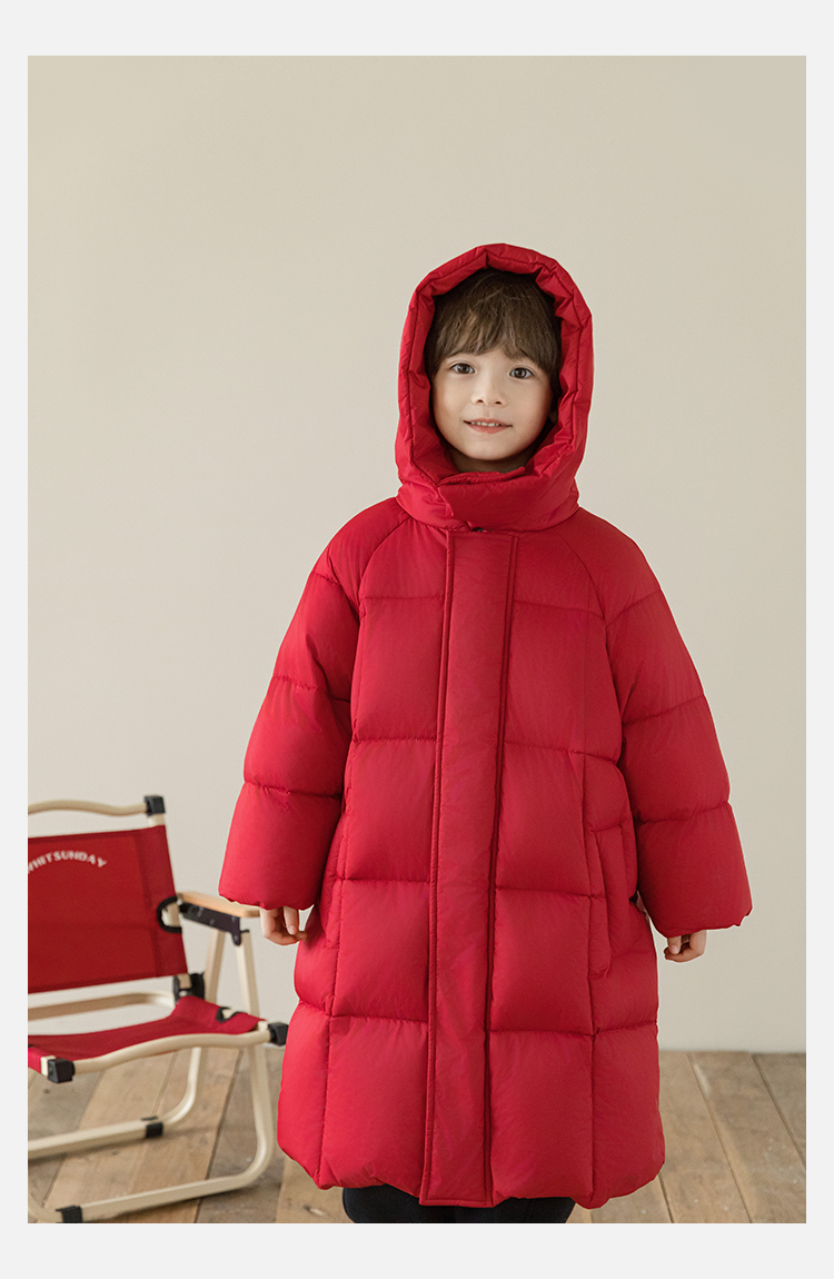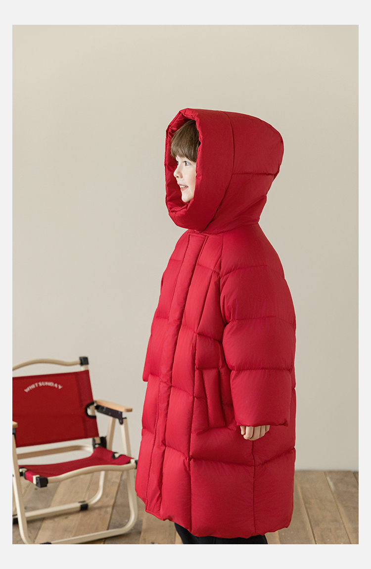 Wulibu Yinan 소년 다운 재킷 2025 신상 겨울 아동용 빨간색 중간 길이 후드 체크 무늬 두꺼운 재킷