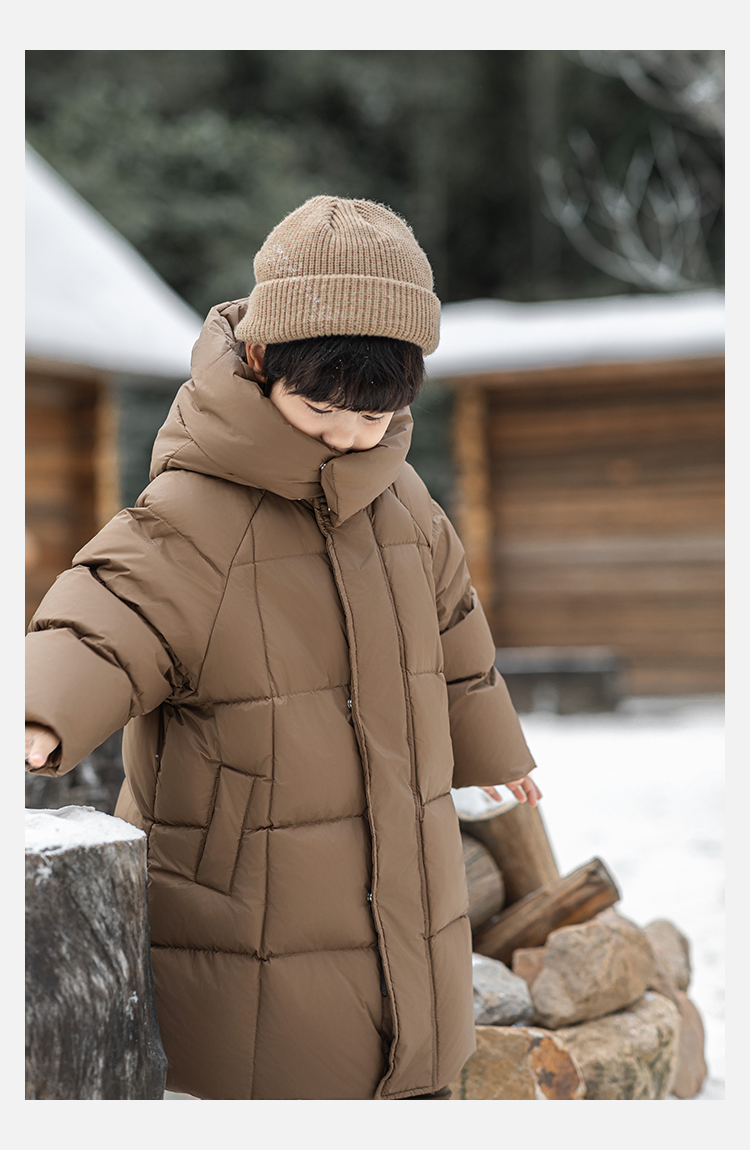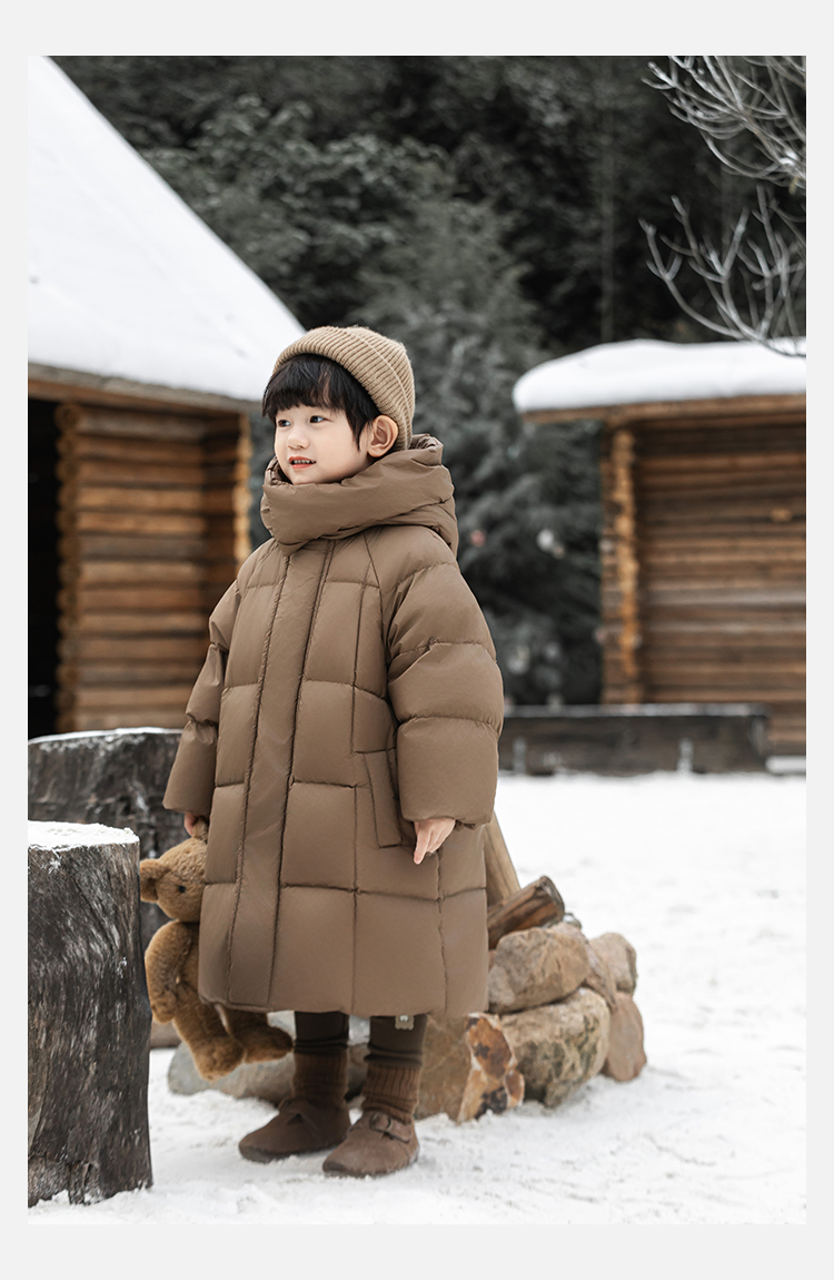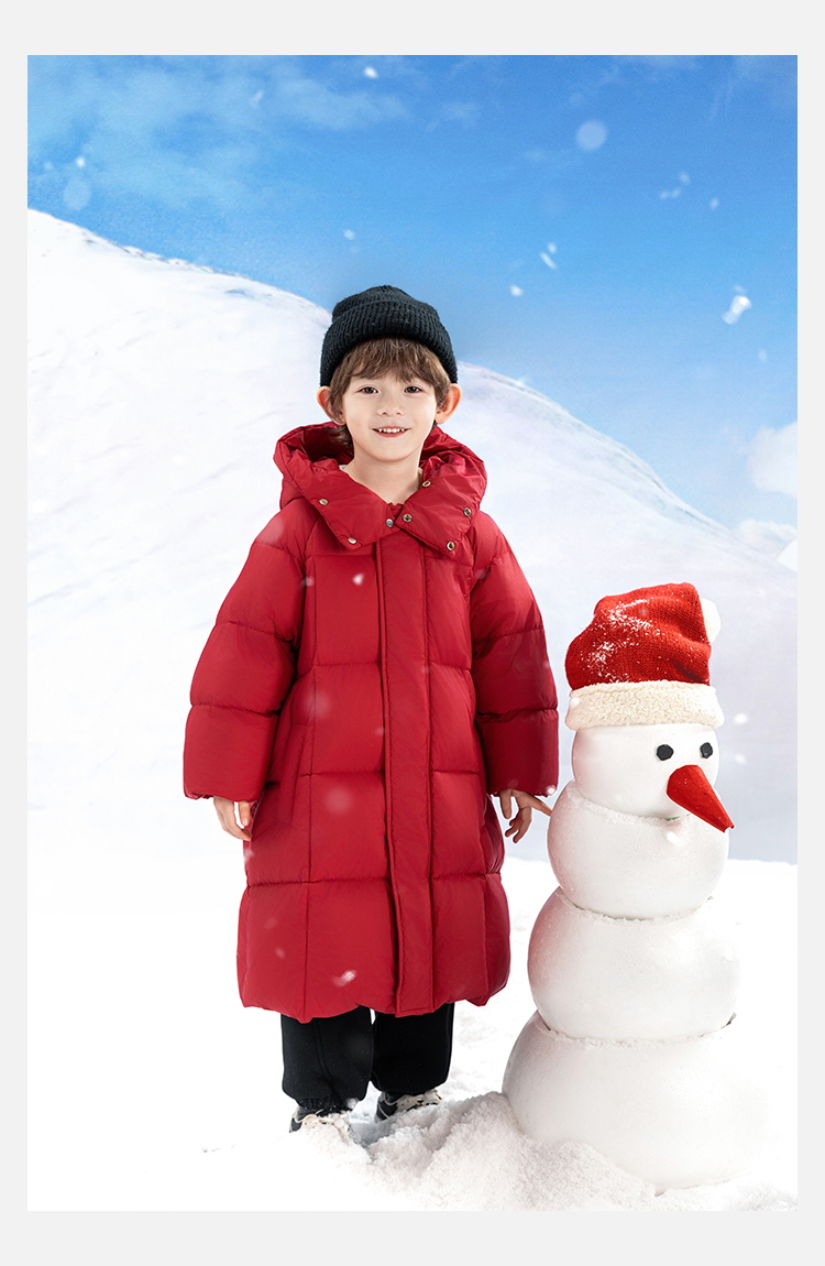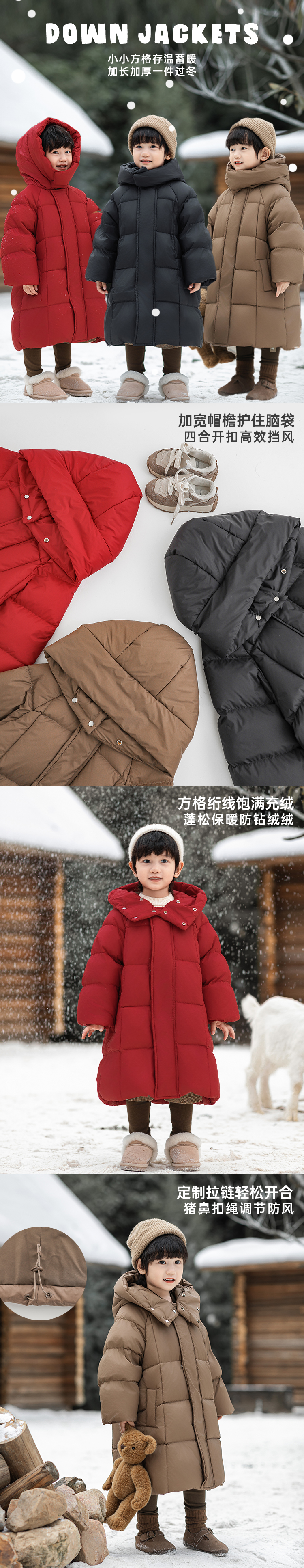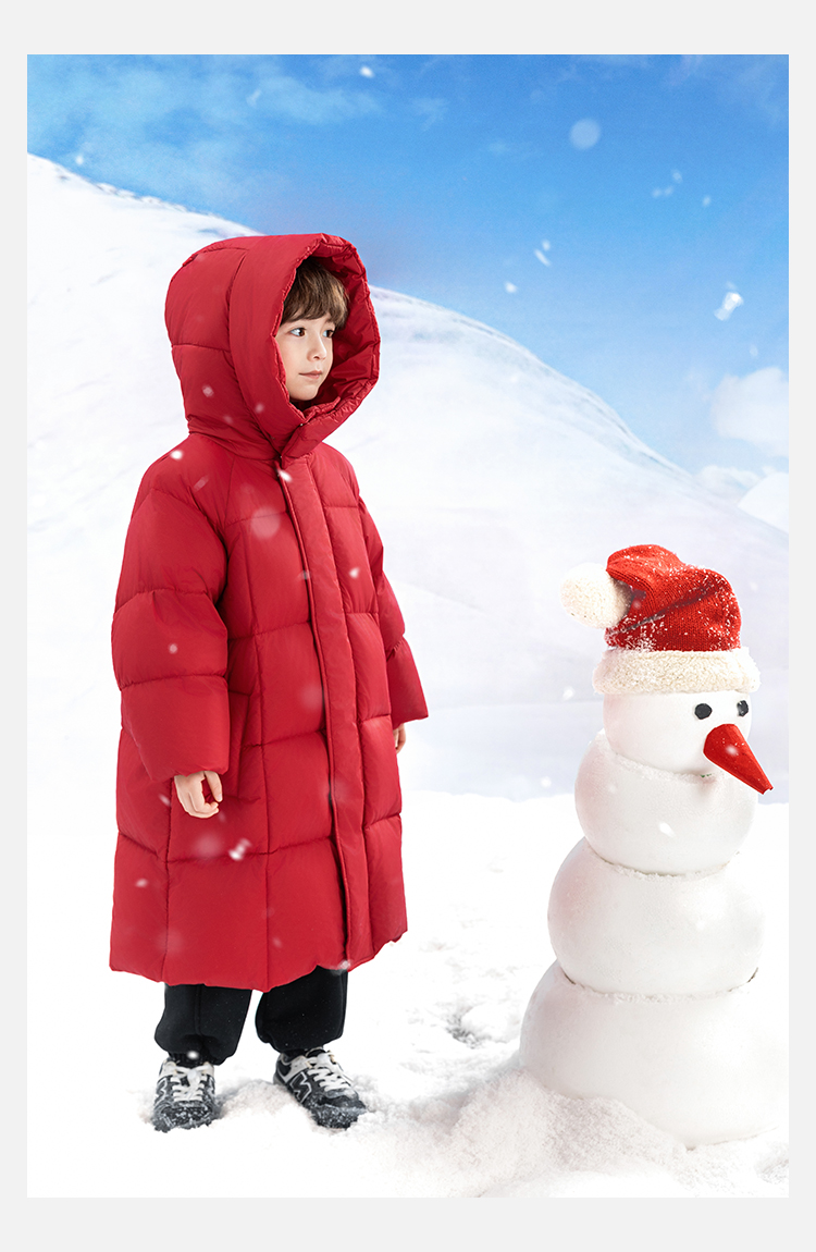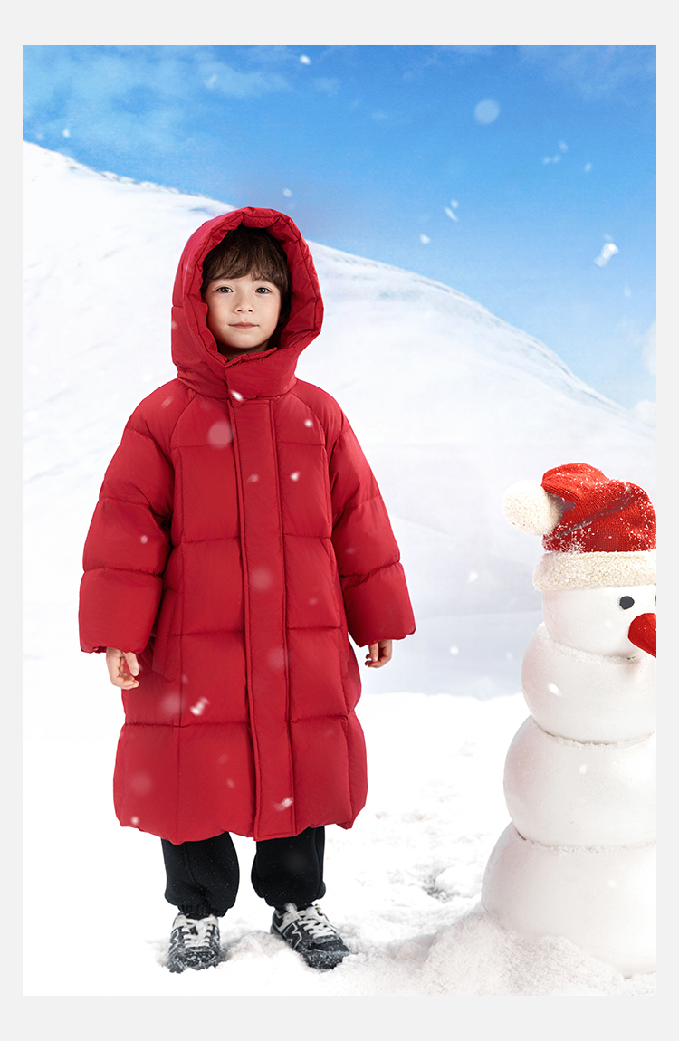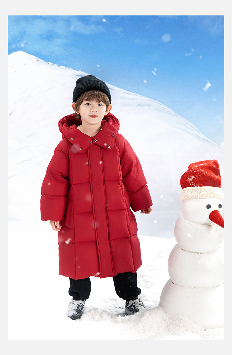 Wulibu Yinan 소년 다운 재킷 2025 신상 겨울 아동용 빨간색 중간 길이 후드 체크 무늬 두꺼운 재킷