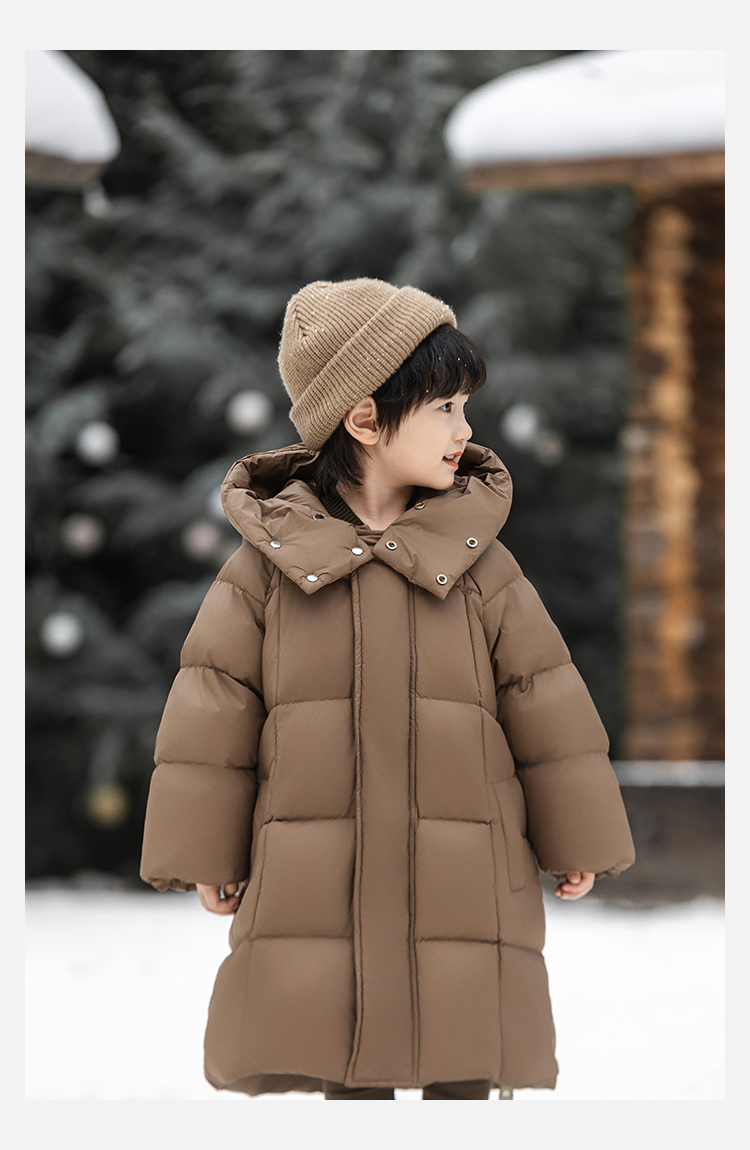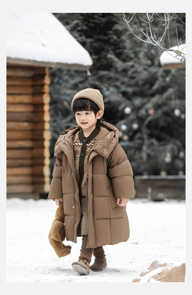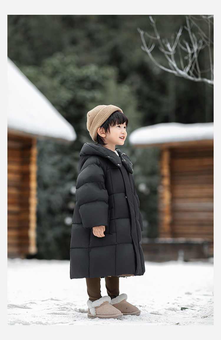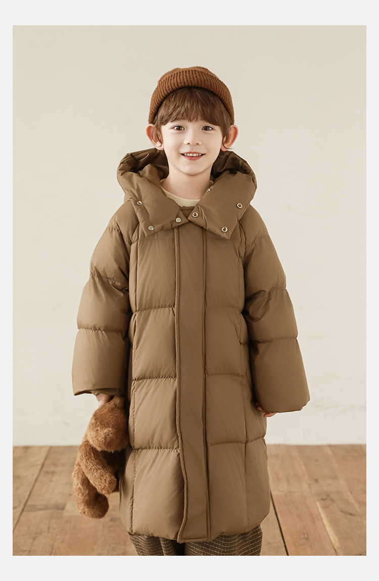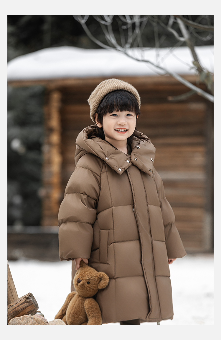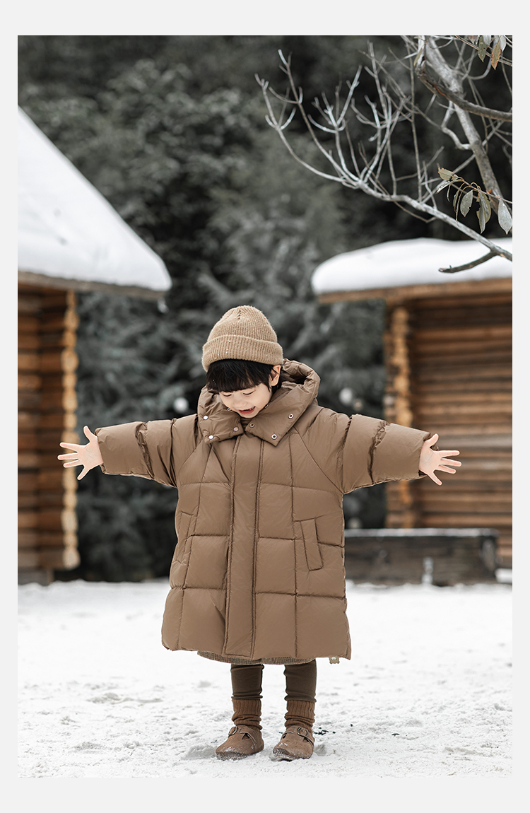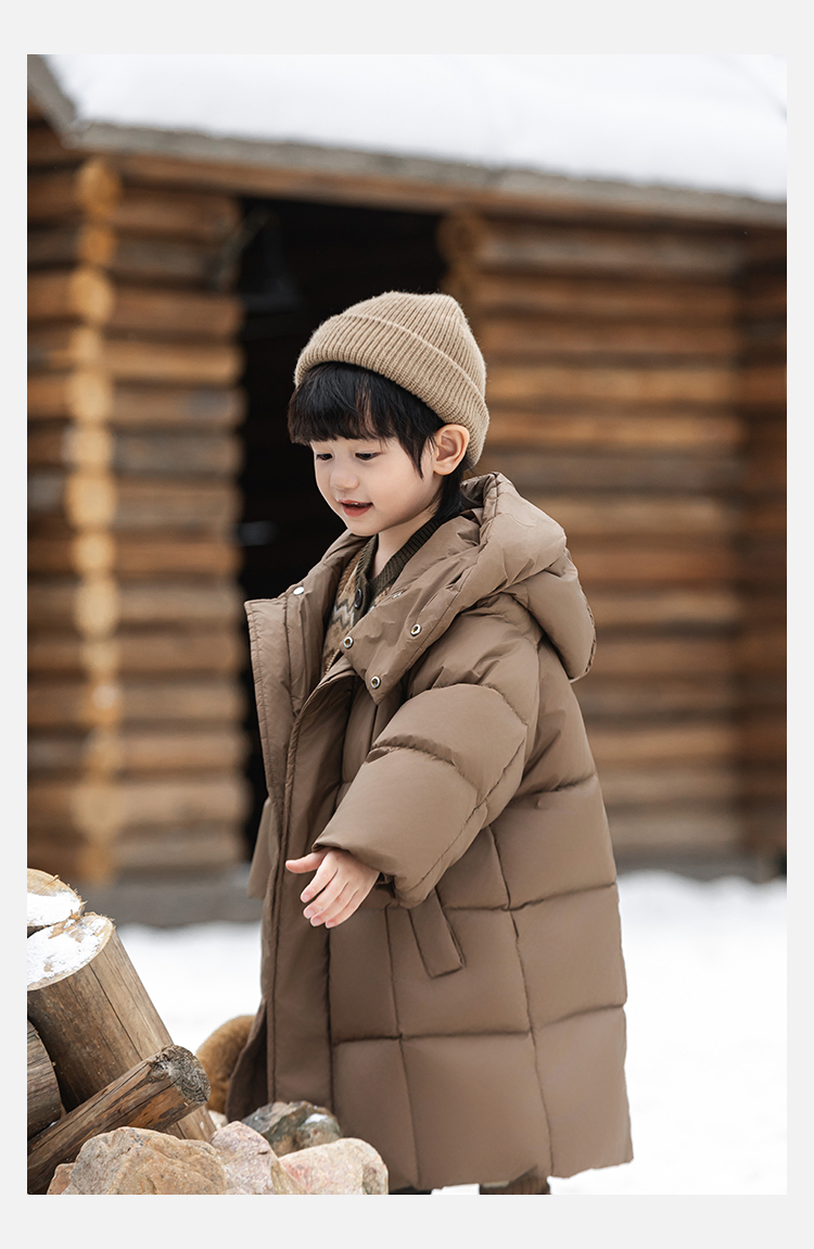 Wulibu Yinan 소년 다운 재킷 2025 신상 겨울 아동용 빨간색 중간 길이 후드 체크 무늬 두꺼운 재킷