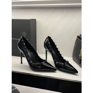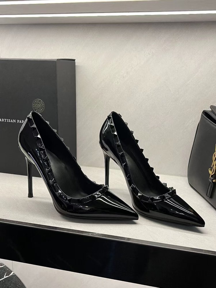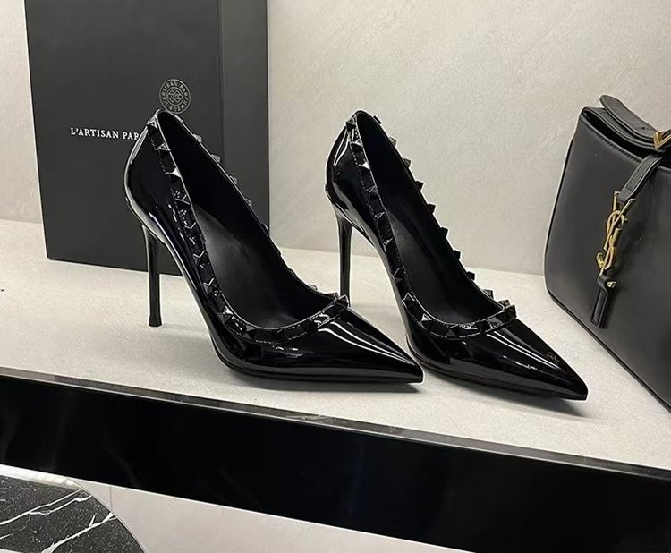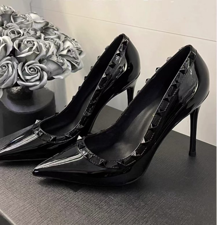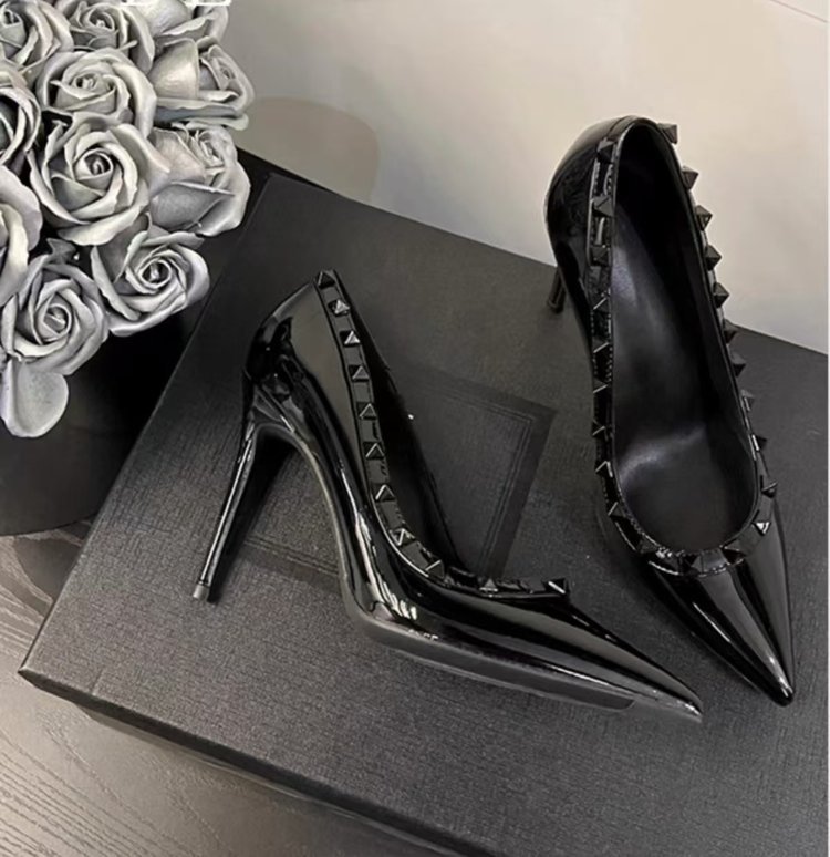 블랙 하이힐 여성 2024 새로운 올 매치 프렌치 스타일 아름다운 포인팅 슈즈 리벳 얕은 스틸 레토 우아한 싱글 레이어 슈즈스토어 가기