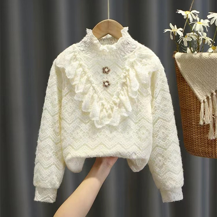 소녀 기모 두꺼운 베이스 셔츠 2023 겨울 새로운 아기 프랑스 레이스 스타일 반 높이 칼라 탑