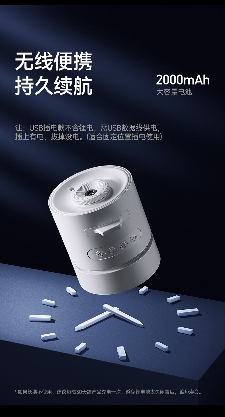 内置电池:2000mAh / 18650 /3.7V,充电红灯3H充满绿灯,投影灯使用时长约5小时。蓝牙使用时长4:30分,投影和蓝牙同时使用时长3H内