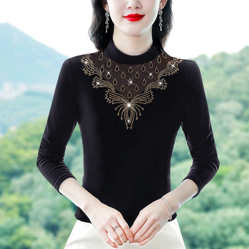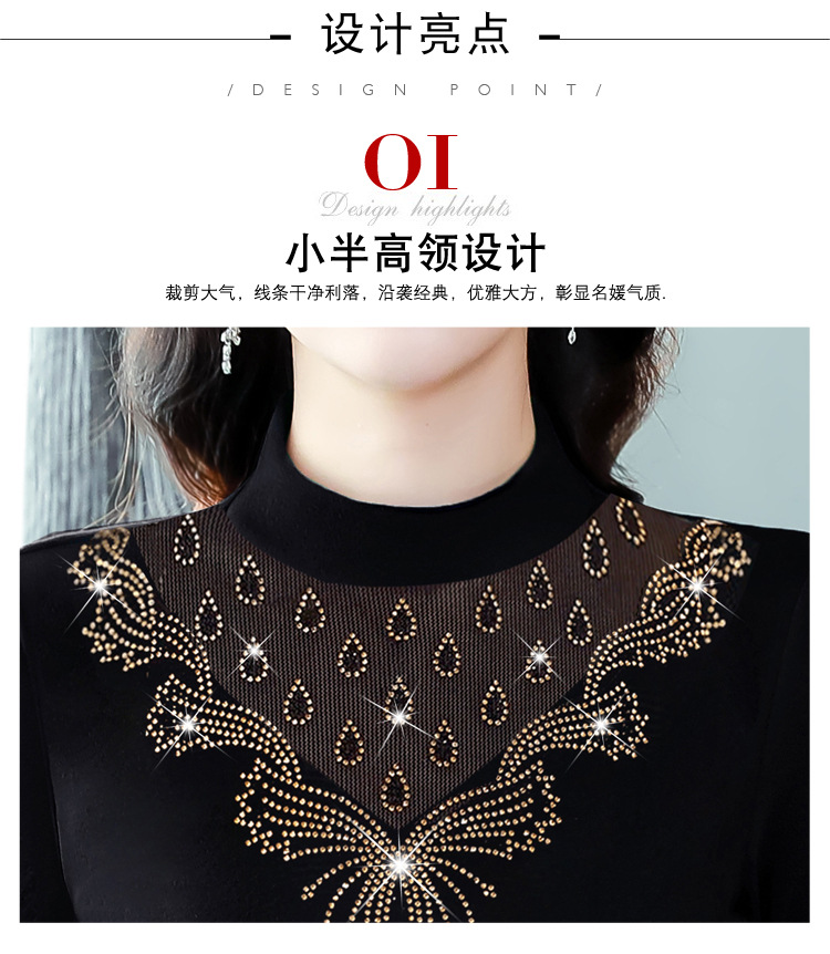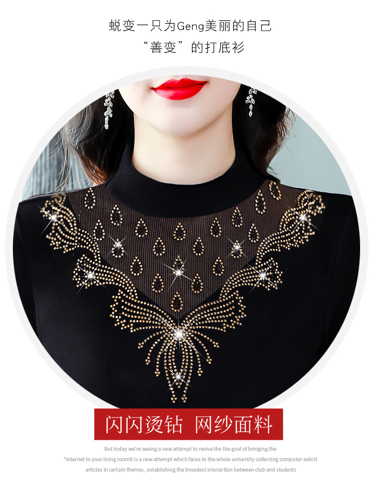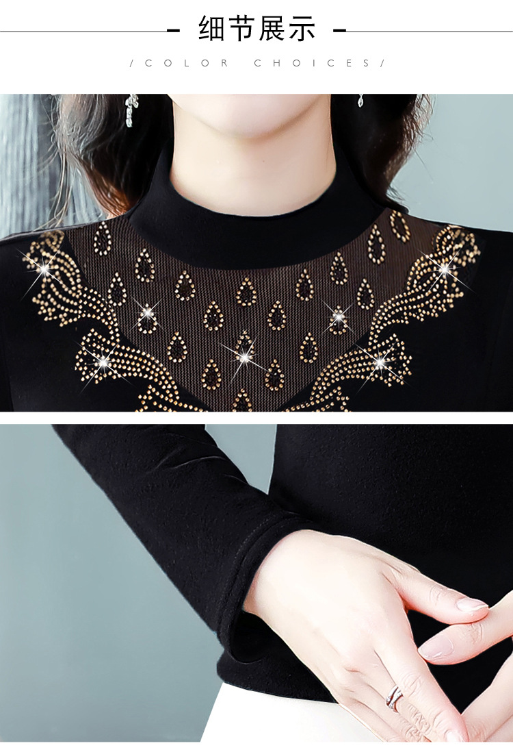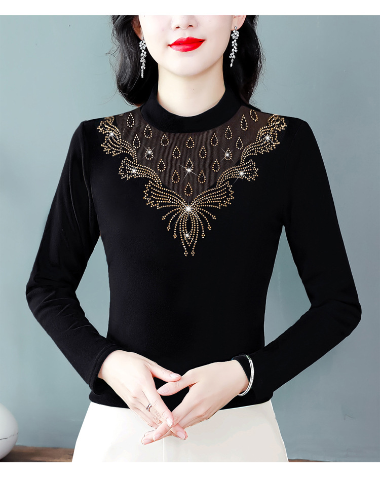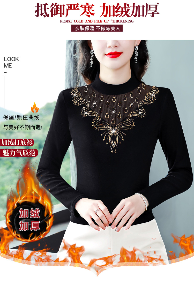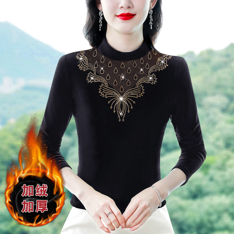 패션 다재다능한 반 높이 칼라 여성의 긴 소매베이스 셔츠 어머니 가을과 겨울 새로운 기모 두꺼운 블랙 핫 드릴링 탑