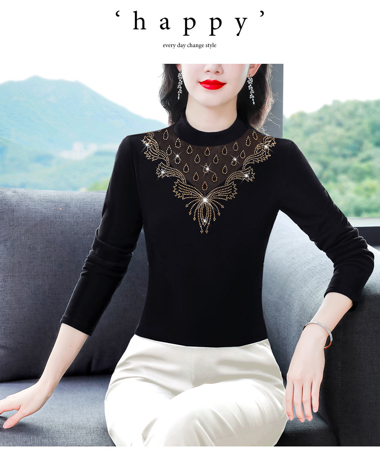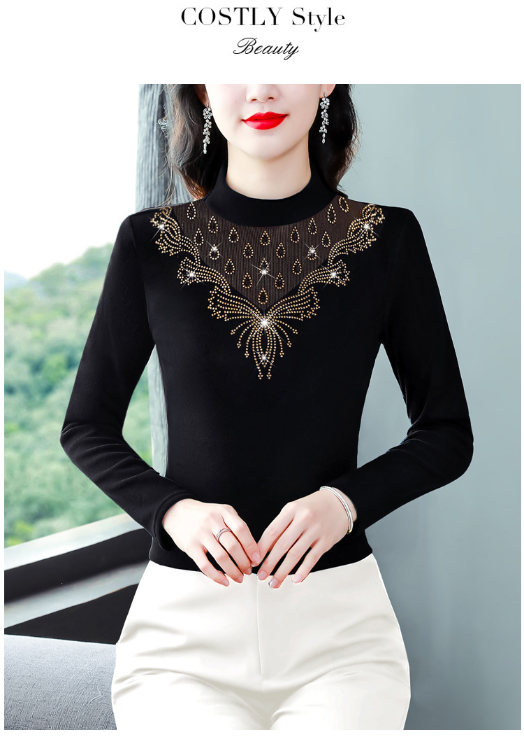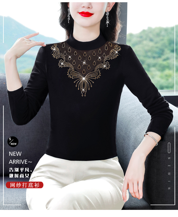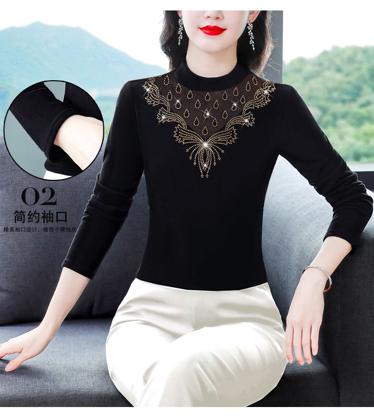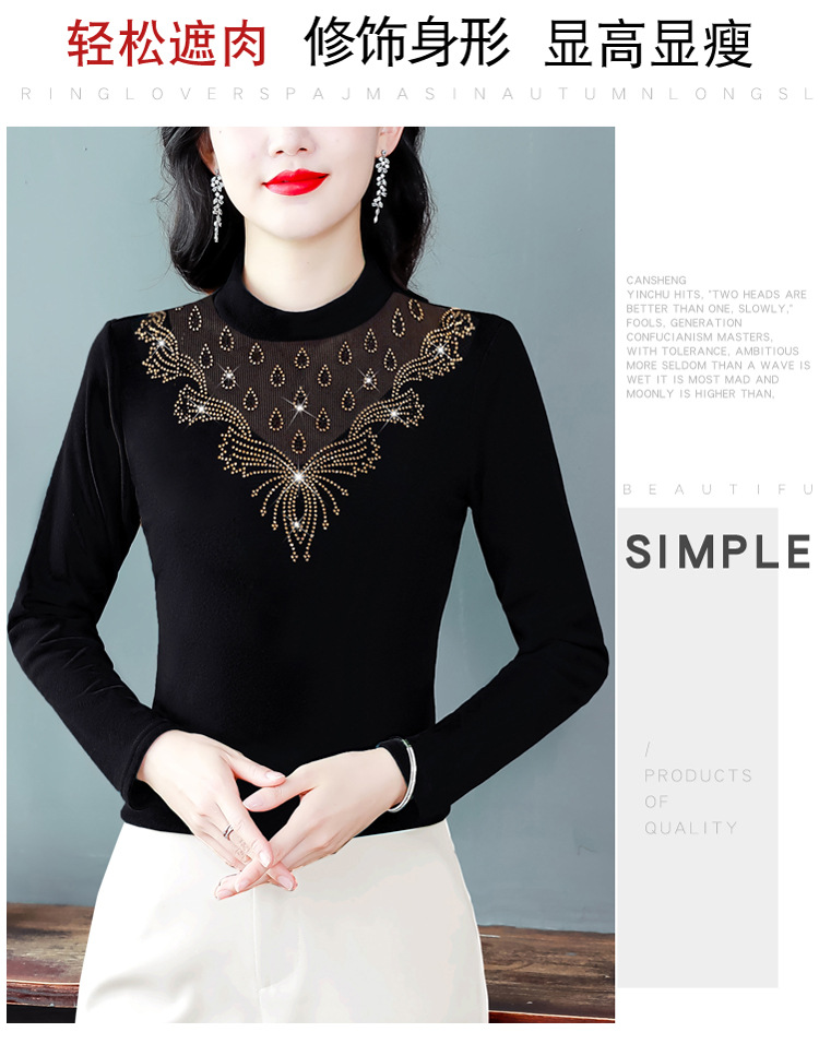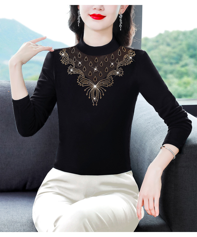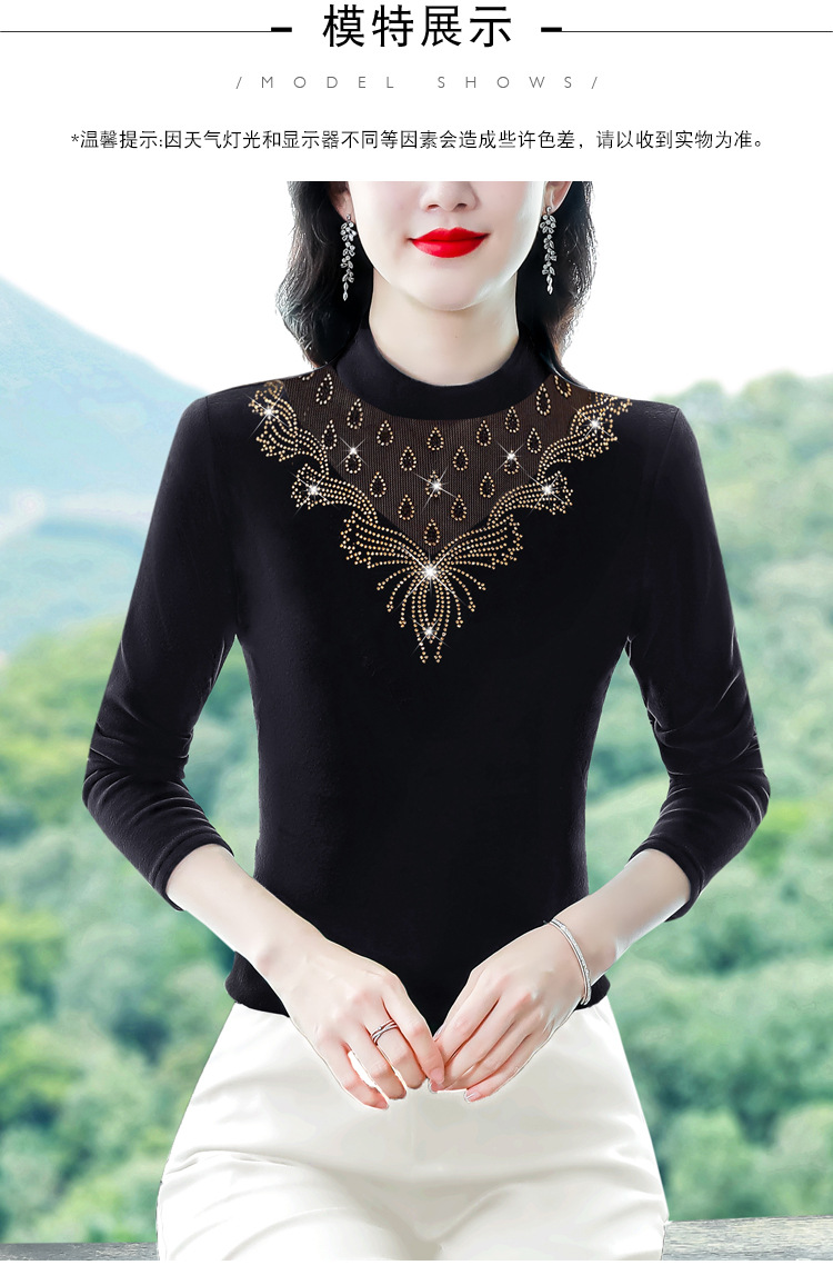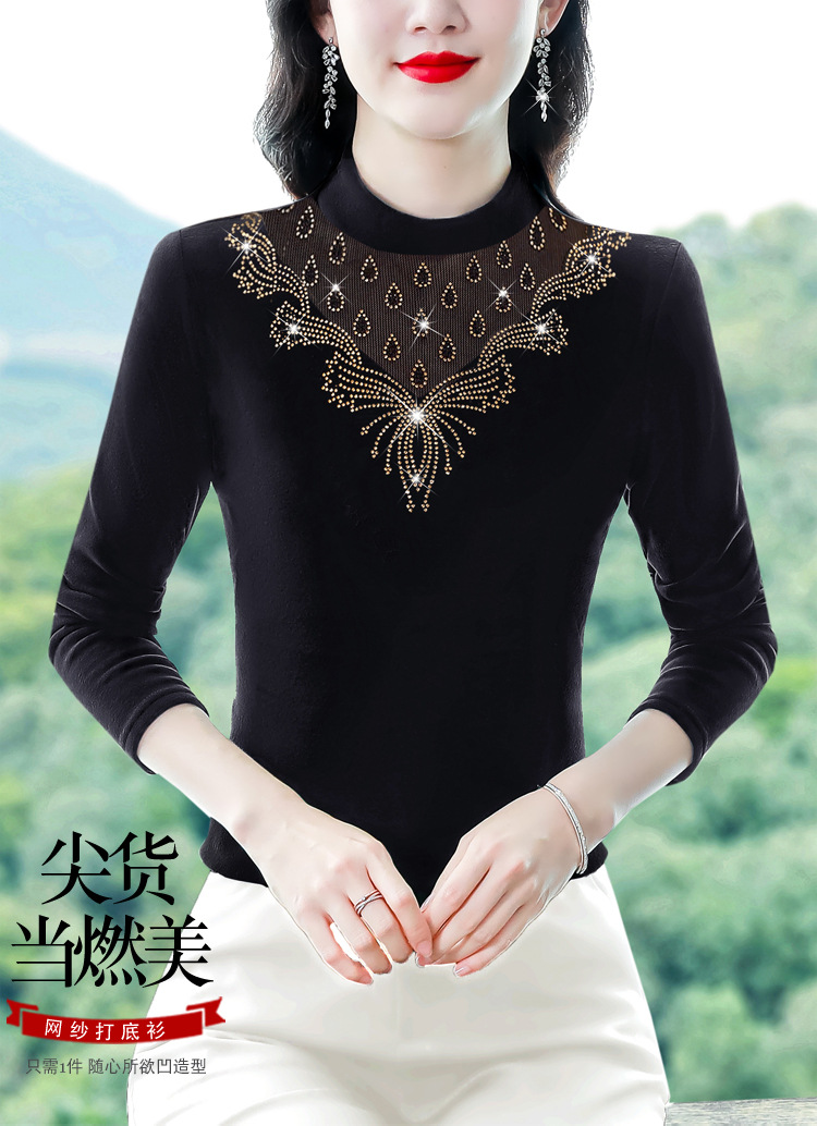 패션 다재다능한 반 높이 칼라 여성의 긴 소매베이스 셔츠 어머니 가을과 겨울 새로운 기모 두꺼운 블랙 핫 드릴링 탑