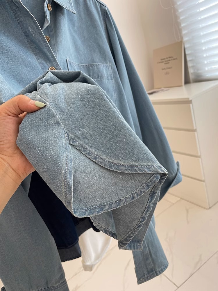 2 색 데님 셔츠 여성의 음영! 가을과 겨울 빈티지 올 매치 슬림 핏 레이업 긴 소매 셔츠 캐주얼 자켓스토어 가기