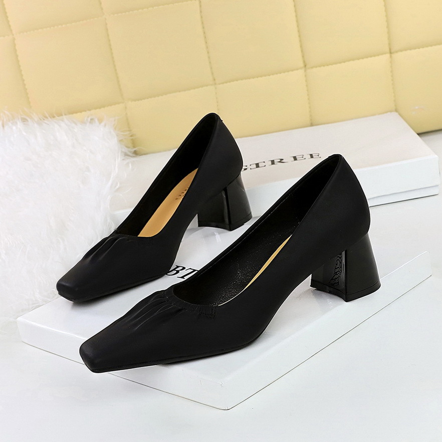 5288-13 복고풍 한국어 버전의 주름진 신발 입 사각 머리 얕은 입 두꺼운 뒤꿈치 봄과 가을 조커 통근 여성 신발 신발스토어 가기