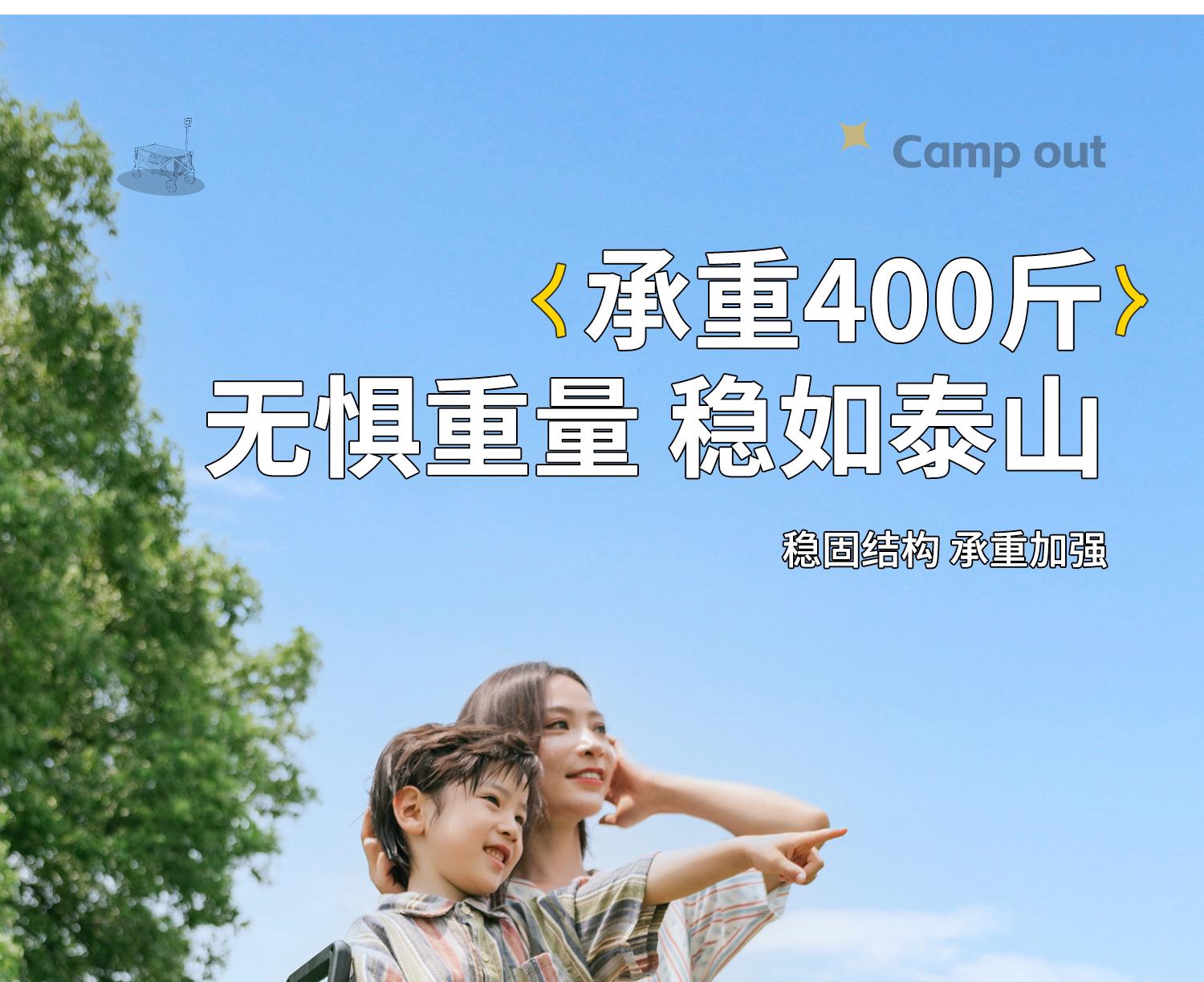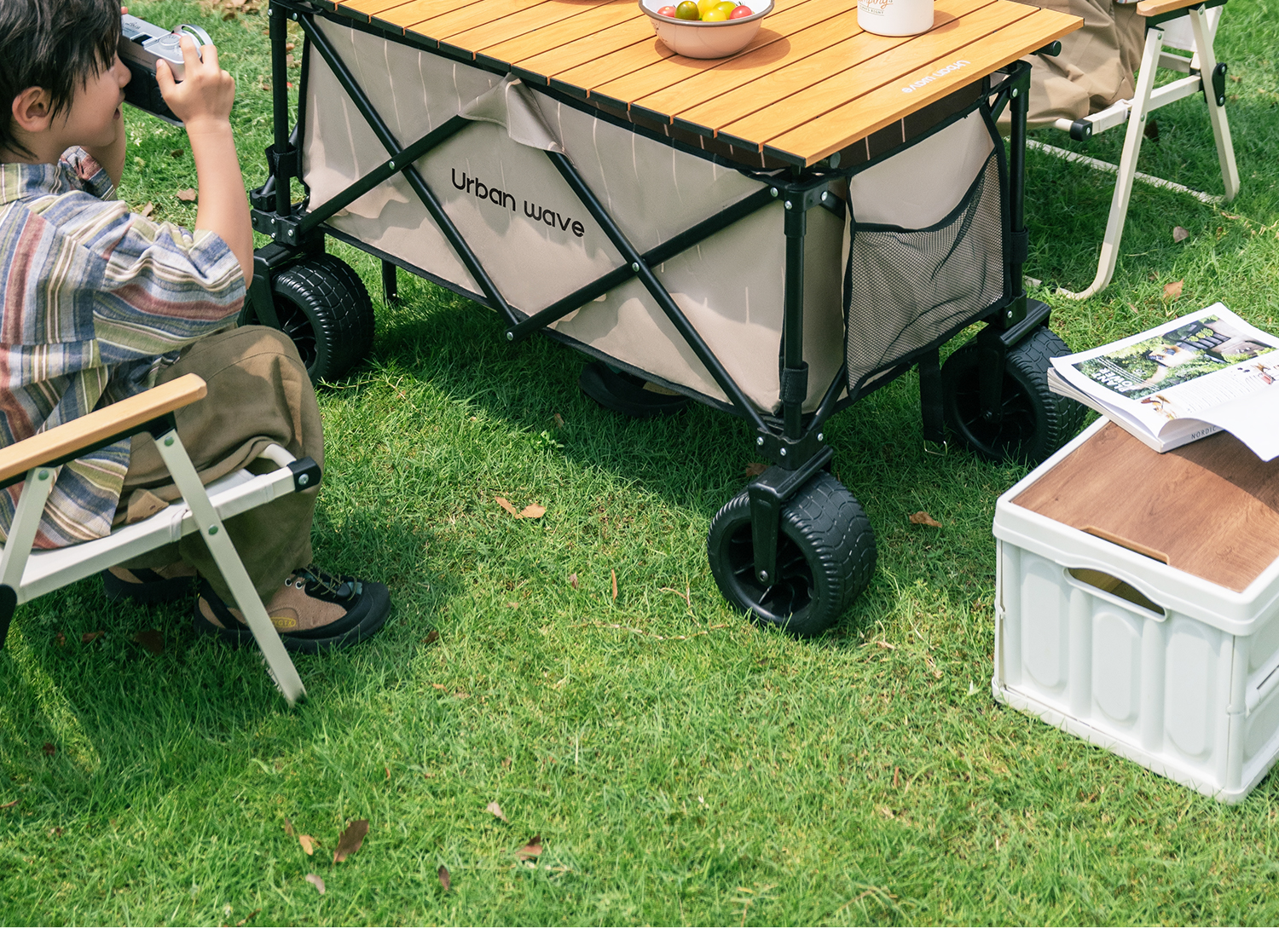 • 캠핑 패키지: 대형 충격 흡수 휠 카키색 + 나뭇결 전체 스틸 테이블 + 의자 * 2♢